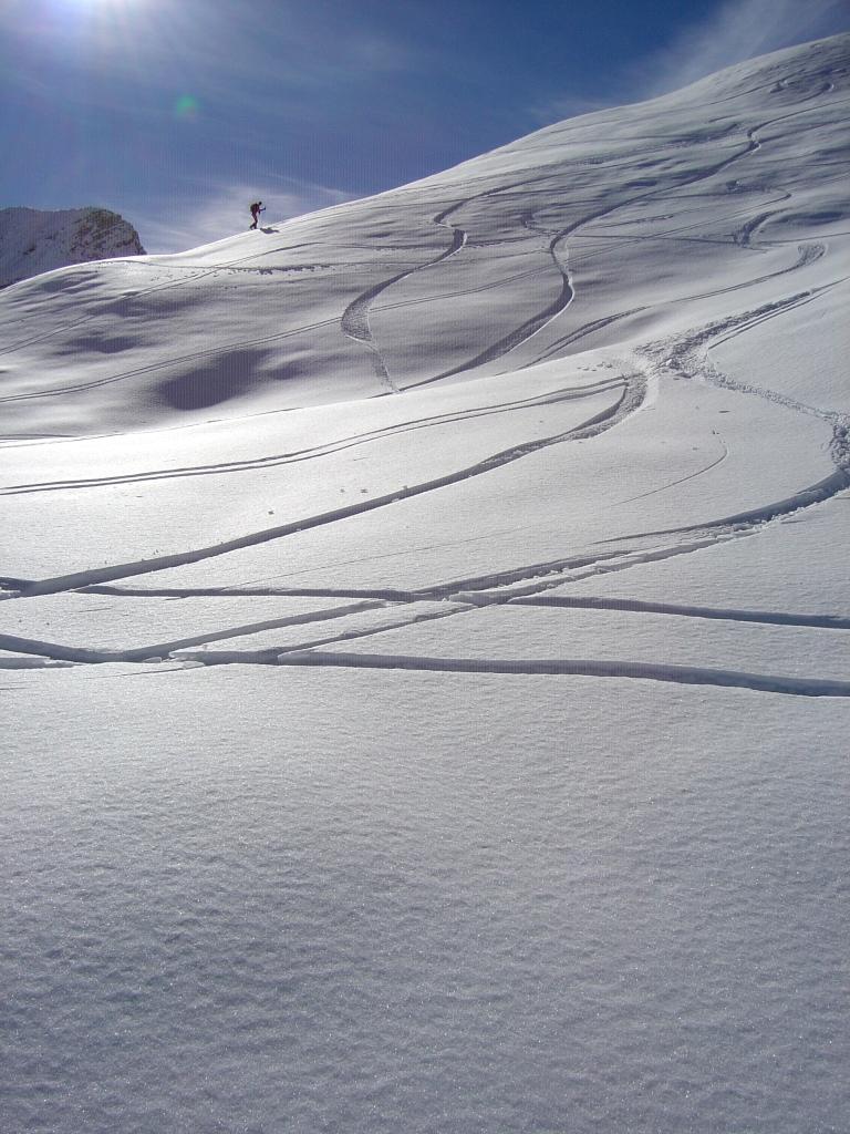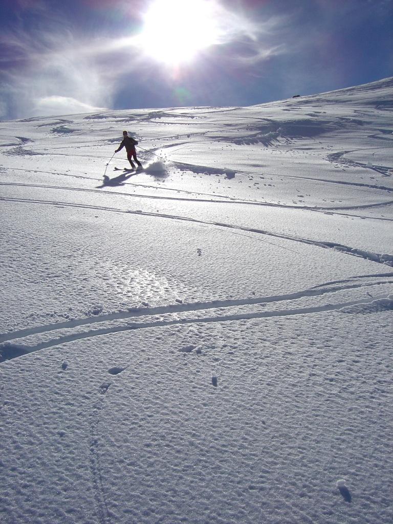 Debutto della stagione in Val d’Ubaye. C’è meno neve che sui versanti italiani ma si riesce ancora a partire tranquillamente sci ai piedi anche se durerà poco. Bellissima giornata, percorso tutto tracciato con una quarantina di persone. In discesa nella parte alta del percorso ci siamo tenuti nelle zone più in ombra dove la neve si presenta con una leggera crosta superficiale ma per nulla fastidiosa. Qualche pietra comincia ad affiorare. Da metà percorso in giù la neve migliora fino a diventare trasformata e quindi molto divertente.