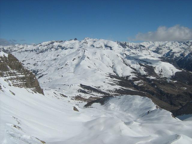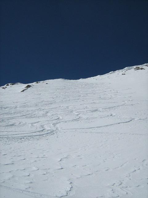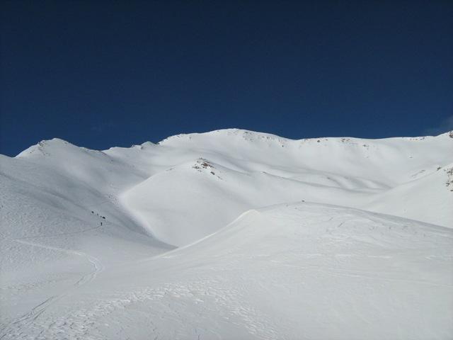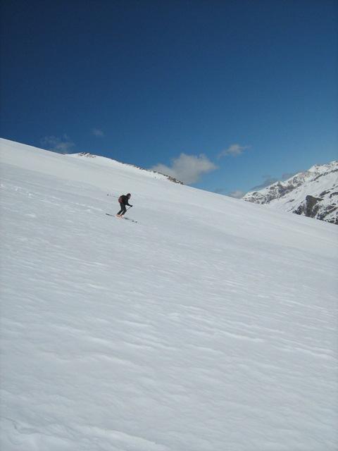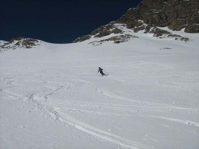 Vedendo scendere un gruppo di francesi, che sono scesi tenendosi tutti a sinistra, abbiamo deciso di seguirli visto che in salita abbiamo trovato parecchia crosta. Ottima scelta!!! Dalla cima e fino ai 2.600 metri circa alternanza di farina e crosta non portante, con prevalenza di quest’ultima, ma cmq abbastanza sciabile. Poi con un lungo traverso verso sinistra ci siamo portati sotto la fascia rocciosa della Barre de la Pisse e da qui abbiamo sempre tenuto le esposizioni Est, trovando neve quasi perfettamente trasformata fino praticamente all’auto…davvero una piacevolissima sorpresa e un’ottima sciata!!!