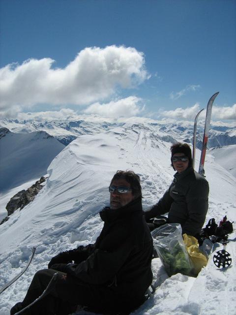 Partenza dall’ultimo tornante prima del Colle intorno alle 8.15, c’era parecchia gente e quindi la salita è interamente tracciata e si svolge in gran parte sulla dx orografica dell’ampio vallone. Si arriva in cima con gli sci ai piedi, ma bisogna fare un po’ di attenzione ad un brevissimo tratto di pochi metri proprio all’uscita sulla crestina finale in quanto la neve è dura e liscia e si rischia di scivolare. Abbiamo raggiunto la cima verso le 11 e così, vista l’ora, ci siamo goduti il panorama e la temperatura piacevolissima iniziando la discesa alle 12.