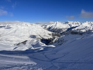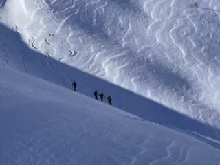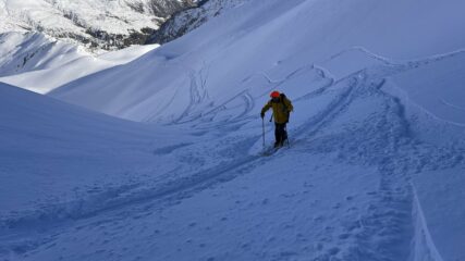 10 cm di neve recente , farinosa , in basso , che diventano 20 cm in alto . Meteo molto bello , il vallone è intonso e bellissimo una buona traccia ci permette di salire rapidamente più in quota ! I più veloci , partiti presto , scendono con belle curve , qualcuno ripella .