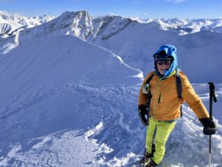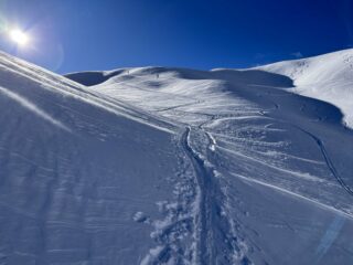 Un singolo sciatore di un gruppetto scendendo in una zona più aperta stacca un piccolo lastrone ma senza conseguenze . Io sono lento e alla fine raggiungo per ultimo il colle . Durante la salita il vento diventa forte , molto freddo ! Valuto la temperatura sotto i -10 con vento fastidioso . Roberto mi ha preceduto e raggiunge la dorsale di vetta , io mi fermo al colle ! La discesa sarebbe ancora bella , ma una leggera crosta da vento da fastidio in curva , più in basso nonostante le numerose tracce , neve leggera e divertente