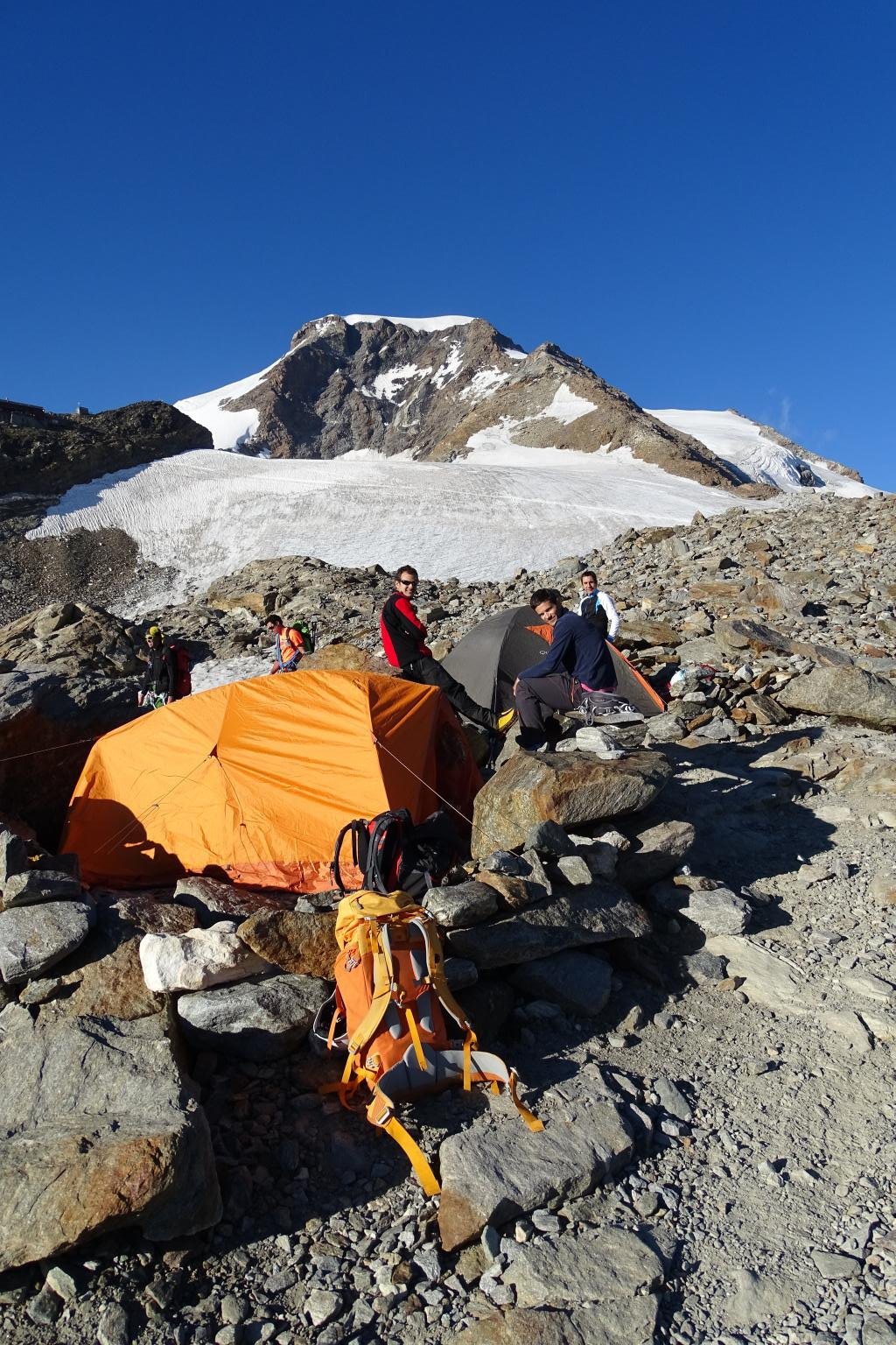 Saliti il giorno prima a piedi da Staffal per il Colle Salza, carichi come muli. Pernottato in tenda nei pressi del Mantova, ci sono alcune piazzole abbastanza comode. Alla sera il cielo coperto e qualche lampo all’orizzonte ci gettano un po’ nello sconforto però, dopo una notte insonne, ci alziamo alle 3 ed è tutto stellato. Partenza mezz’ora dopo, ottimo rigelo e ghiacciaio in buone condizioni, i crepi ci sono fino al Colle del Lys ma piccoli e superabili su ponti solidi. Alle roccette prima della dorsale abbiamo evitato il traverso ghiacciato a sinistra, salendo direttamente su roccia (facile), poi bella ed estetica cresta, più stretta salendo ma che si allarga in discesa dopo la non ben identificabile cima, raggiunta alle 7.45, con il primo sole a baciarci. Spettacolare il mare di nuvole sulla Valsesia. Dal Colle Sesia ci siamo poi ricongiunti all’itinerario normale per il Margherita.