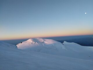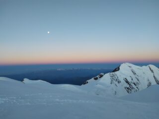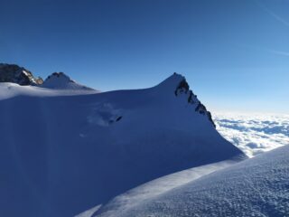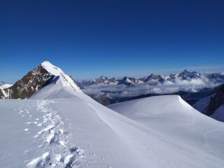 Cresta percorsa al contrario in quanto tornavamo dalla Punta Gnifetti dopo aver “dormito” alla Capanna Margherita. Abbiamo quindi risalito la EST e ridisceso la OVEST. Condizioni del ghiacciaio eccezionali, l’unico tratto su misto della OVEST (verso la fine della cresta lato Col del Lys) si supera senza difficoltà. Cresta aerea ma in ottime condizioni. Per le pendenze forse è consigliabile la traversata in questo senso, siccome la EST è molto più ripida ed esposta della OVEST.