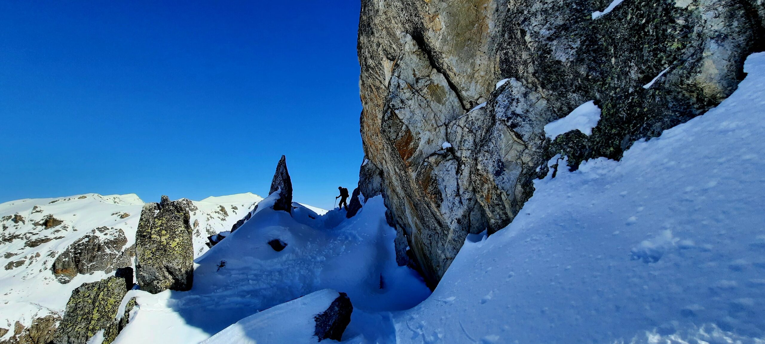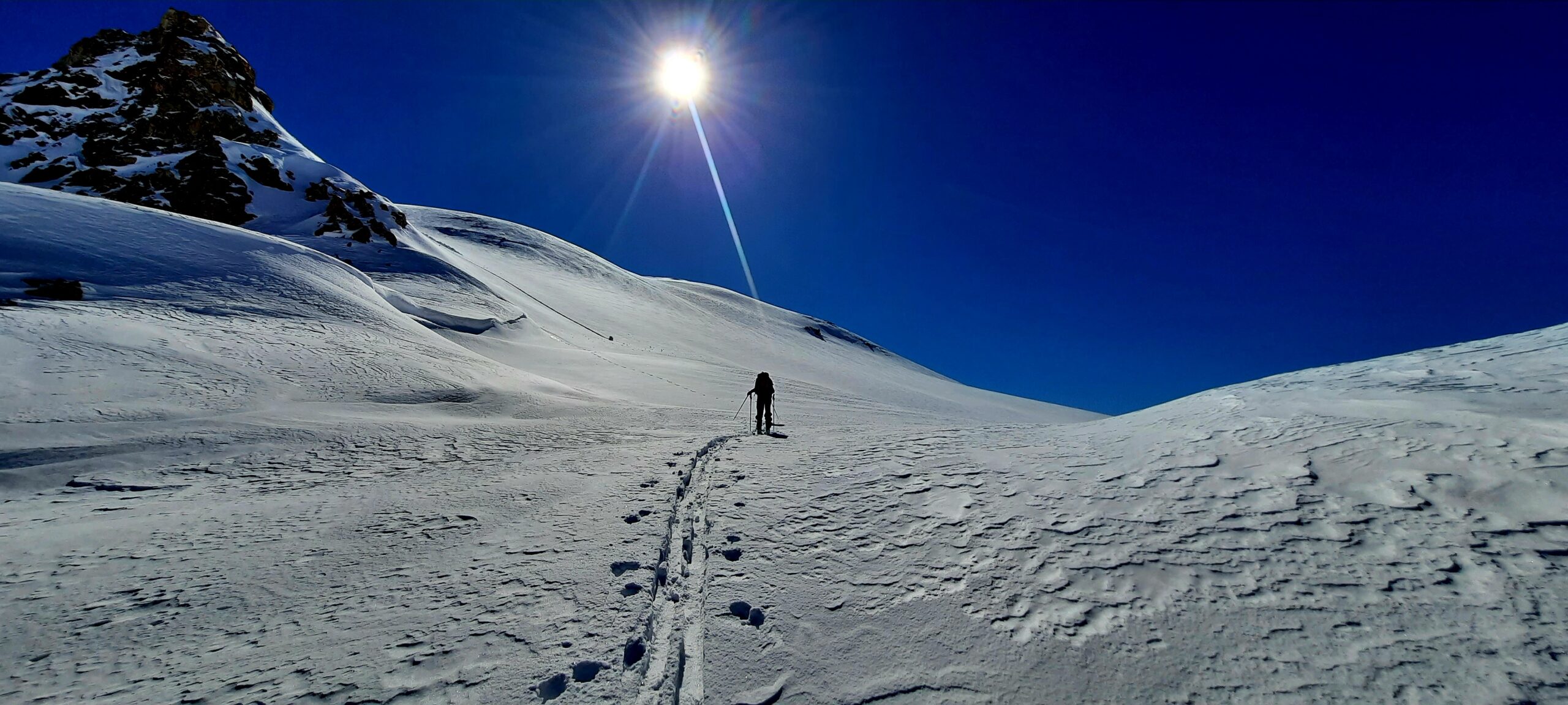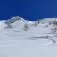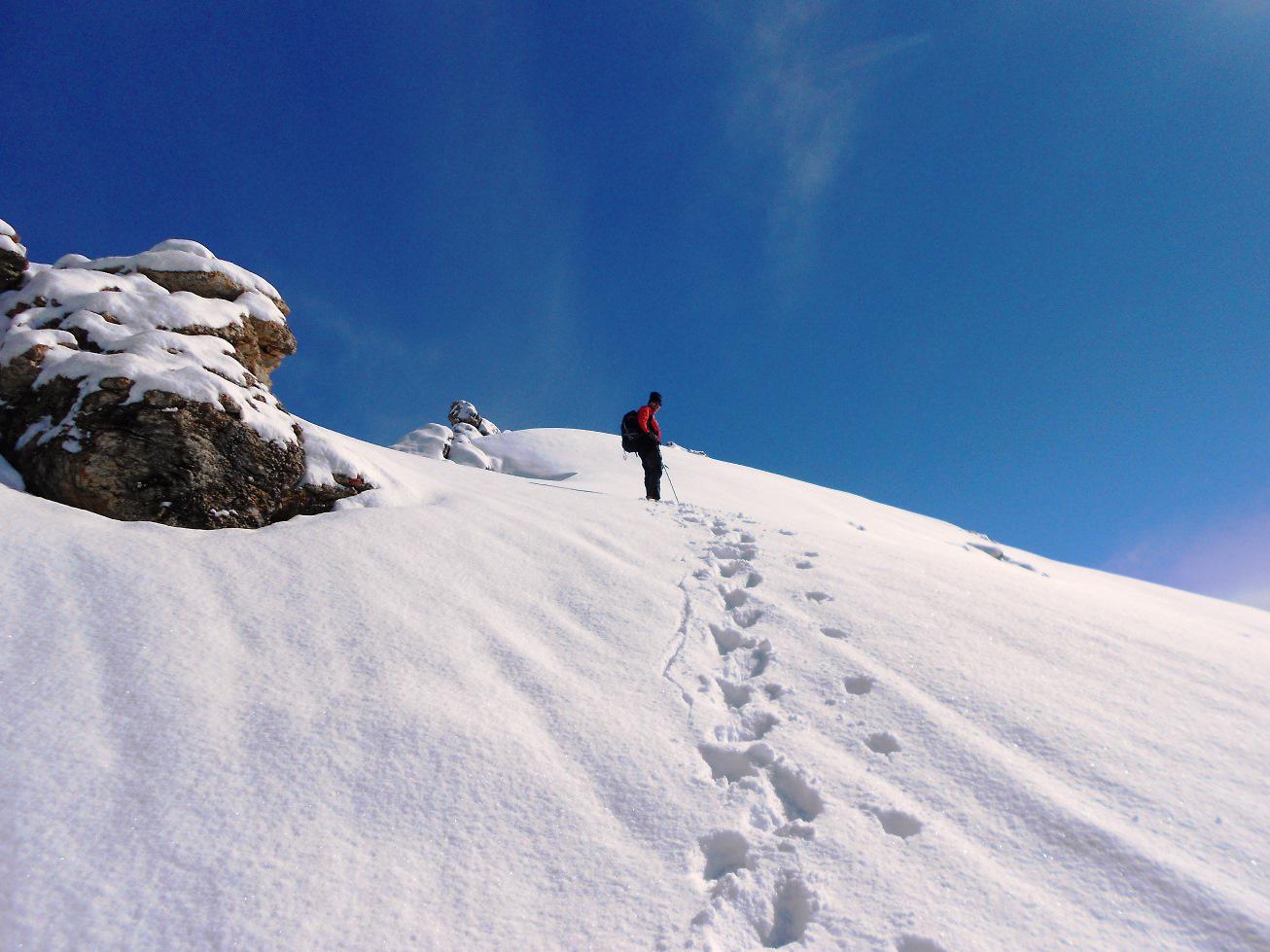 Dal colletto, lasciati gli sci si segue il pendio di erba e rocce fino in cima.