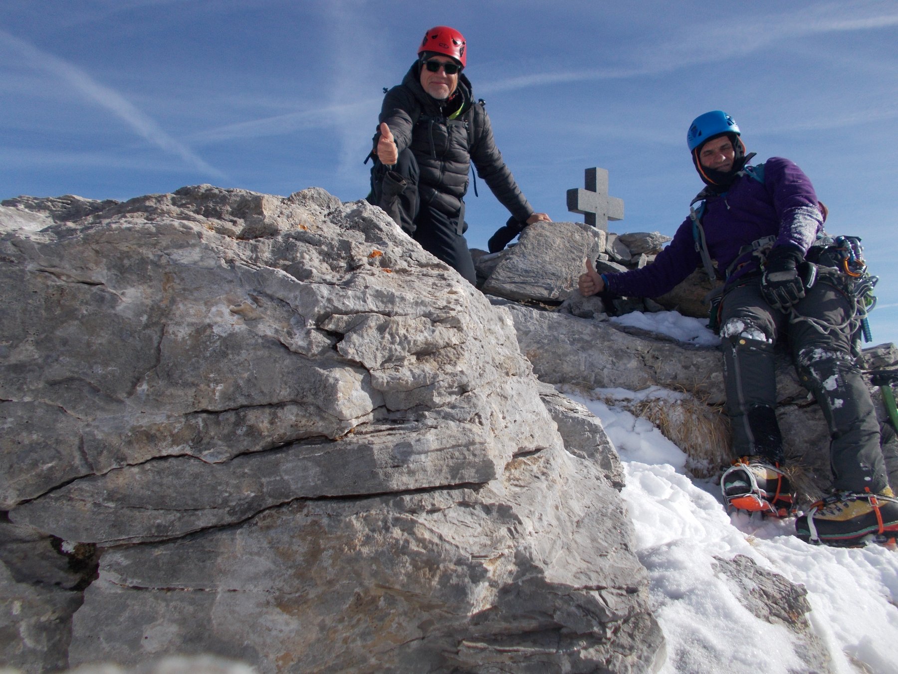Partiti appena sopra il nuovo Rifugio Maraman. Oggi la destinazione è la stessa, ma per vie diverse. Io seguirò la via normale, (che poi tanto normale non lo sarà) invece il socio andrà a cimentarsi con la goulotte della parete nord…questione di gusti e di capacità! Ci separiamo nei pressi del Pont Fornicola e contiamo di ritrovarci in cima. L’inizio della mia salita risulterà subito molto faticosa, la neve è decisamente troppo sfondosa…ho seri dubbi di riuscire. Per fortuna scelgo di risalire il breve canale ghiacciato con picozza e ramponi, che mi porterà direttamente sulla crestina lato sud est. Da questa, mantenendo sempre il filo e fiancheggiando poi il lato S/O della Rocca Parvo, raggiungerò abbastanza agevolmente la cima…addirittura prima del socio. Naturalmente felici entrambi.