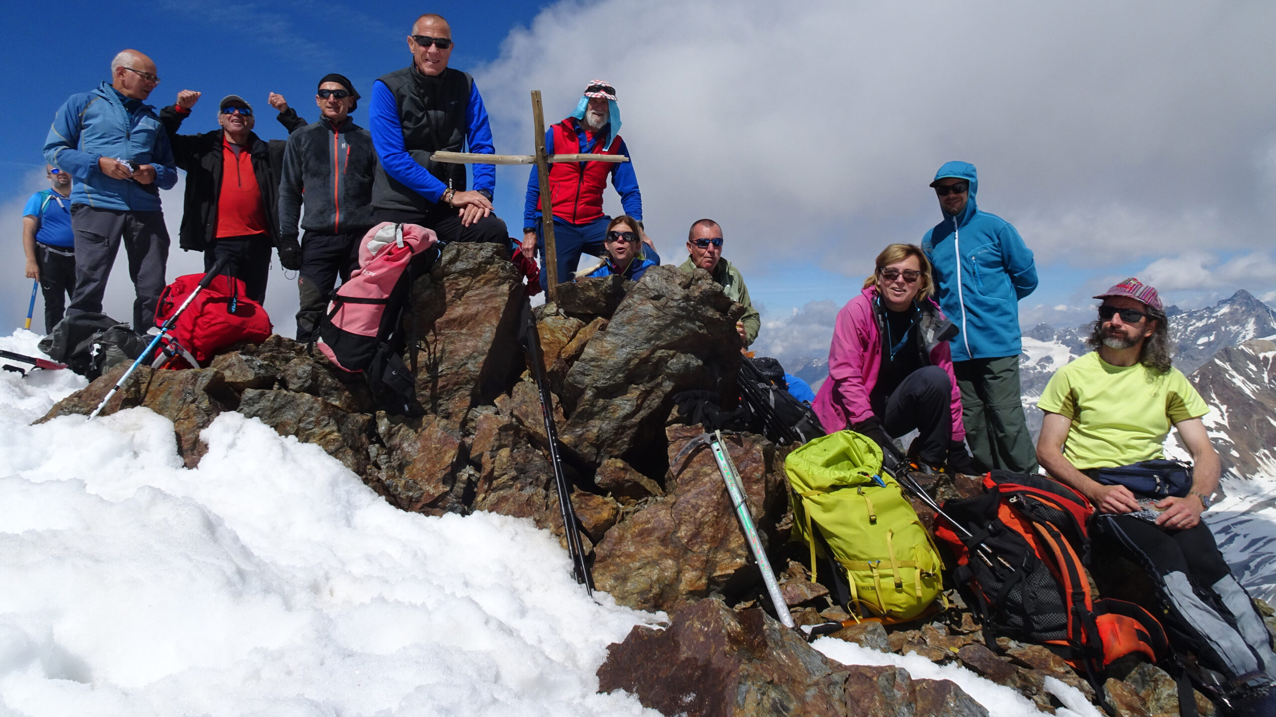 Partiti nel pomeriggio dal parcheggio del Rifugio dei Forni, abbiamo seguito quasi tutti il sentiero, o per meglio dire, la stradina sterrata di servizio, che nel giro di 1.30 ore di tranquilla camminata, ci ha condotti al Rifugio Branca. La parte finale della strada è piuttosto faticosa, anche per via della temperatura piuttosto elevata. Incontrati vari escursionisti ed alpinisti in discesa dal rifugio. Il rifugio è spazioso, davvero confortevole e decisamente ben tenuto oltre che ospitale ed accogliente, la gestione attuale merita i complimenti! Ottimo trattamento e sistemazione, fortunatamente non era troppo affollato. Partiti alle 7.00 la domenica mattina, seguendo inizialmente il sentiero che porta al giro delle trincee della Val Rosolè, fino al primo bivio, poi saliti sul filo della lunga morena che consente di prendere gradualmente quota, raggiungendo il grande pianoro detritico di quota 2900 m. Da qui ha inizio la copertura nevosa, sono presenti campi di neve (circa 30 cm di neve) la cui tenuta non è affatto ottimale, anzi a tratti sfondosa (ma con la temperatura così elevata e lo zero termico a 3900 m c’era da aspettarselo!). Attraversati con una certa fatica i nevai, siamo poi saliti su una ripida valletta-canale verso un colletto a quota 3100 m. Raggiunto il colle, ha inizio la parte più divertente e piacevole della gita : la salita della cresta Sud-Ovest. Si sale tenendo grosso modo il filo di cresta, aggirando a destra gli ostacoli più seri (qualche passo di II aggirabile). Superato il primo tratto di cresta con i gradoni rocciosi, poi la cresta perde pendenza e si trova un tratto largo e quasi pianeggiante, noi lo abbiamo trovato parzialmente innevato, l’ultimo tratto di cresta è nuovamente ripido, ma le roccette sono facili, qualche nevaietto e si arriva all’anticima. Da qui alla cima è presente una copertura nevosa costante, fortunatamente in salita era su neve ancora compatta, abbiamo fatto solo questo breve tratto per arrivare in cima con i ramponi ai piedi. La cima è ampia, indicata da una minuscola croce in ferro e una rudimentale croce di legno. Qualche piacevole passaggio di facile arrampicata nel primo tratto di cresta, poi è quasi tutta camminabile e senza esposizione, consigliata anche a gruppi, può essere considerata una buona meta per gite sociali del CAI e associazioni simili. Ci siamo trattenuti in cima per oltre 1 ora, poi siamo scesi seguendo a ritroso il percorso di andata, solo in due siamo scesi direttamente per un ripido ghiaione detritico per evitare la discesa dei gradini rocciosi e raggiungendo direttamente il pianoro della Val Rosolè con il lago. Qualche accenno sui nostri tempi di percorrenza, siamo saliti in circa 4 ore, e in 3 ore siamo rientrati al Rifugio Branca. Itinerario consigliabile, sia per la facilità del percorso, per l’ambiente ed il panorama. Uscita di gruppo pienamente riuscita direi…con grande soddisfazione di tutti i partecipanti. Meteo più che discreto, annuvolamenti parziali, temperatura abbastanza elevata. Oggi eravamo presenti solamente noi al Monte Pasquale, mentre ho visto almeno 40 persone salire la via normale al Cevedale, e alcune cordate sul vicino Palon della Mare.