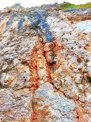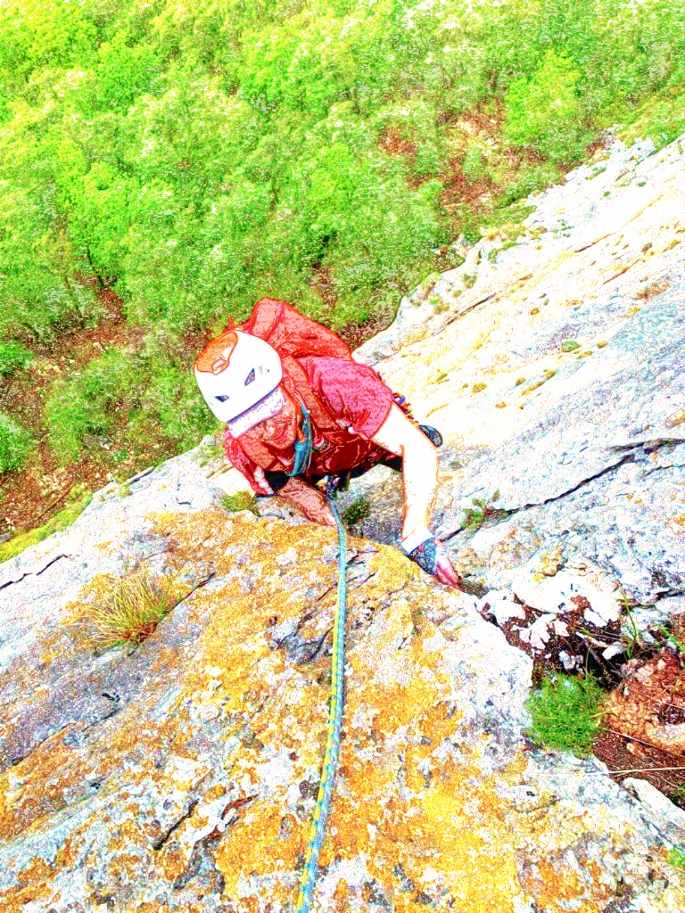 La via è pressoché tutta in fessura. Non diremmo “spettacolare” l’arrampicata del secondo tiro sulla fessura di roccia rossa leggermente strapiombante, tuttavia molto scenografica e di soddisfazione.