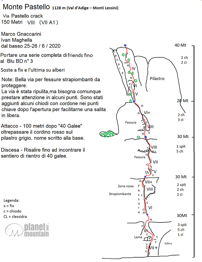 La via è stata (abbastanza) ripulita, e attrezzata completamente con chiodi, fix e cordini nelle clessidre, in modo che le ripetizioni consentano l’arrampicata in libera. Nei punti più difficili sono messi cordini (molto) lunghi che agevolano i moschettonaggi.
