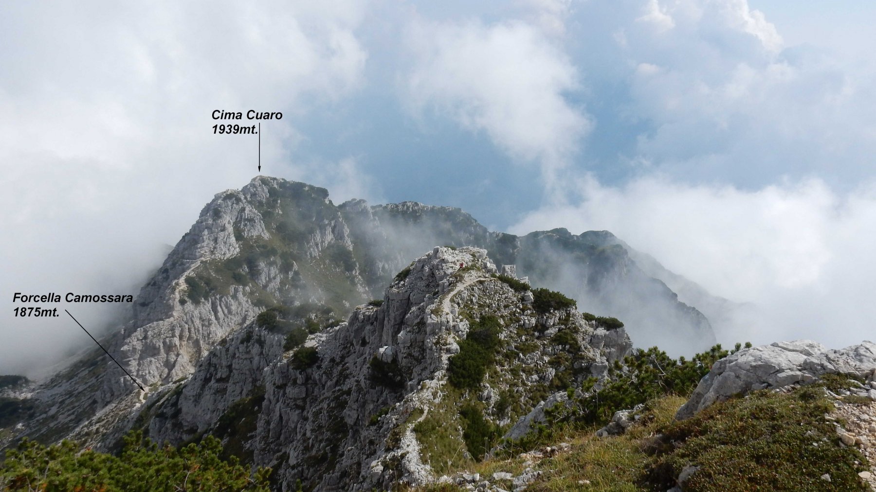 Il sentiero alpinistico presenta vari saliscendi toccando 5 vette dove la più alta è il Cimon del Soglio Rosso a 2040mt. In circa 5 ore si raggiunge il rifugio Papa da dove si può salire alla zona monumentale del Pasubio.