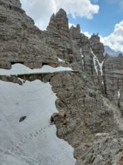 La ferrata in se non presenta grosse difficoltà, pochi tratti verticali e solo qualche scalino in ferro, ma l’attraversamento di alcuni canaloni detritici al momento ancora innevati non è banale, ci sono orme di scarponi ma occorre prestare attenzione perchè i cavi di protezione non sono utilizzabili in quanto ricoperti dalla neve. Anche alcuni tratti in discesa su gradoni innevati e con assenza di cavo in quanto coperto dalla neve sono delicati.