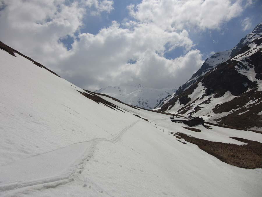 a) se non è sbarrata, prendere una sterrata a sinistra che in piano raggiunge il Pont S.te Anne, risale sull’altro versante con una serie di tornanti ed un lungo traverso fino agli chalet de Longe Cote m. 2.013 (piazzola) o ancora per un breve tratto su percorso più difficile (fino a questo punto con strada senza neve sarebbe possibile giungere in auto, ma..il transito è vietato ed inoltre, poco prima del ponte si passa sotto una bastionata soggetta a scariche di pietre); proseguire a piedi sul sentiero fino ad attraversare un ponticello sul Ruisseau de Fond, salire agli chalet omonimi m. 2.115 ed attraversare in piano a destra su sentiero fino agli chalets de Pelouse m. 2.100;