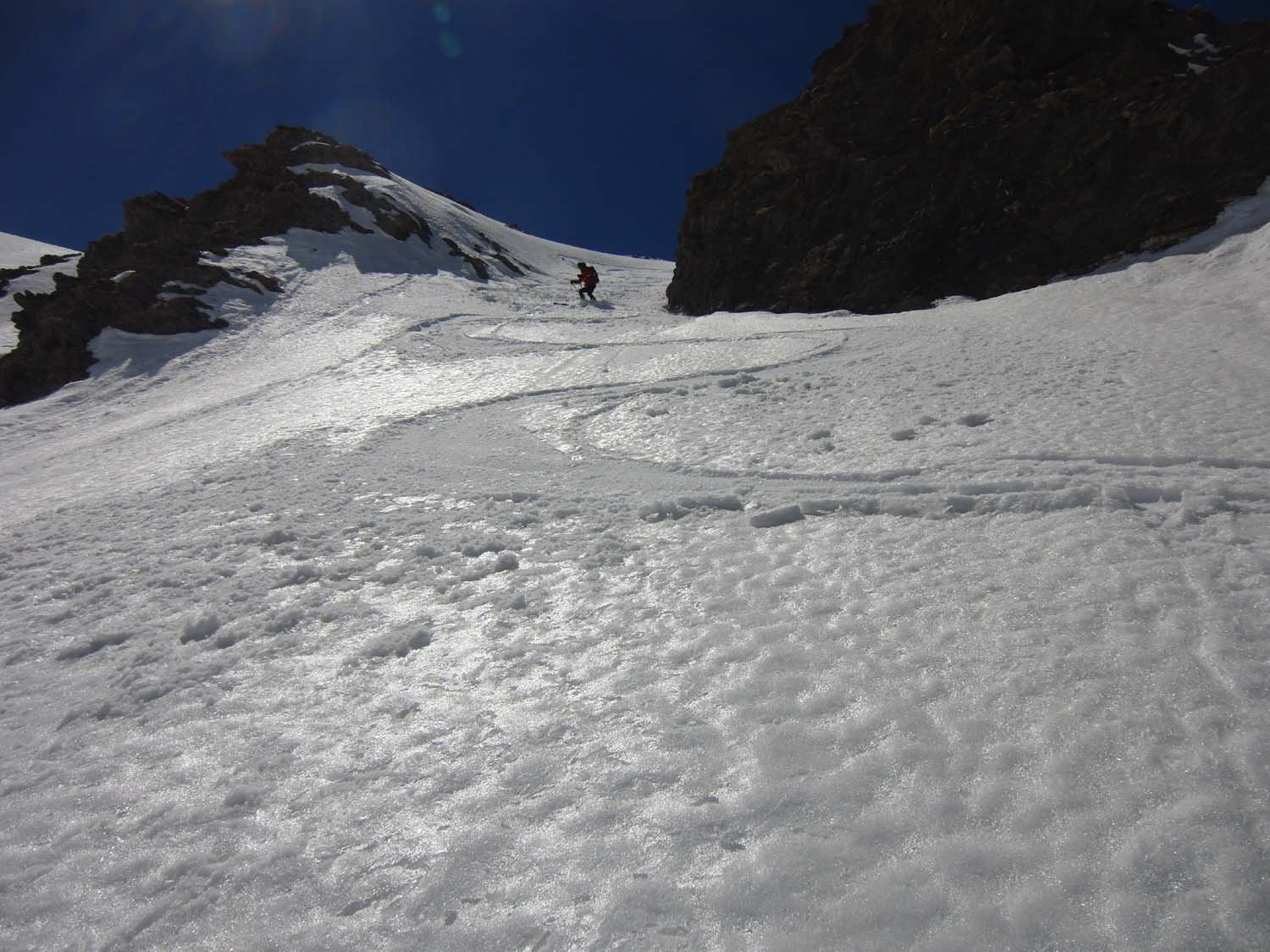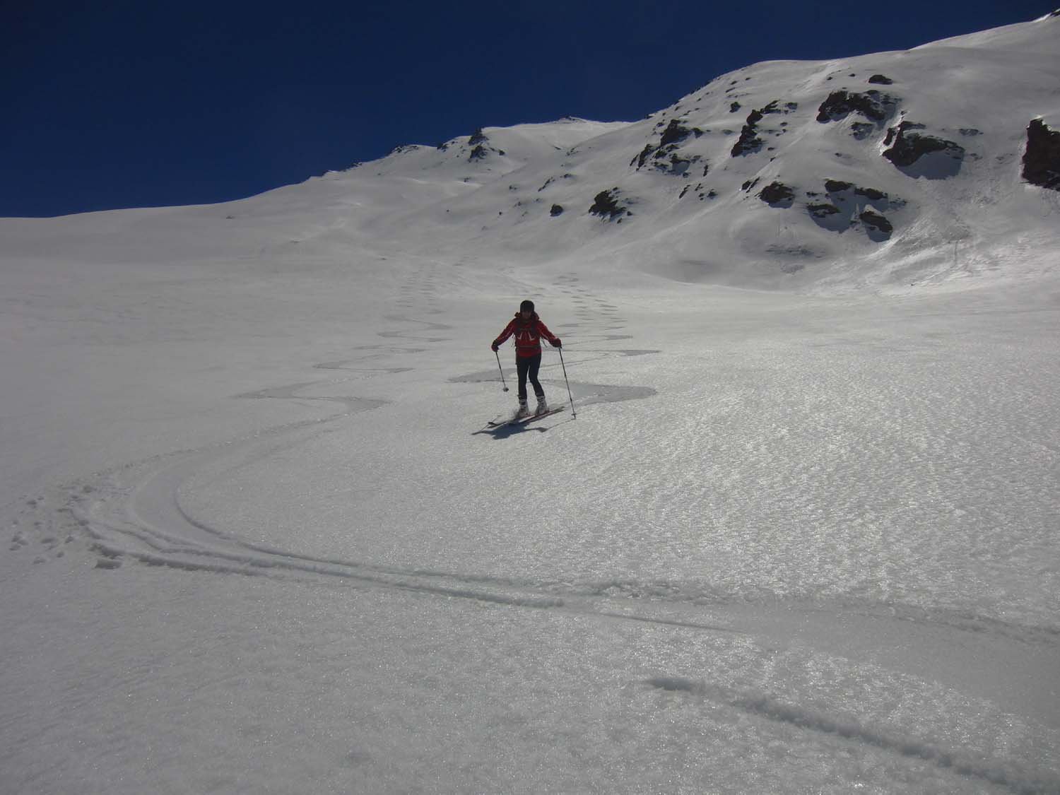 In discesa dalla cresta sommitale scendendo sul versante di salita vi è ampia possibilità di scegliere l’itinerario più congeniale alle proprie possibilità, prestando tuttavia attenzione alla stabilità dei pendii.