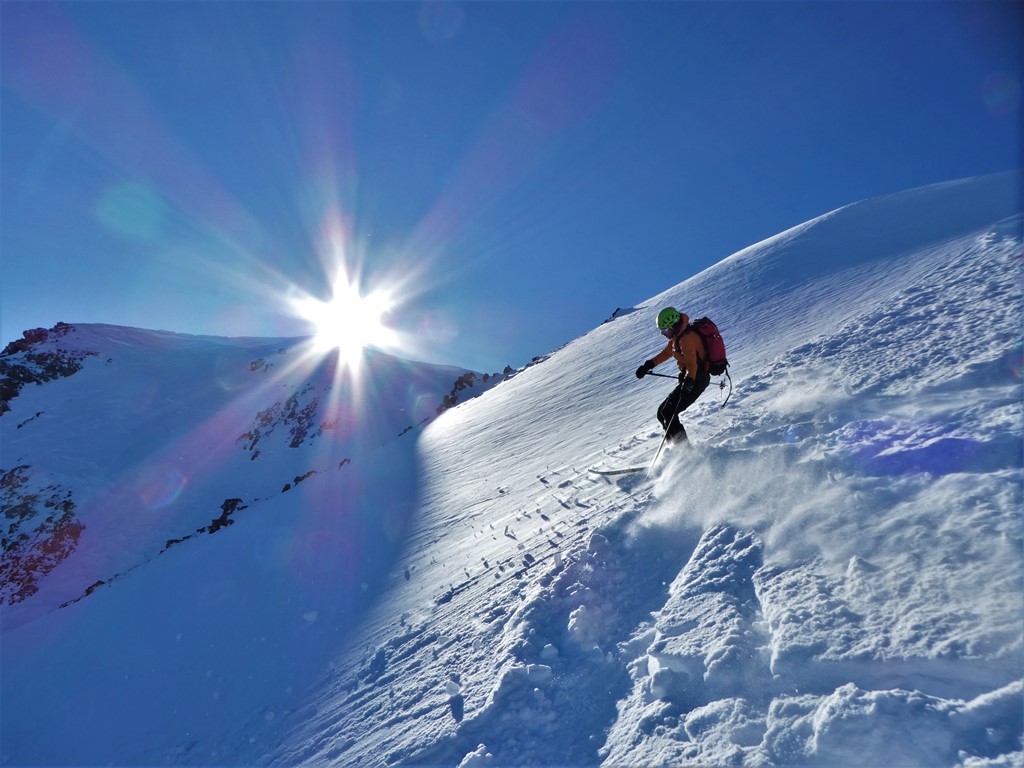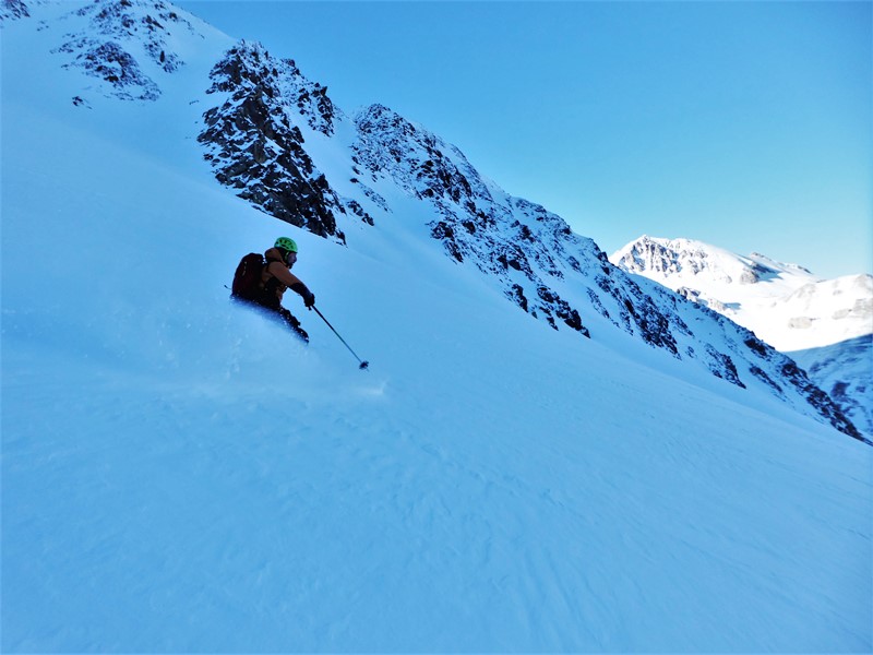 Saliti a Ferrere tramite la pista forestale che stacca a sx. dei tornanti sopra la vecchia dogana (pochi cm. di fresca su fondo preesistente); dopo la borgata percorso il fondo del vallone su neve giusta, che però aumenta appena ci si porta sotto la est del Pebrun (da 20 ad oltre 30 cm. di fresca più in alto). Conoide in farina, che diviene più pressata da metà canale (di qui sci in spalla per evitare tagli, uscita diretta sul ramo di dx.). Freddo davvero intenso nel canale, meglio al sole della cima. Discesa su bella polvere nel tratto iniziale del canale, poi per evitare di caricare la placca centrale scesi con molta attenzione contro le roccette di dx. Neve più pressata, non facile, nella seconda metà, poi bella farina su tutto il conoide e giù, sino a riprendere il vallone. Chiuso l’anello con discesa da Ferrere nel vallone Forneris con 4 dita di polvere su fondo duro e poi strada scorrevole sino al villaggio Primavera.