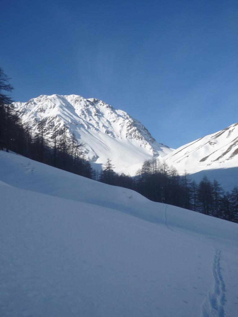 Itinerario un po’ più lungo rispetto a quello più diretto da Bersezio. Lasciata l’auto al primo tornate dopo il Paese di Argentera risalire il Vallone del Puriac. Usciti dalla gorgia a quota 2300 circa abbandonare il percorso per il Colle del Puriac e deviare a sinistra su un percorso molto aperto fino al Bassa di Colombart 2461. Scendere tenendosi il più alto possibile a destra sotto il massiccio del Pebrun; perdendo circa 180-200 metri si arriva al conoide di accesso. Il canale è facilmente individuabile dalla cima del Pebrun perché come riferimento si vede in basso una casetta un po’ a sinistra.