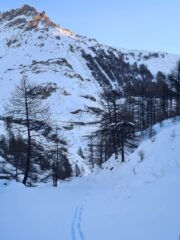Sci ai piedi da La Grange; salito verso la Bassa di Colombart attraversando la gorgia tenendo in parte “gli assi” legati allo zaino e in parte a terra. Passare nel letto del torrente, visto il pendio lato Cima delle Lose (neve poco portante su inclinazione per niente invitante) è forse stata la scelta più giusta. Dai 2000 m in su l’innevamento è migliore, ma, a mio parere, insufficiente per il periodo. Posato gli sci circa 150 m di dislivello sotto la cima e proseguito a piedi fino in vetta. Vista appagante e temperatura gradevole.