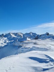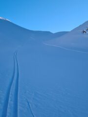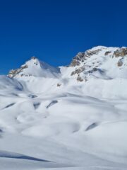 Sceso verso il Colle di Puriac e di lì raggiunto la traccia battuta in salita. Purtroppo, ho sbagliato lato discesa e ho incontrato molte zone pianeggianti che mi hanno costretto a “spingere” anche al ritorno.