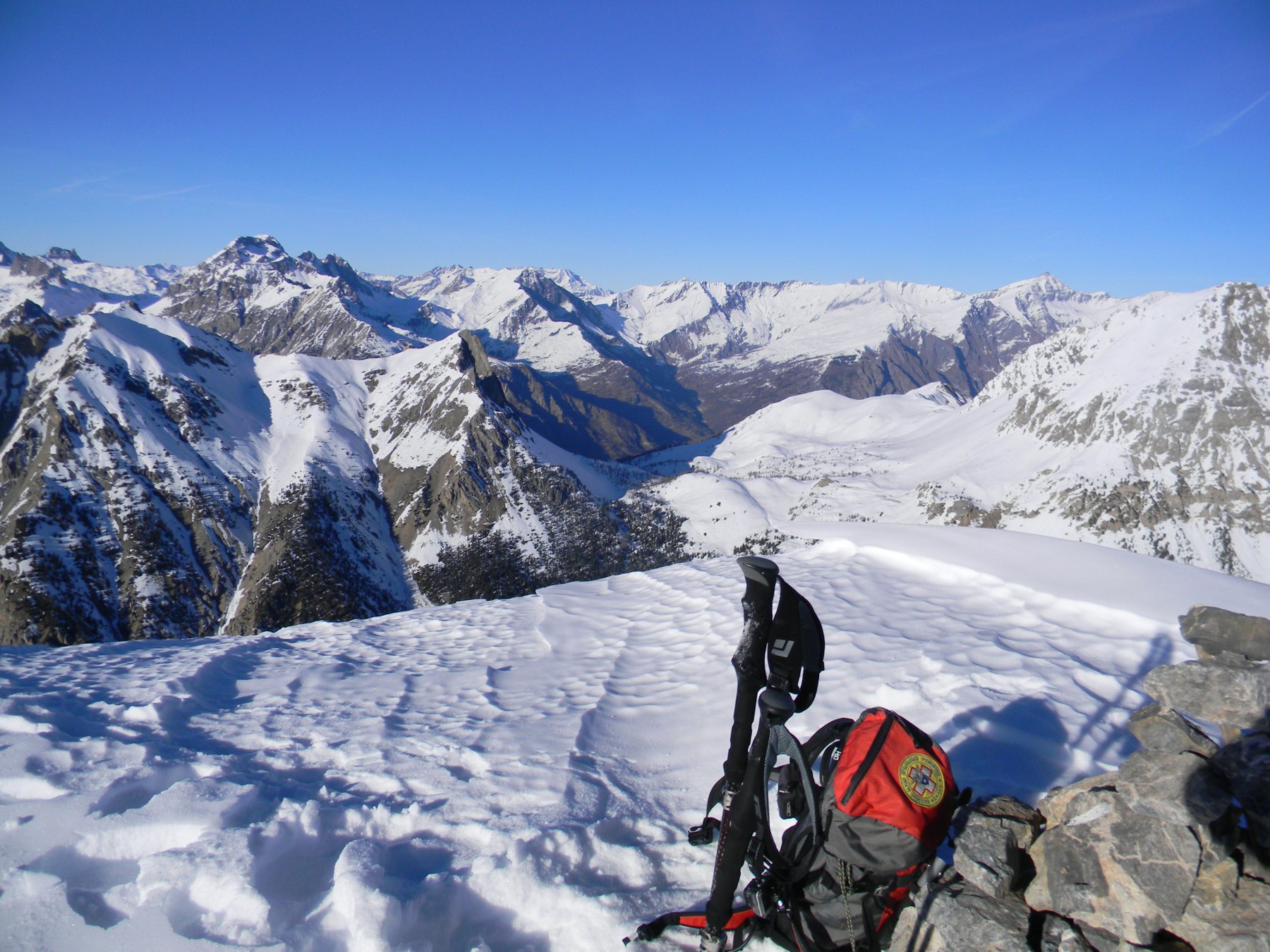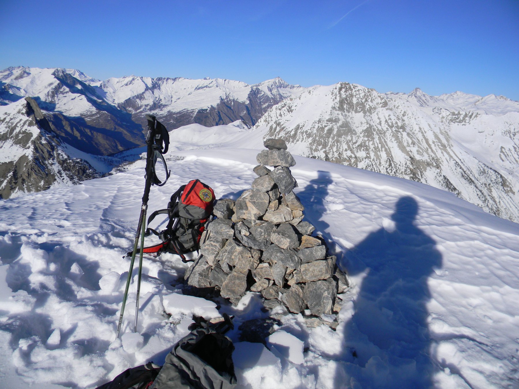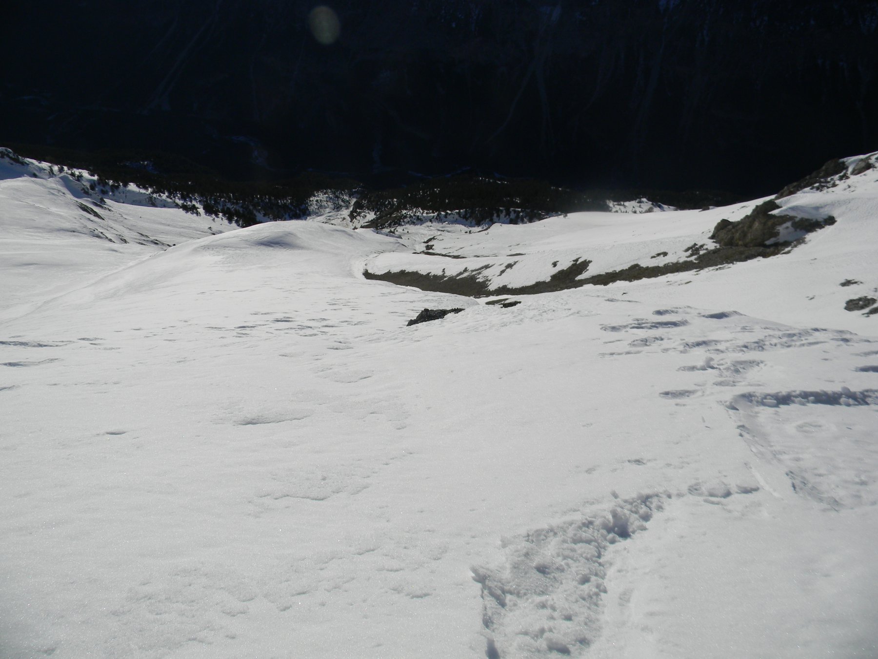 Siamo scesi lungo il versante SW , faticando moltissimo, causa alti accumuli di neve sfondosi, fino a ritornare alla base del pendio NW salito… ormai al buio.