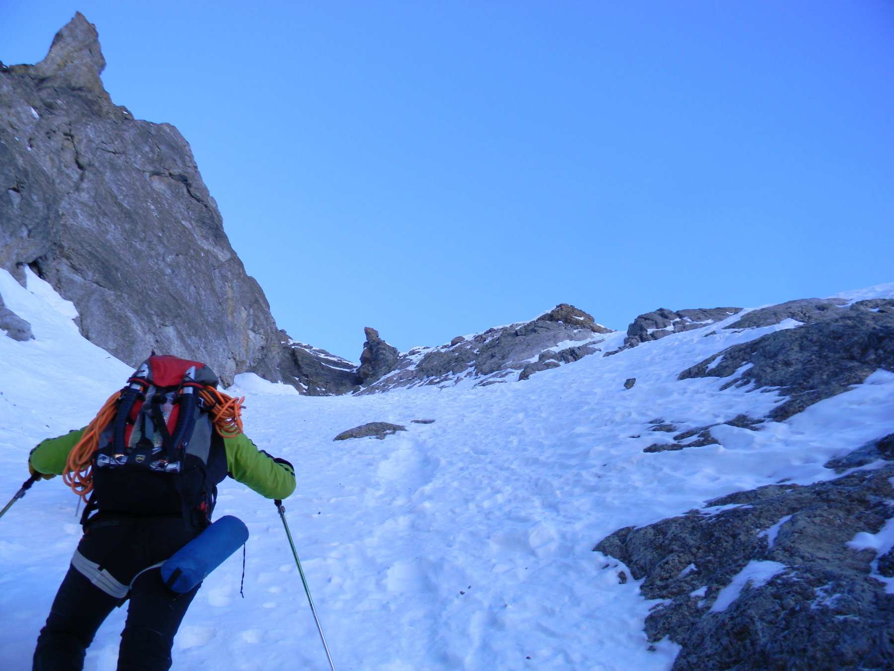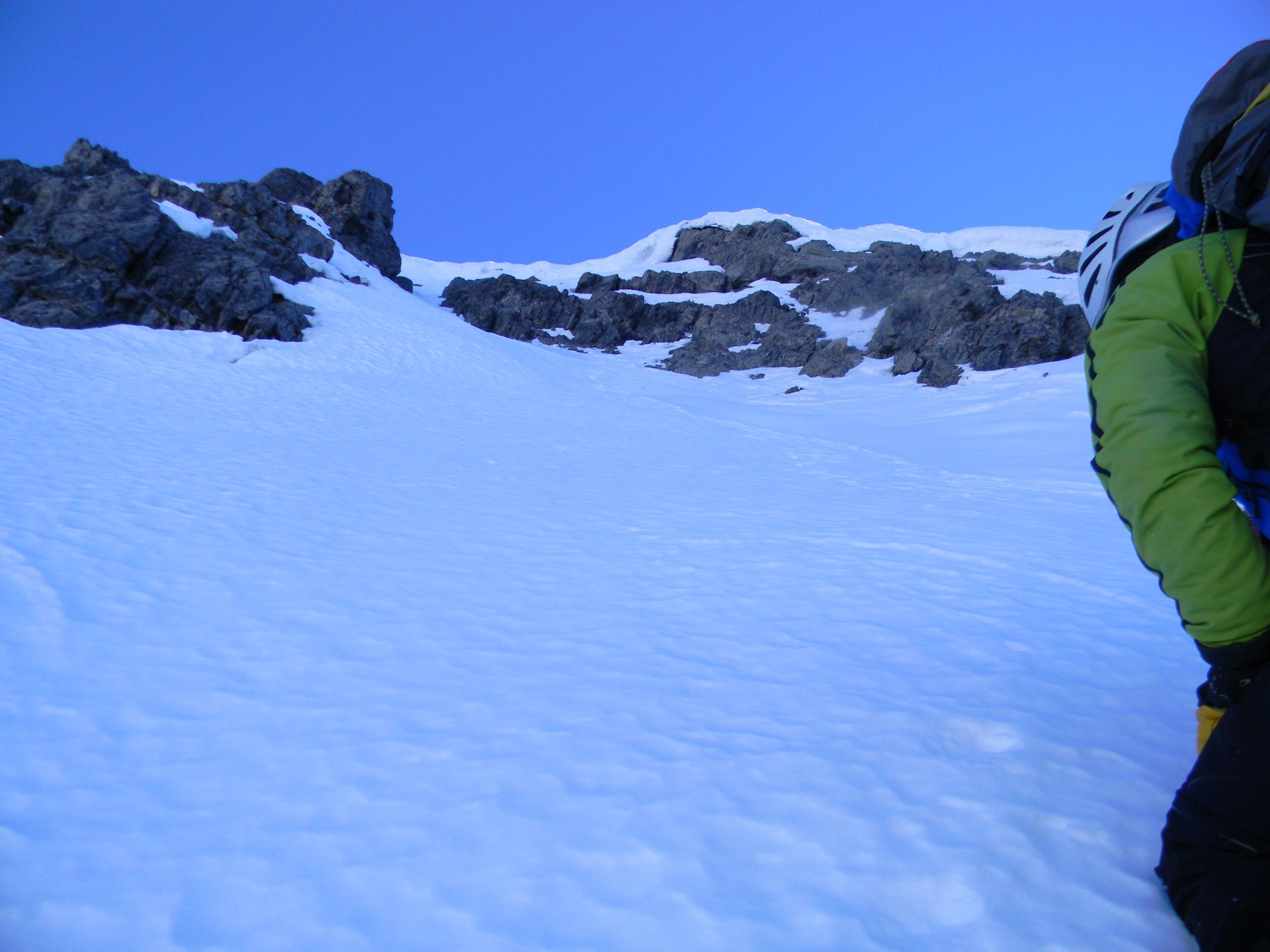 Pendio piuttosto sfondoso, il canale si percorre velocemente il salto roccioso finale è completamente pulito dalla neve e abbiamo optato per l’uso di corda e friend vista l’esposizione, questo tratto in discesa può essere calato in doppia piuttosto facilmente, il pendio successivo si è rivelato il più ostico, perché orlato da cornice cava e verticale, questo tratto è di difficile calata non essendoci alcun supporto roccioso per l’ ancoraggio.