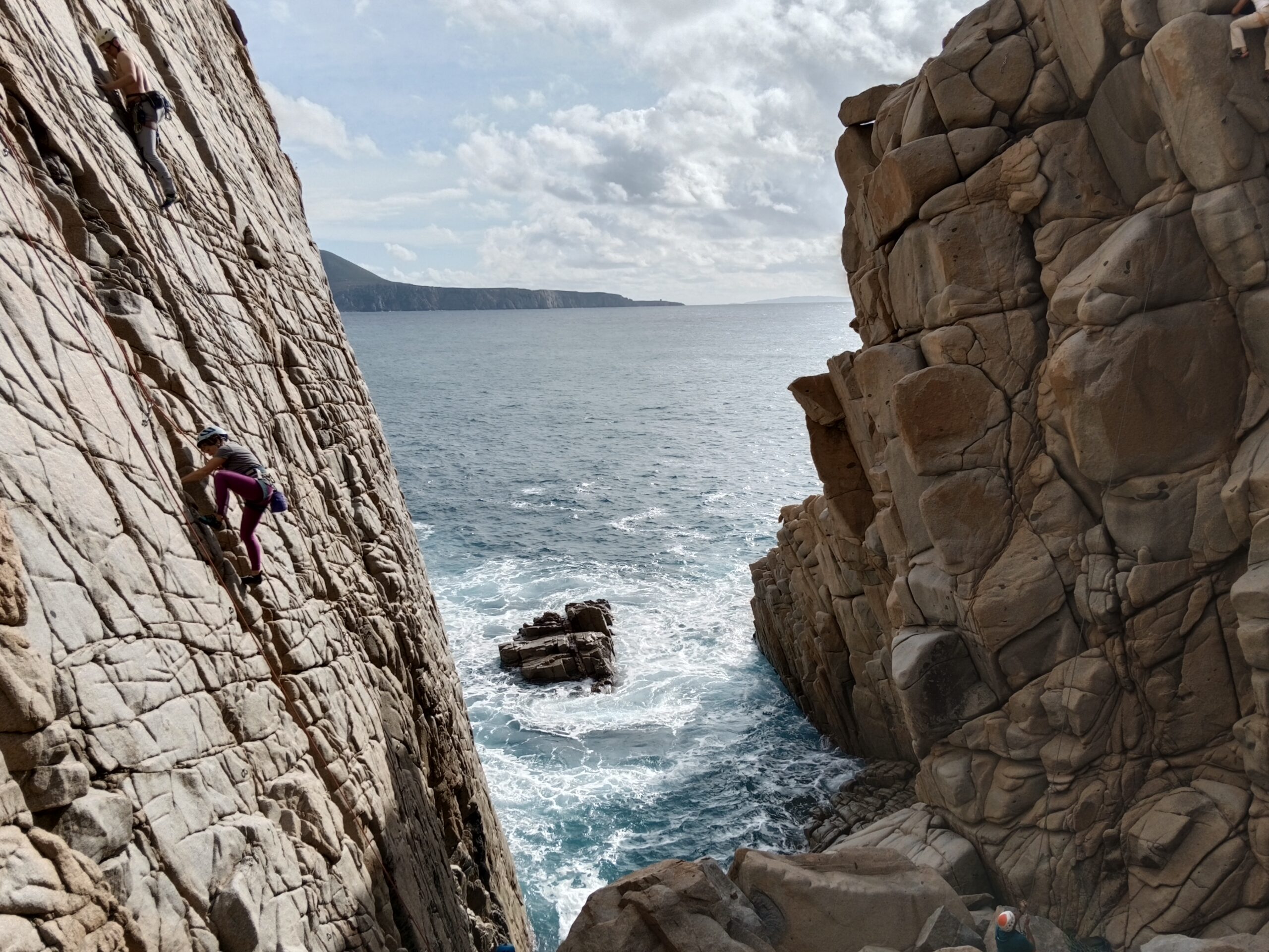 A destra la parete è fessuratissima, verticale e strapiombante. Esposta ad Est. Propone un tiro di 4c Trad e 8 tiri a spit dal 5 al…progetto da liberare. I tiri duri partono da una spettacolare terrazza direttamente sul mare.