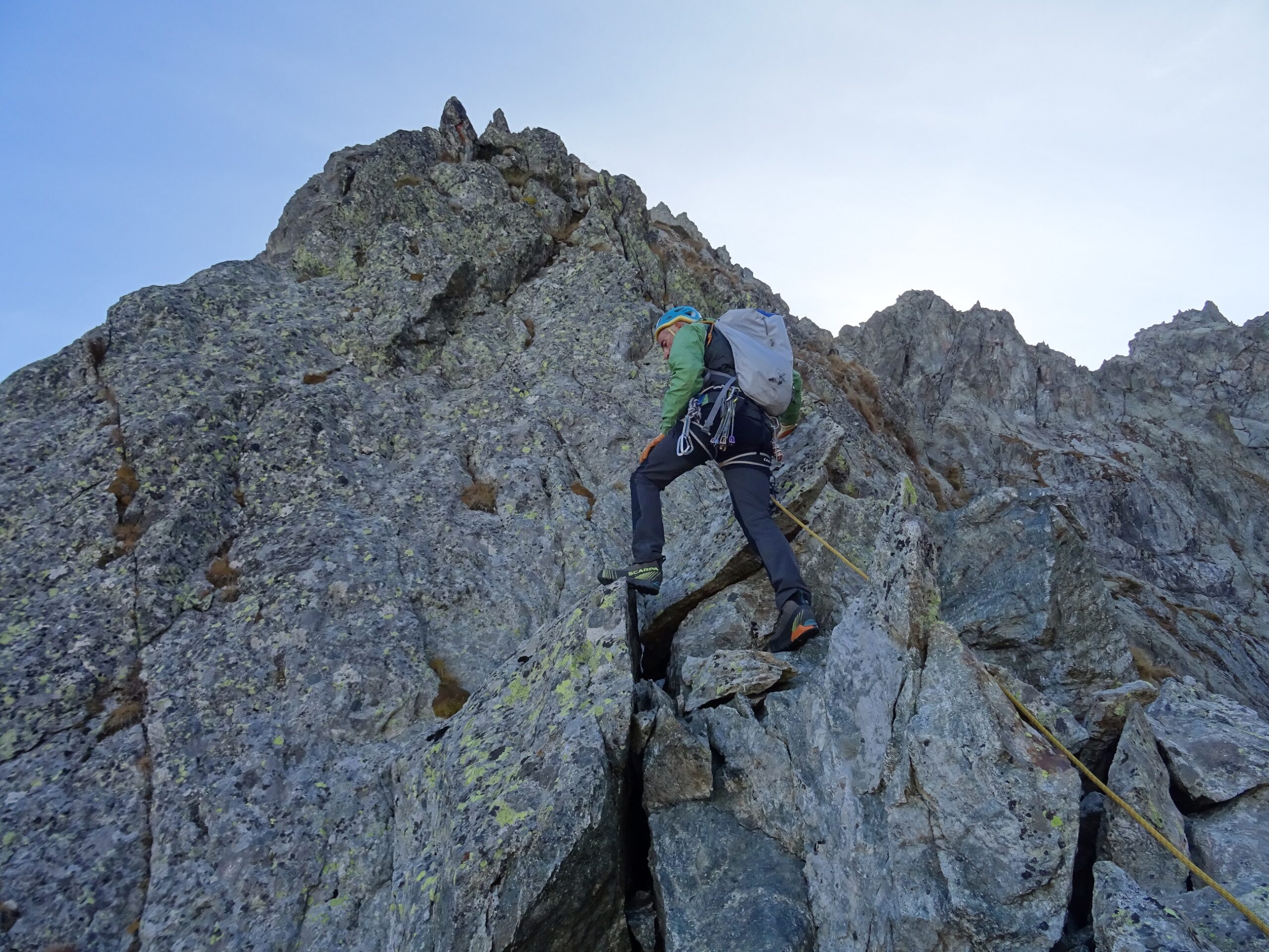 Salire il primo risalto di roccia chiara, discreta e piuttosto verticale, restando preferibilmente sul lato sud (III). Dopo 25m (sosta da attrezzare) proseguire lungo una dorsale meno inclinata fino alla base del salto successivo (circa 25m, sosta da attrezzare). Spostarsi qualche metro a sinistra in traverso (passo di IV-) e salire un diedro-camino di roccia giallastra e sfatta, uscire in una zona più facile e di roccia più compatta e, sempre restando sul lato sud dello spigolo, proseguire in direzione di un altro camino-diedro verticale di roccia delicata (passo di III+), oltre il quale ci si sposta a destra a riprendere il filo in una zona meno ripida (30m, sosta da attrezzare). Alzarsi verso sinistra in direzione di un grande blocco staccato, che si sale sulla destra in corrispondenza di una specie di diedro scuro (passo di III+), oltrepassatolo traversare a sinistra e uscire in un canalino che riporta in cresta (20m, sosta da attrezzare). Traversare a sinistra quasi in piano, su terreno esposto, aggirando un risalto verticale, tornare in cresta tramite una placchetta compatta di roccia chiara e quindi raggiungere il filo di cresta, ora quasi pianeggiante, poco prima della cima della Spalla (2925m).