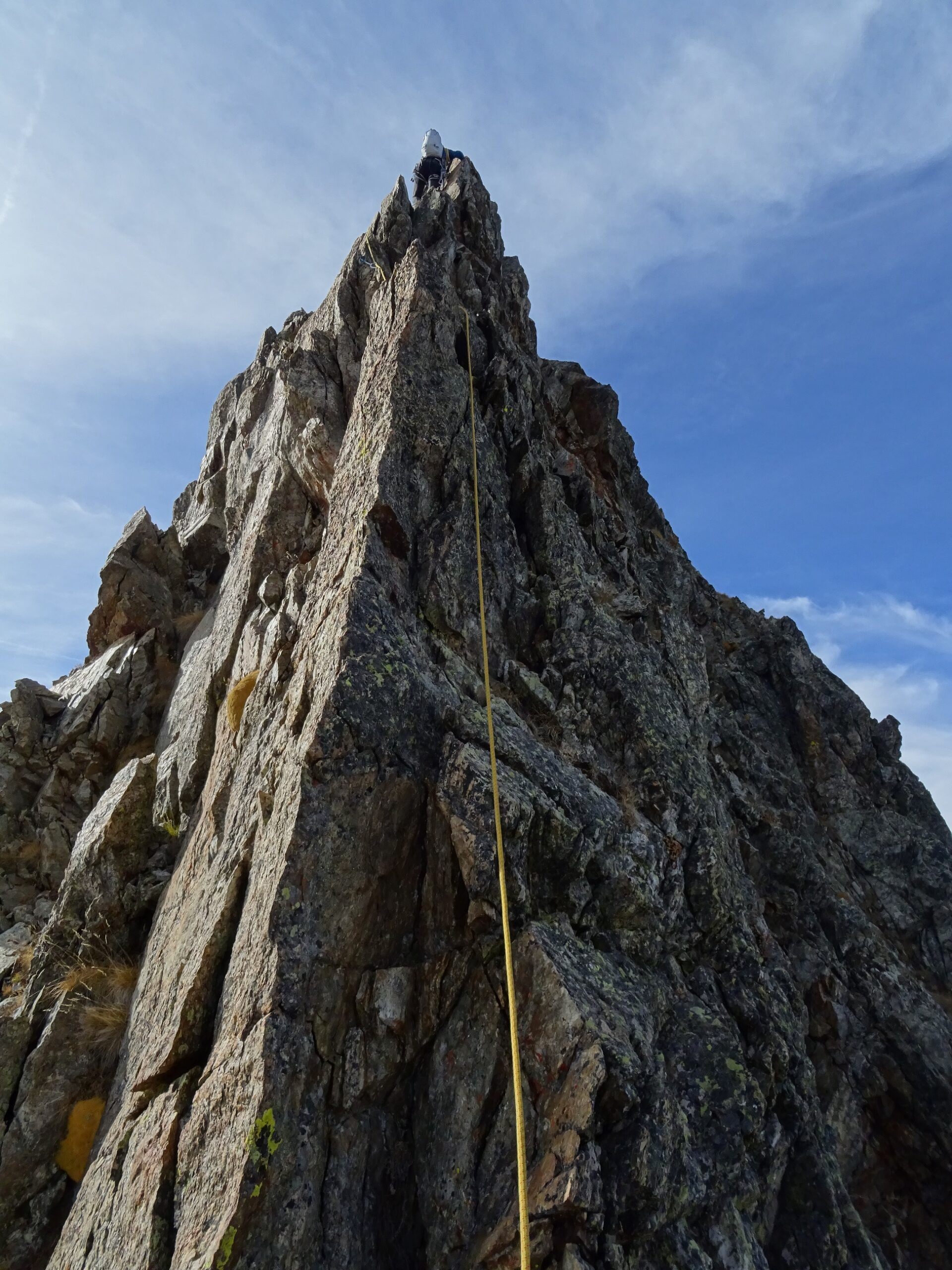 Risalire il filo di cresta, costituito da risalti discontinui, quindi da una zona più affilata di placche compatte e in ultimo da un pendio facile di roccette ed erba, fino a sbucare in cima alla Guglia di Manzone (2718m).