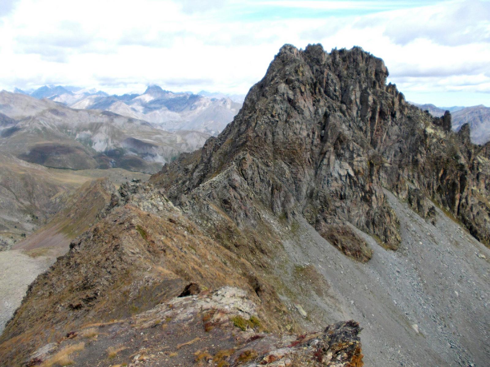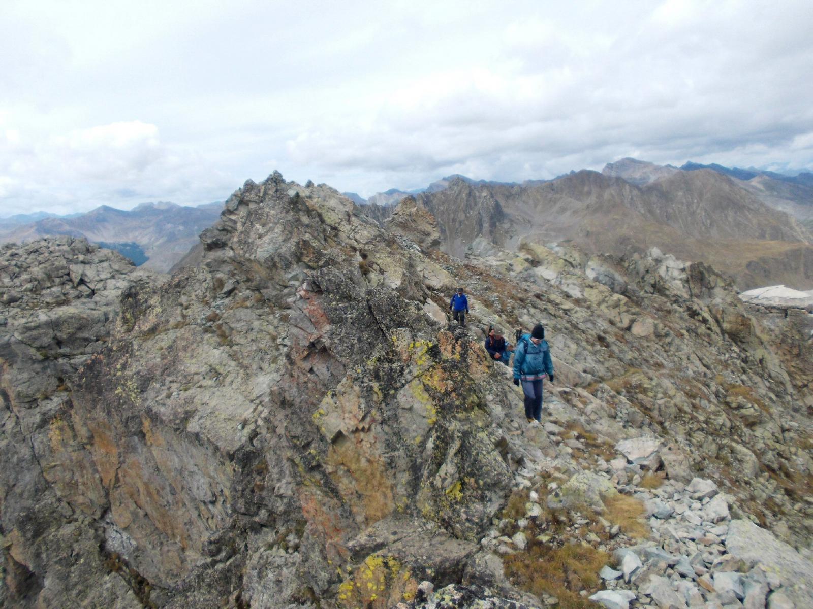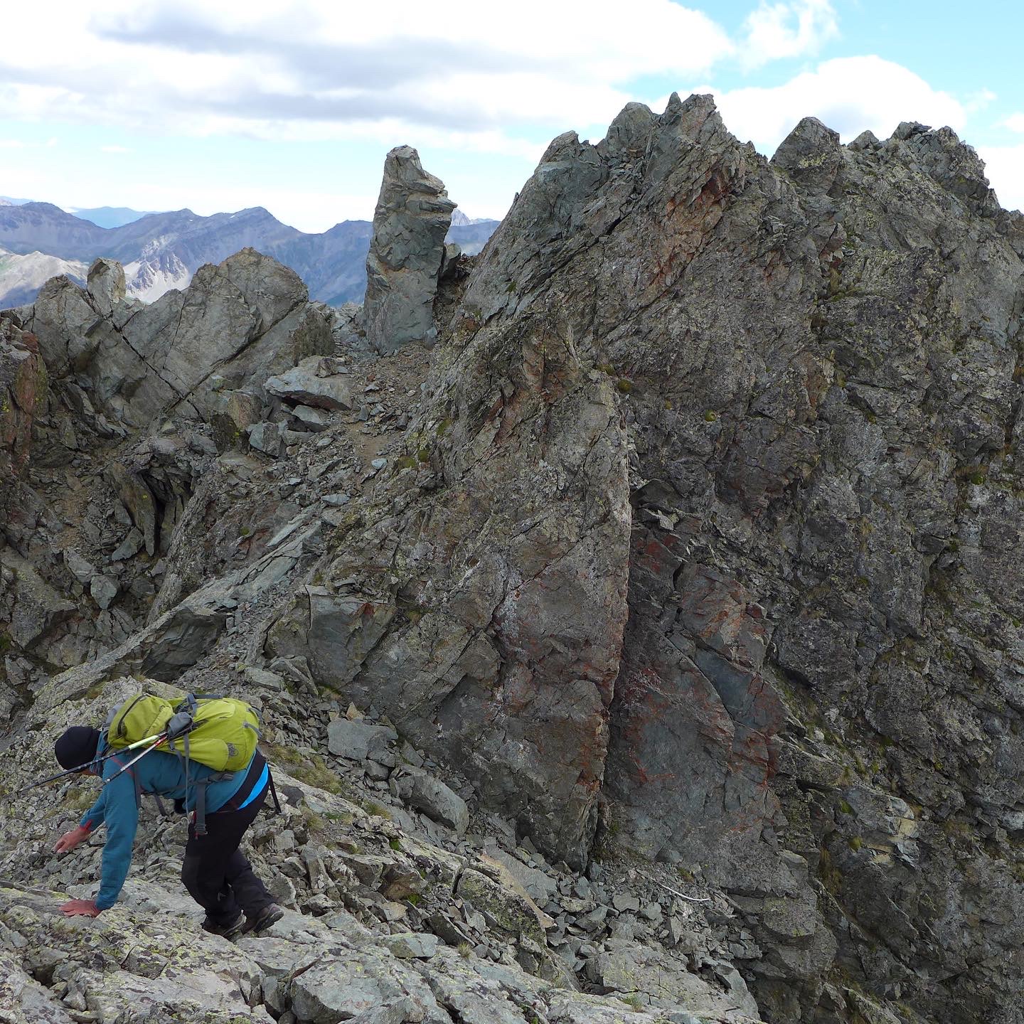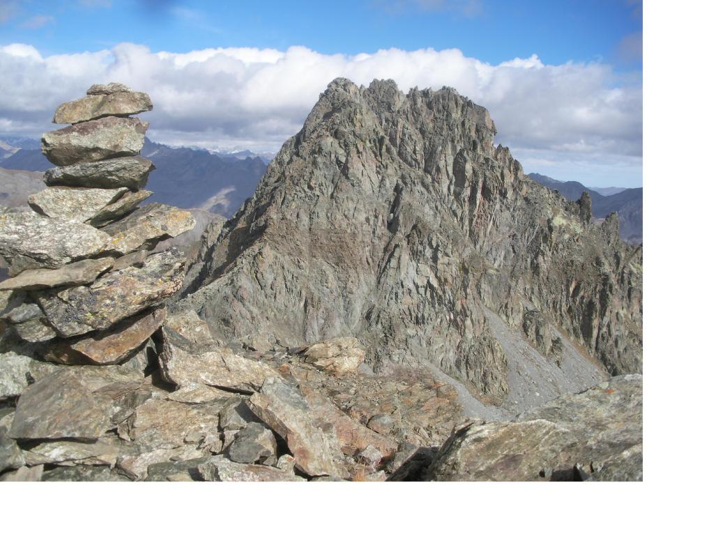 Si procede lungo la cresta di rocce gradinata fin sotto a un salto piu’ ripido, che si aggira a sx sul lato del vallone di Forneris. Salendo ancora per rocce gradinate e massi si giunge su un’anticima . Si scende brevemente. e per una cengetta a sx, si sbuca sulla cresta sommitale nei pressi della vetta (3-3.30h dai Prati del Vallone).