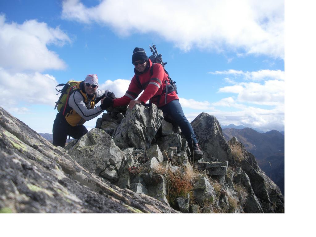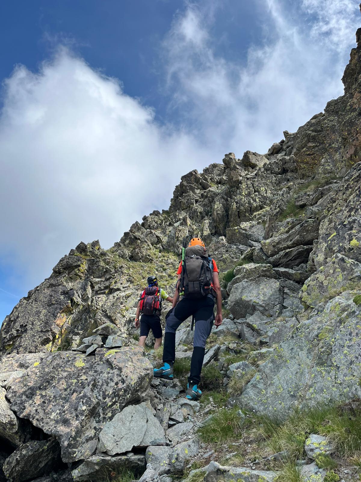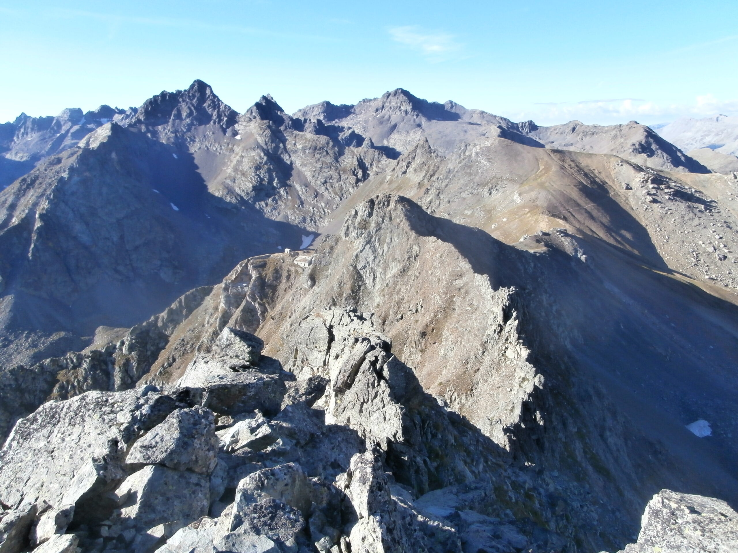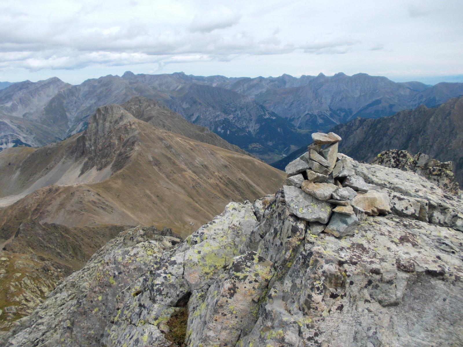 Si procede lungo la cresta di rocce gradinata fin sotto a un salto piu’ ripido, che si aggira a sx sul lato del vallone di Forneris. Salendo ancora per rocce gradinate e massi si giunge su un’anticima . Si scende brevemente. e per una cengetta a sx, si sbuca sulla cresta sommitale nei pressi della vetta (3-3.30h dai Prati del Vallone).