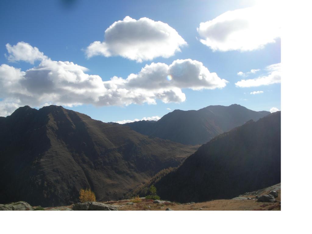 Giunti al sesto tornante (quota 1950 ca ometto) si lascia a dx la sterrata e si sale dritti verso ovest su un ripido pendio erboso (rari segnavia gialli). Poco piu’ in alto s’incontra un vecchio sentiero che rimonta con ampi tornantiil ripido pendio (segnavia gialli), poi prosegue fra massi e rocce levigate, fino a entrare in una bella conca erbosa al cui margine inferiore si trova un minuscolo laghetto (quota 2450m ca).