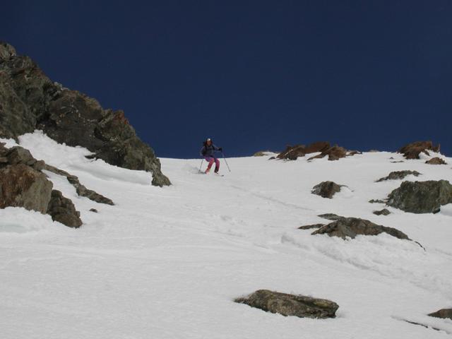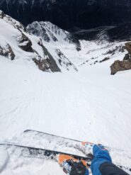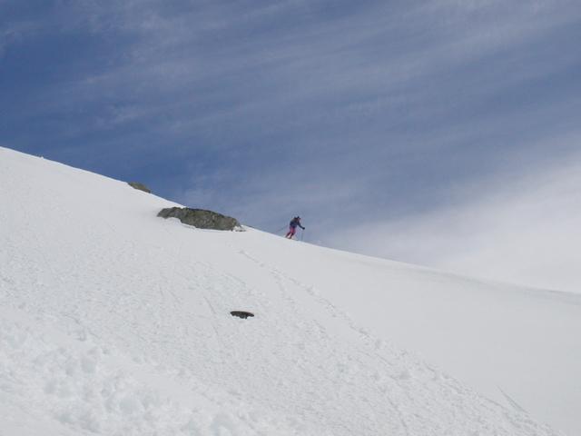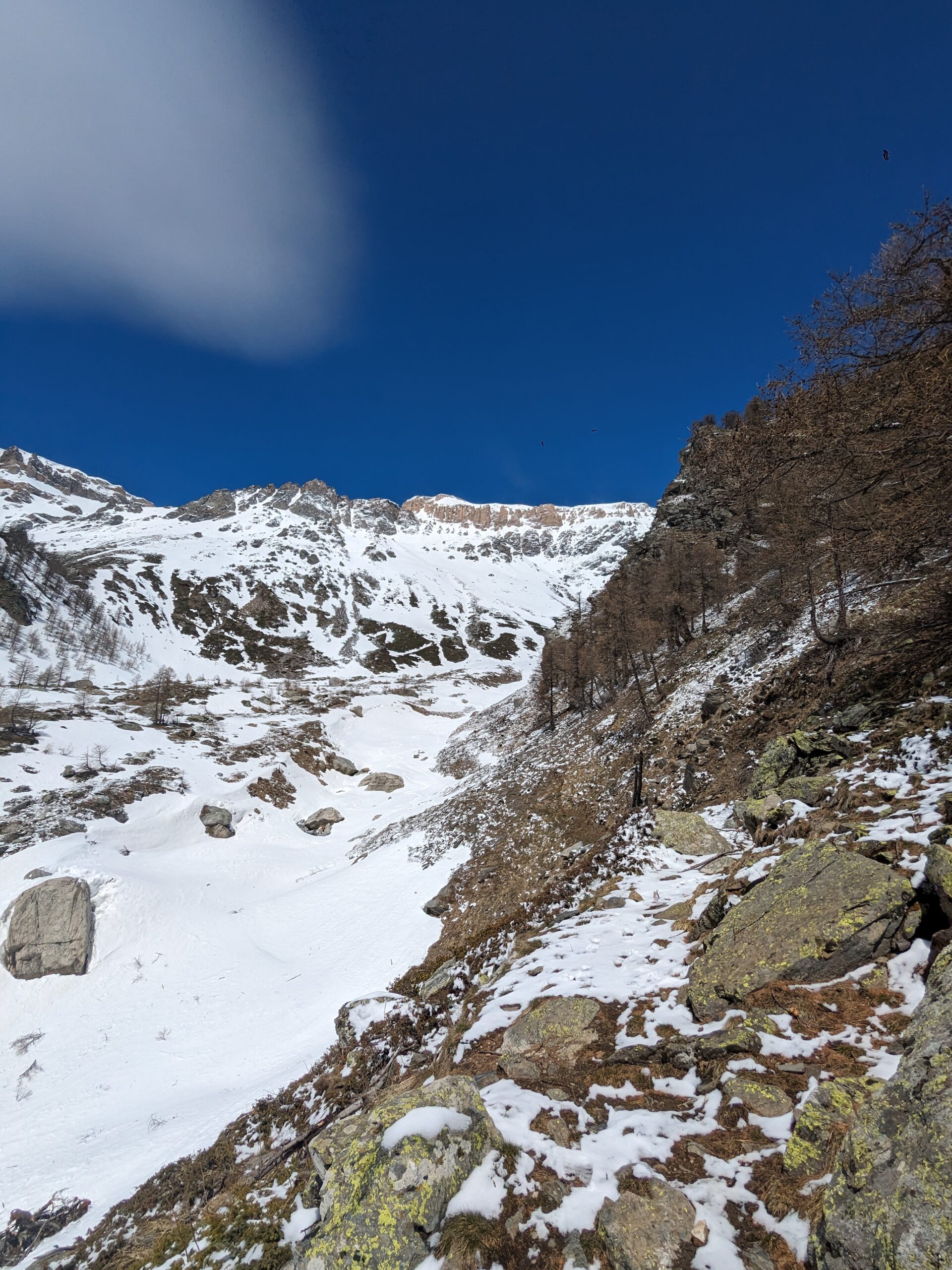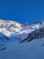 Dalle Grange Hubert si segue il sentiero a tornanti verso Nord che porta nel vallone del Rio Geronda, che si raggiunge ad una quota di circa 2070m. Anche con abbondante innevamento, questo tratto risulta difficilmente sciabile.