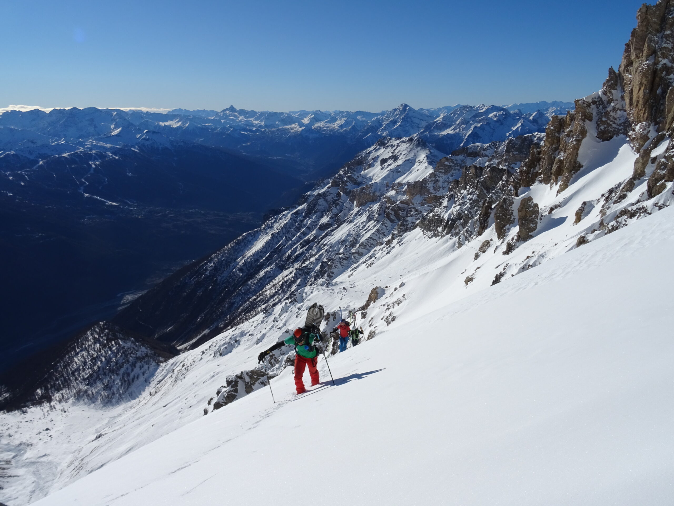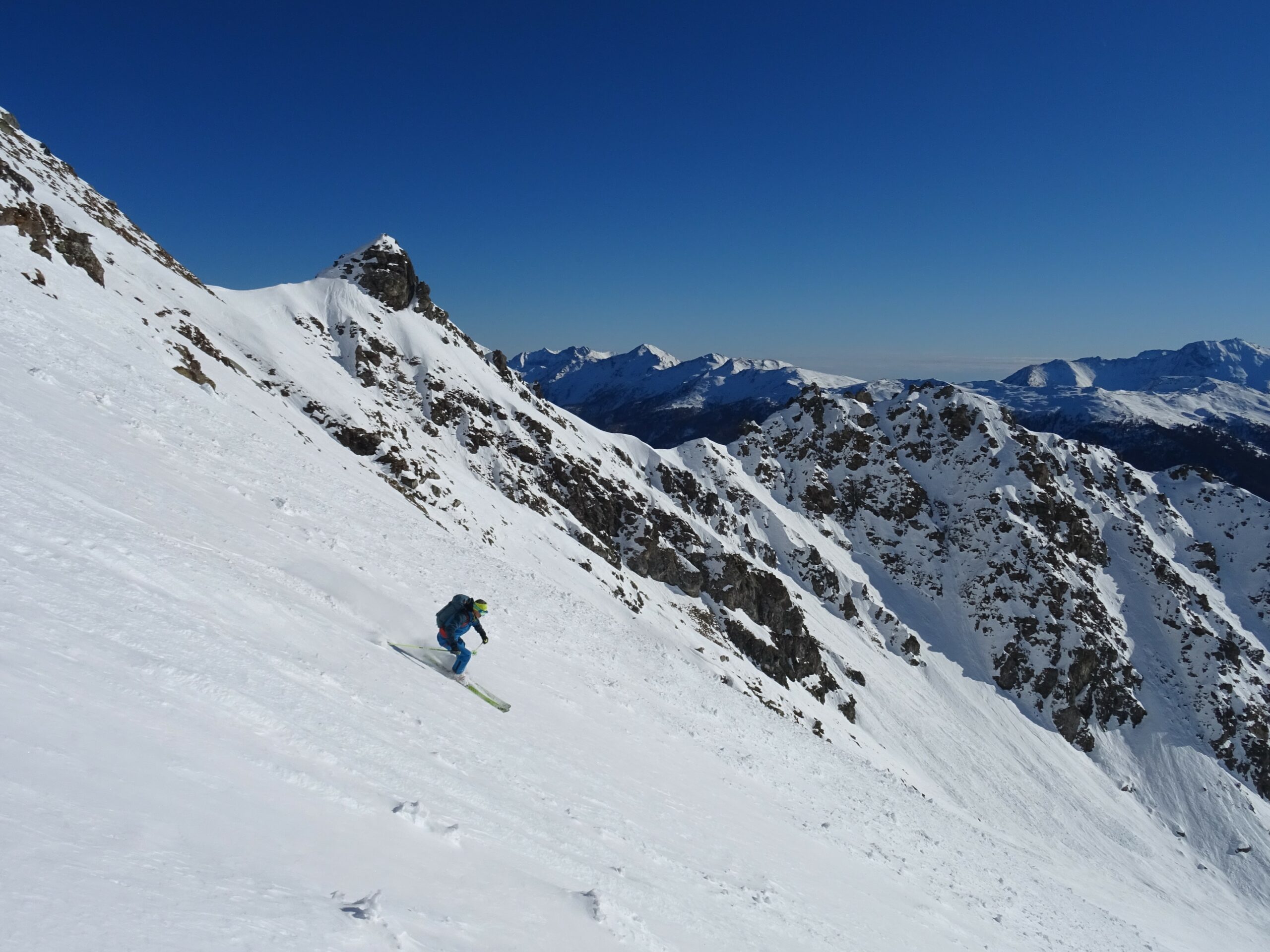 Seguire il fondo del vallone, generalmente occupato da una grande valanga. Intorno a q. 2300-2400m ci si sposta gradualmente verso destra, sotto le pendici della Casses Blanches, si super un ripido risalto (noto come Clot Vallon, 35°) e quindi generalmente dai 2750m si prosegue sci a spalle tagliando gradualmente verso sinistra in un evidente pendio-canale (40°, qualche tratto a 45° nelle strettoie). Quando il canale si apre spostarsi a dx e raggiungere il colletto ad Est della cima (q. 3036m). Svoltare quindi a sinistra (Ovest), aggirando uno sperone roccioso e salendo il canale esposto ad Est che in breve porta in cima al Truc Peyron (esposto l’ultimo tratto, 40-45°).