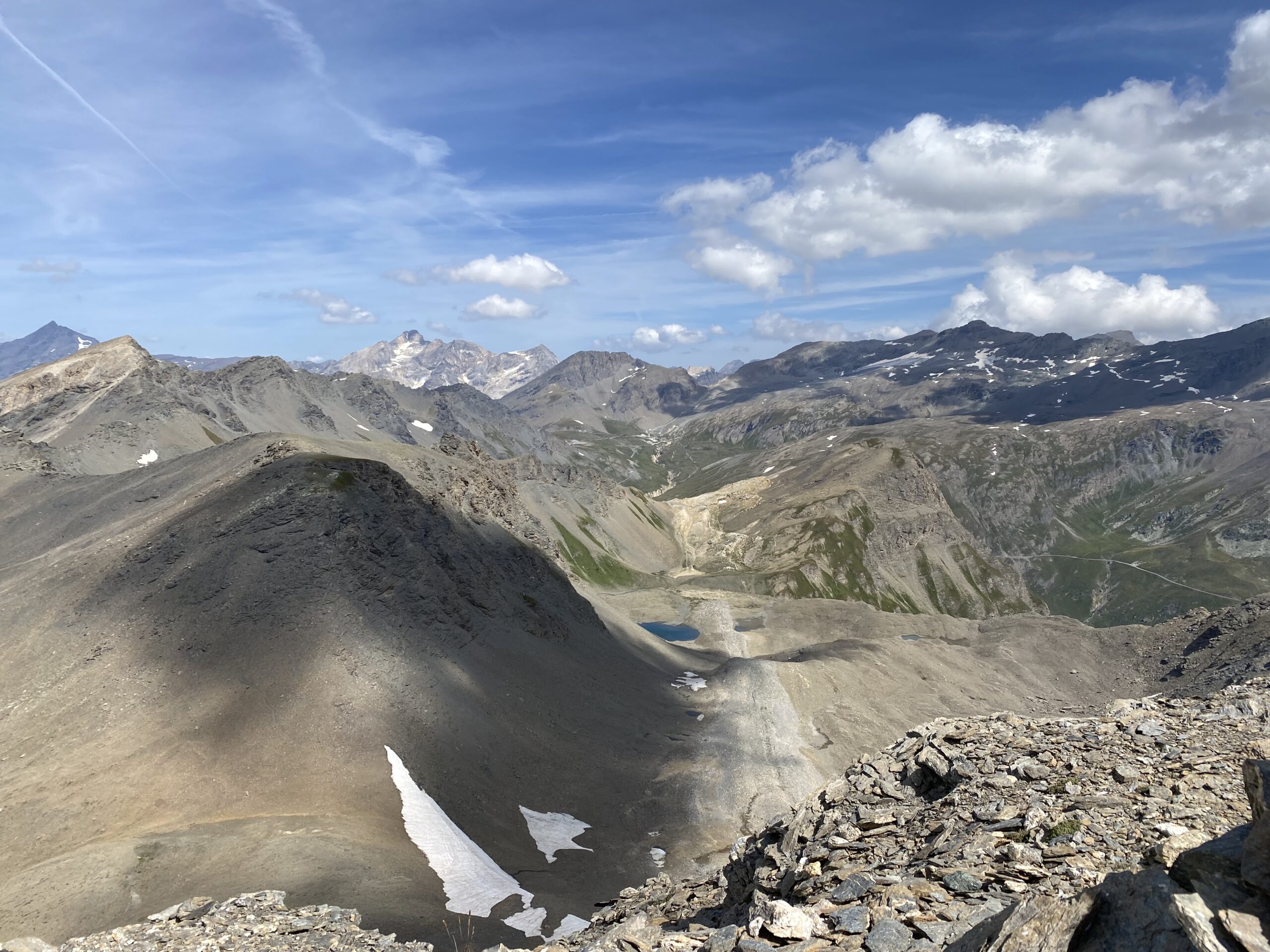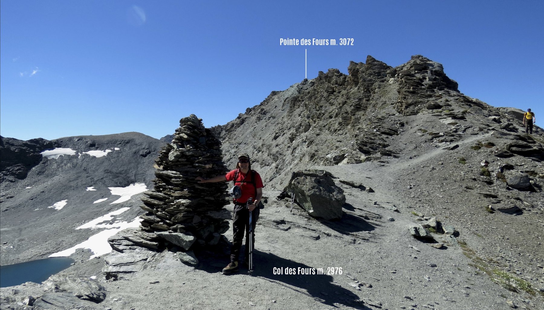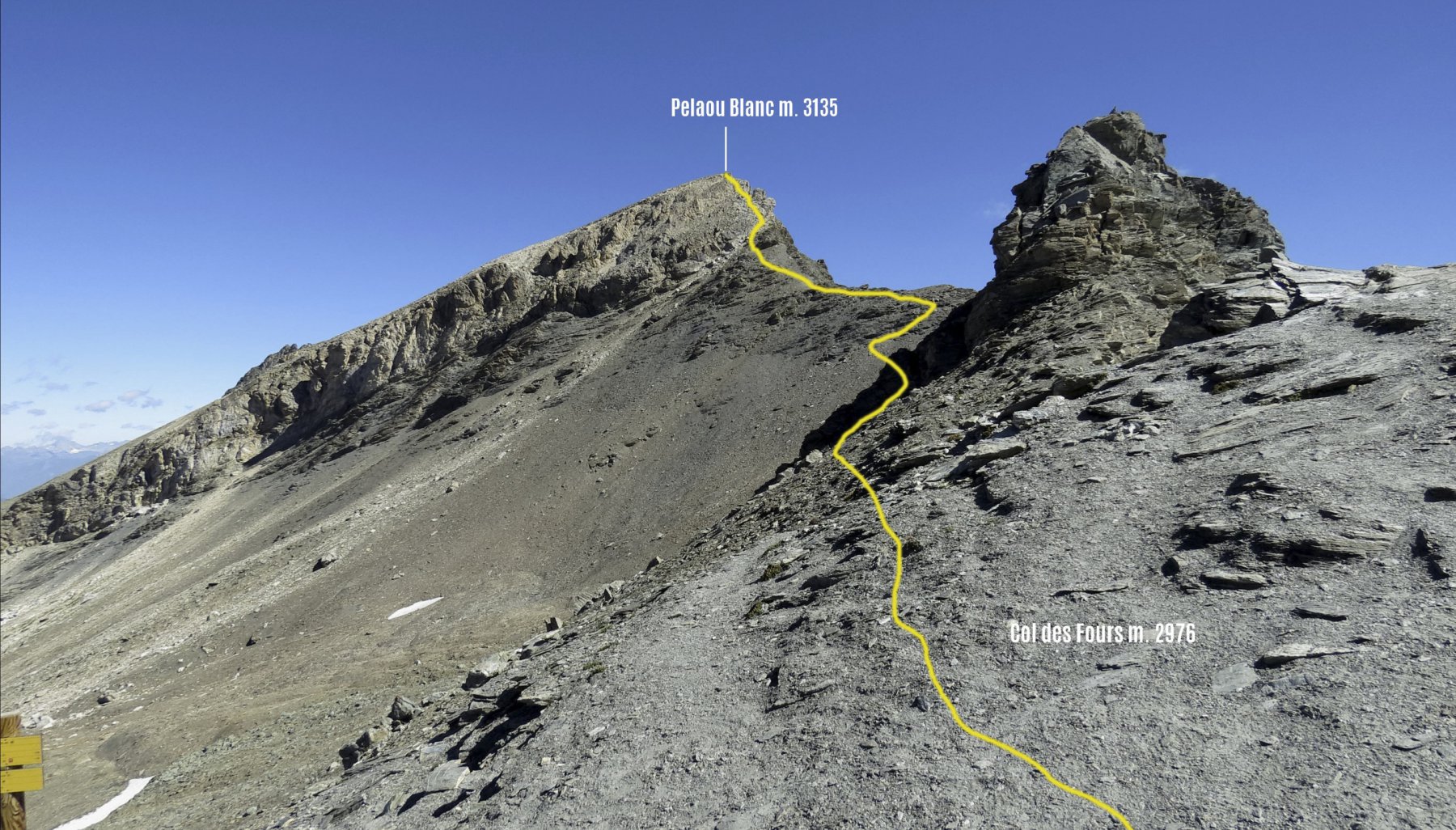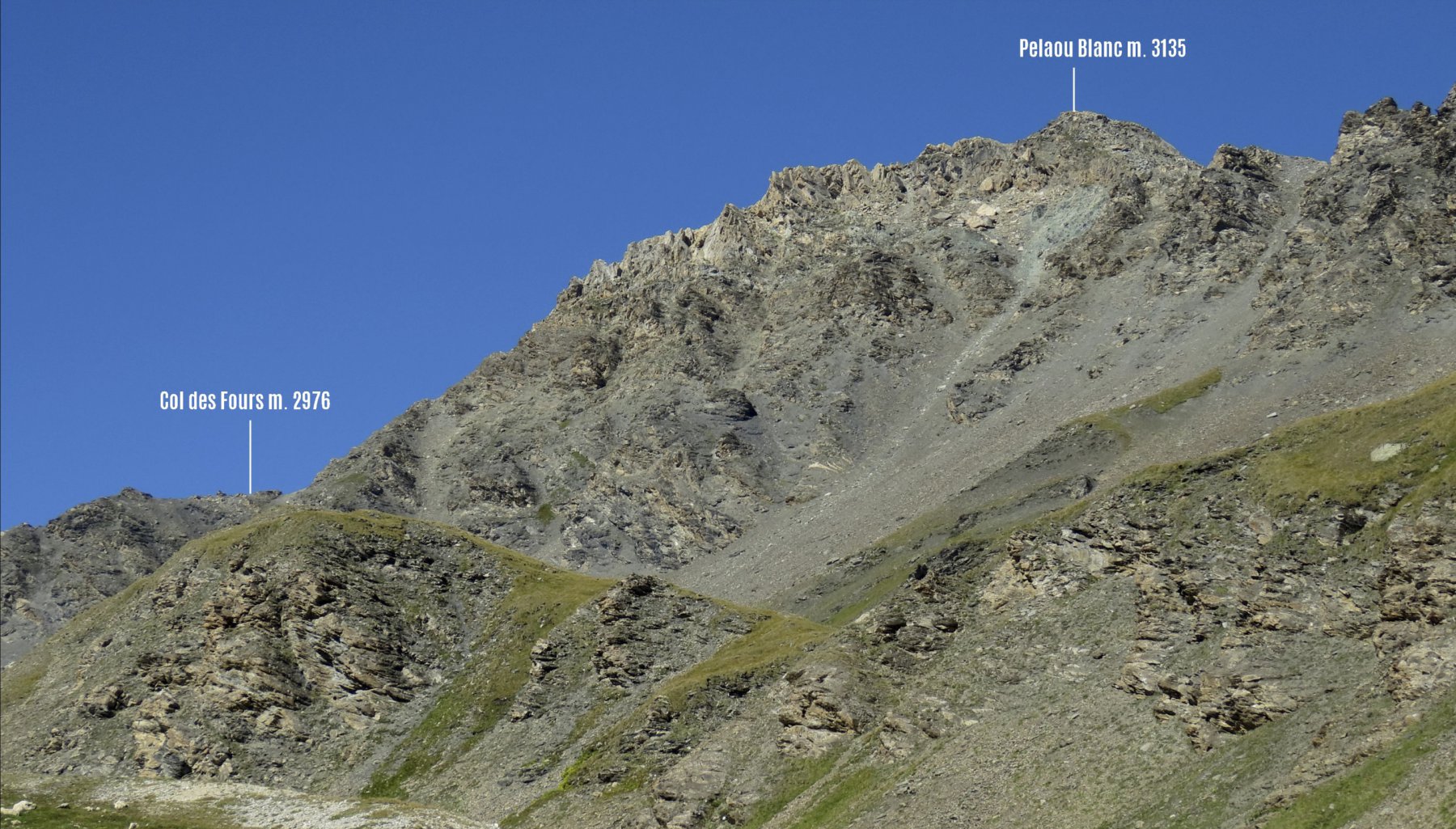 Dal pont de la Neige,seguire il sent.con palina per il col des Fours 2976 m 1.40 min(con passo non velocissimo 1 oretta circa)passando a sx di un laghetto in fase di riduzione idrica,un pendio un pò più ripido porta ad una selletta da cui è già visibile il colle caratterizzato da un ometto di enormi dimensioni,mentre sulla sx è ben visibile la Pointe nord De Bezin.10 min circa si arriva al colle spartiacque col vallone des Fours,in 45’di discesa si arriva all’omonimo rif. 2537 m.non visibile dal colle.Si volge a sx su buona traccia appena sotto la cresta e in circa una ventina di minuti si è sulla Pointe des Fours 3072 m.appena a nord della Bezin.Ritornati al colle si prosegue nella direz.opposta verso il Pelaou Blanc 3135 m.Il sentiero arriva fino in cima.L’ultima parte sembra un pò arcinia ma a parte un brevissimo tratto di un paio di metri in cui si deve fare uso delle mani tutto il resto è facile anche se c’è un pò di esposizione sulla ds.Panorama completo sulla Vanoise con la Gran Casse e la Gran Motte di fronte,Il Monte Bianco La Gran Sassiere la Tzanteleina la Granta Parey la Galisia la Grivola e persino uno spicchio di Monte Rosa.A sud tutto lo spartiacque con le valli di Lanzo con l’Albaron in bella evidenza.