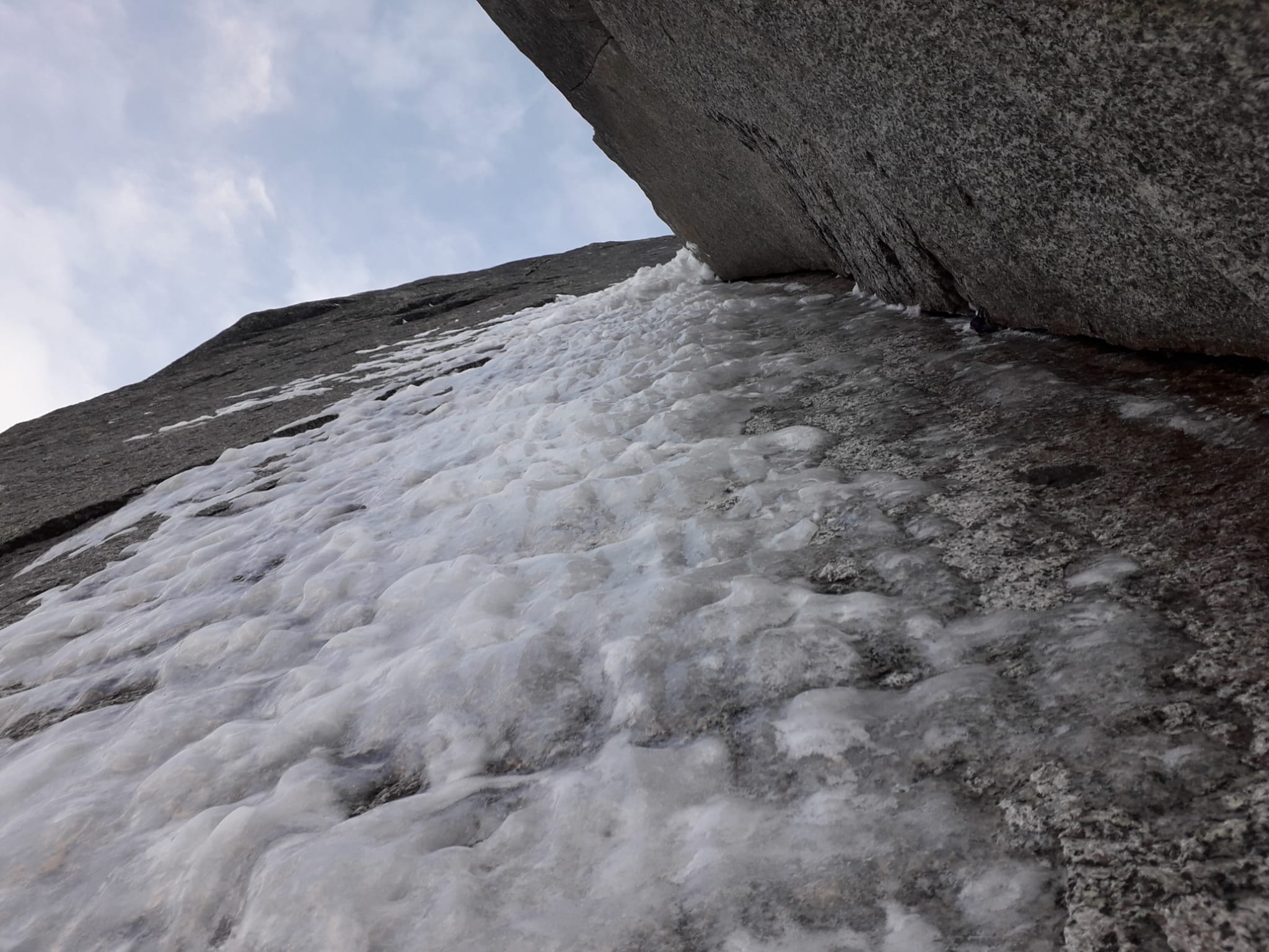L3- puntare al diedro. Alla base di esso si può fare sosta con micro e nut, altrimenti proseguire nel diedro per 6/7 metri, fino ad arrivare a sosta attrezzata (si fa sosta appesi). Anche in questo tiro si fa un po’ di conserva.