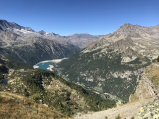 Tenersi a sinistra e continuare fino all’ Alpe Pian Pesse 1871 m dove si riattraversa il torrente da qui ripide risvolte con vista Diga e Levanne fino all’ Alpe Ciarbonera 2055 m; seguire il sentiero fino ai laghi, il primo a quota 2157 m l’ultimo 2246 m.