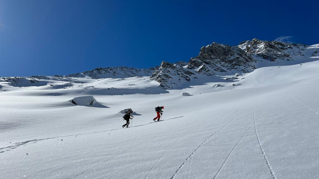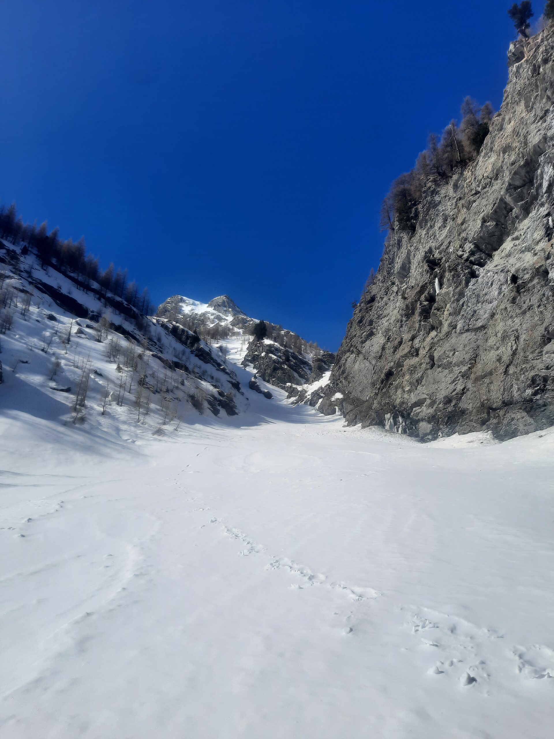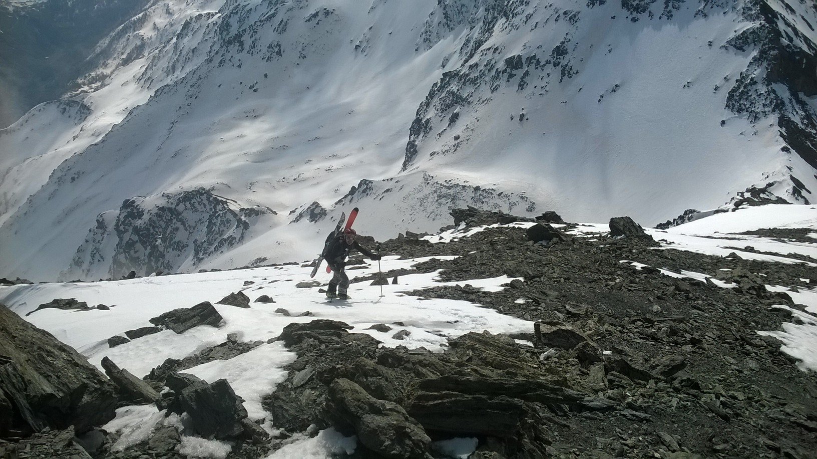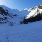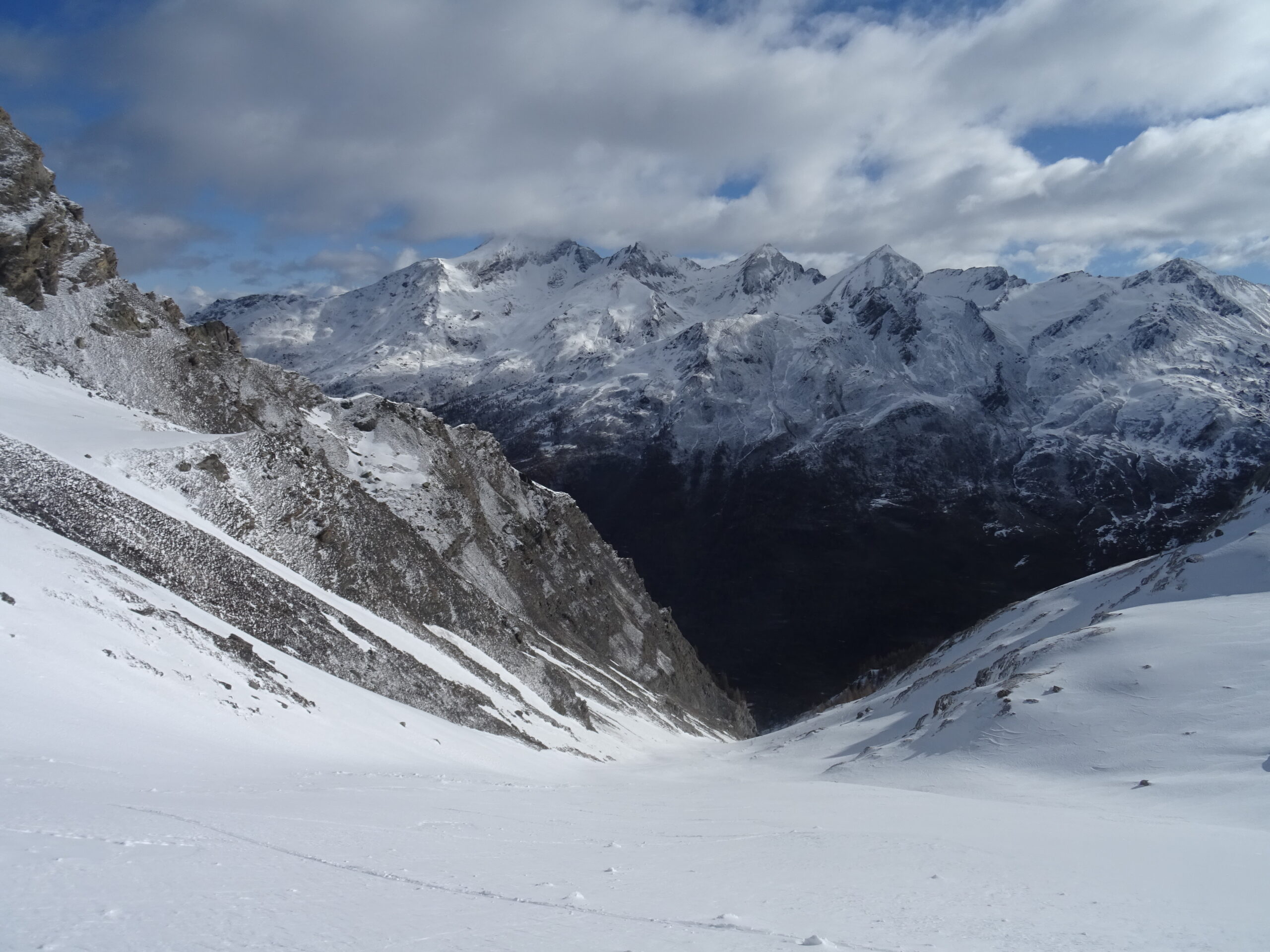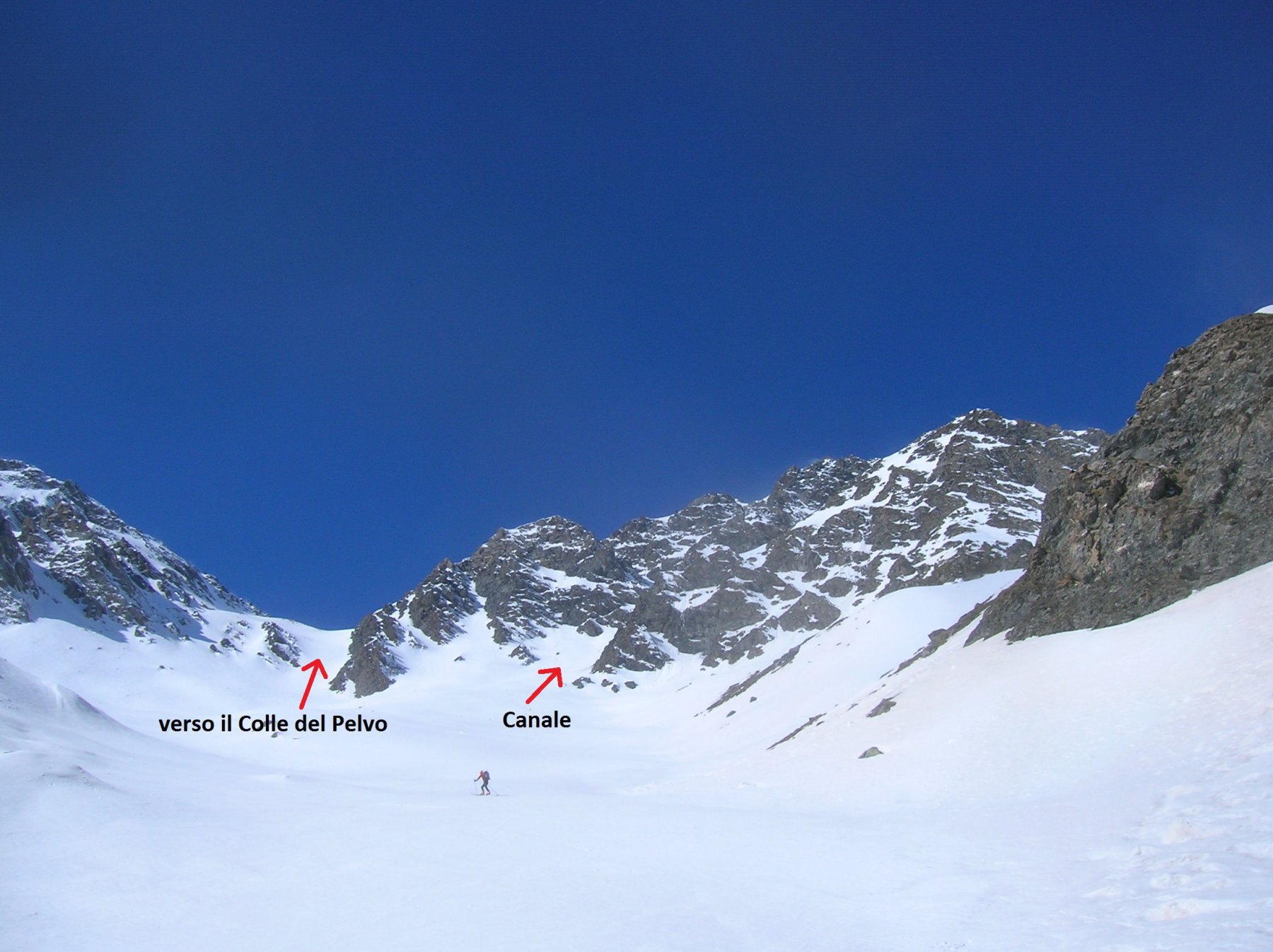 Si segue l’itinerario normale del Pelvo fino a quota 2600. A questo punto risulta evidente a dx l’ampio pendio canale che sale verso ovest. Negli ultimi 300 m la pendenza aumenta fino a superare di poco i 40° verso l’uscita che è a dx. Dalla selletta, andando a sinistra, si arriva alla croce di vetta dopo 100 m. in traverso.