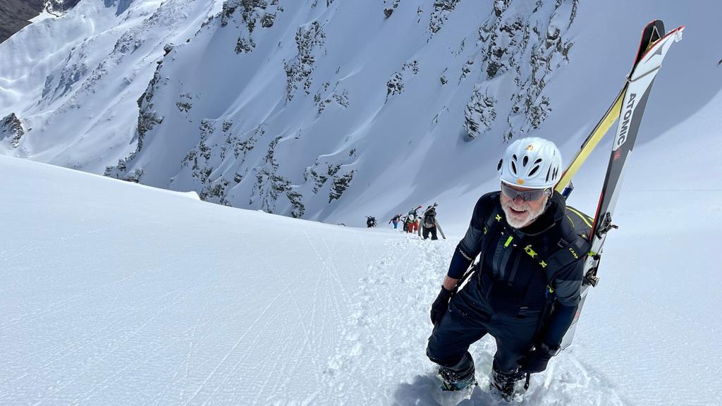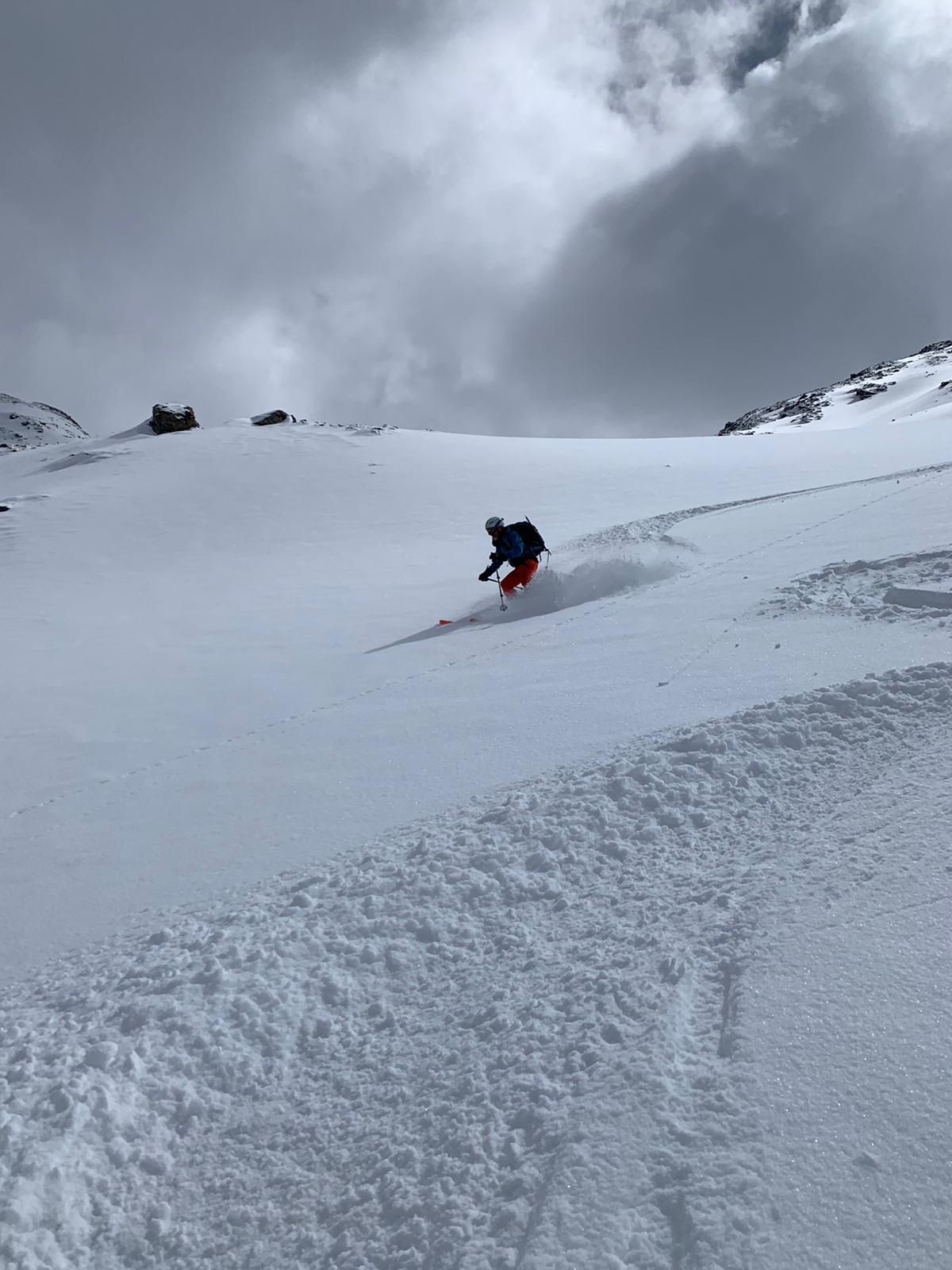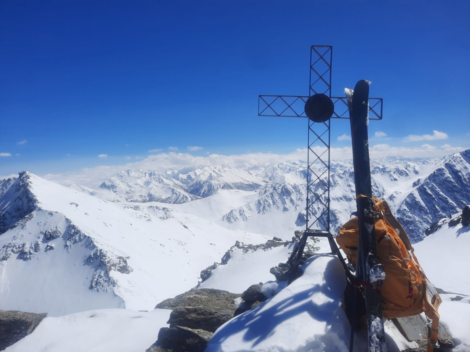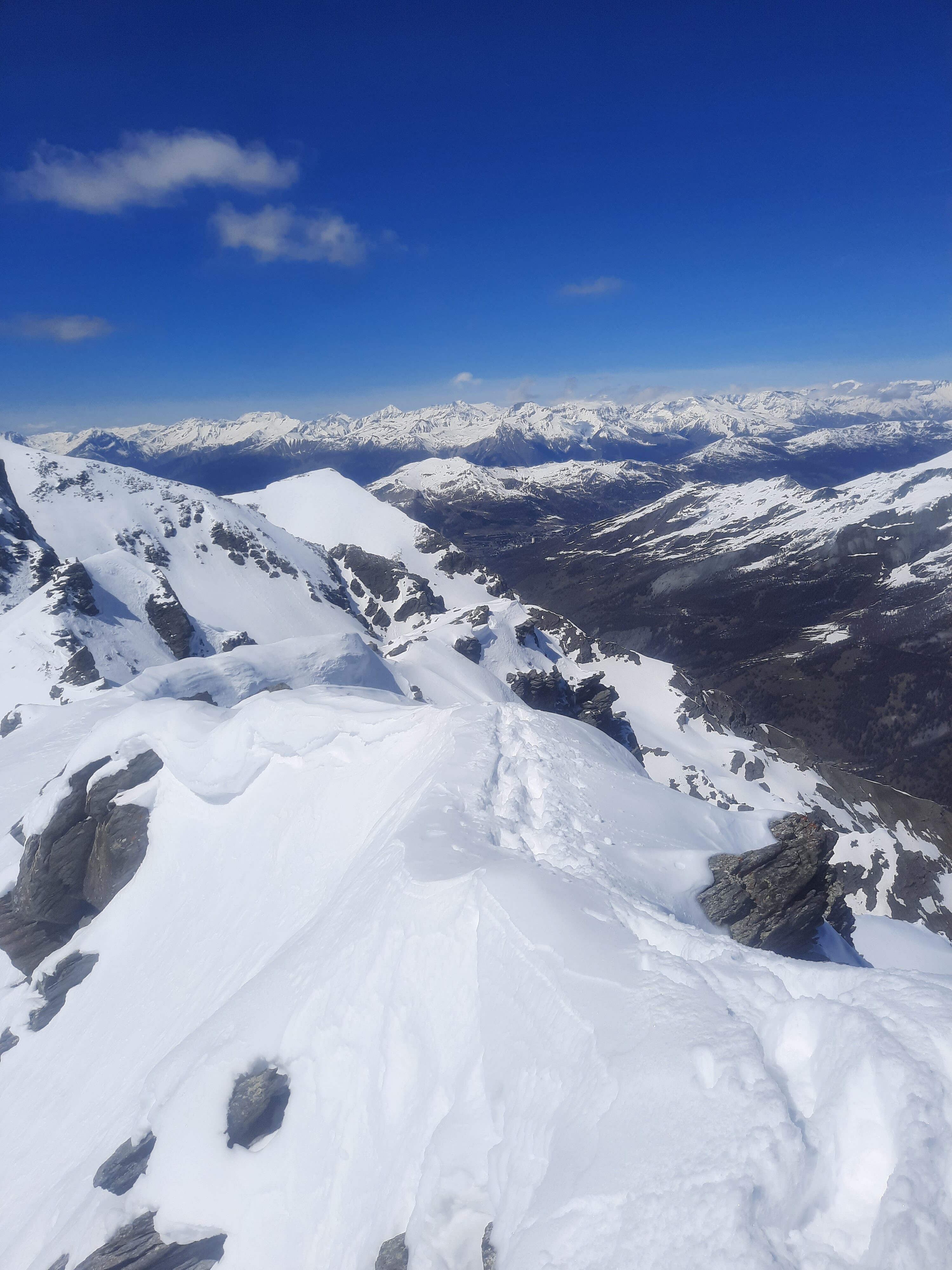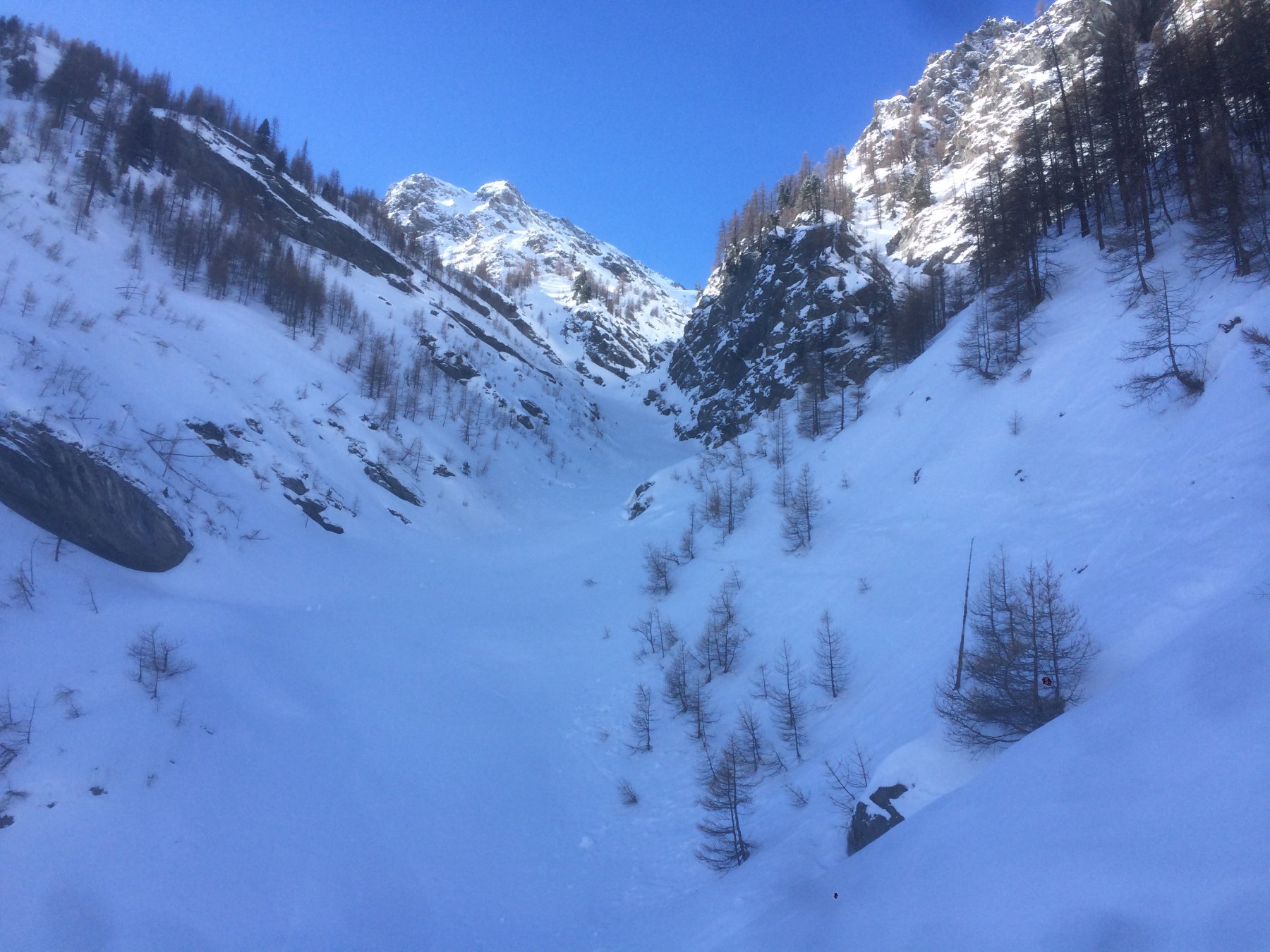 Si segue l’itinerario normale del Pelvo fino a quota 2600. A questo punto risulta evidente a dx l’ampio pendio canale che sale verso ovest. Negli ultimi 300 m la pendenza aumenta fino a superare di poco i 40° verso l’uscita che è a dx. Dalla selletta, andando a sinistra, si arriva alla croce di vetta dopo 100 m. in traverso.