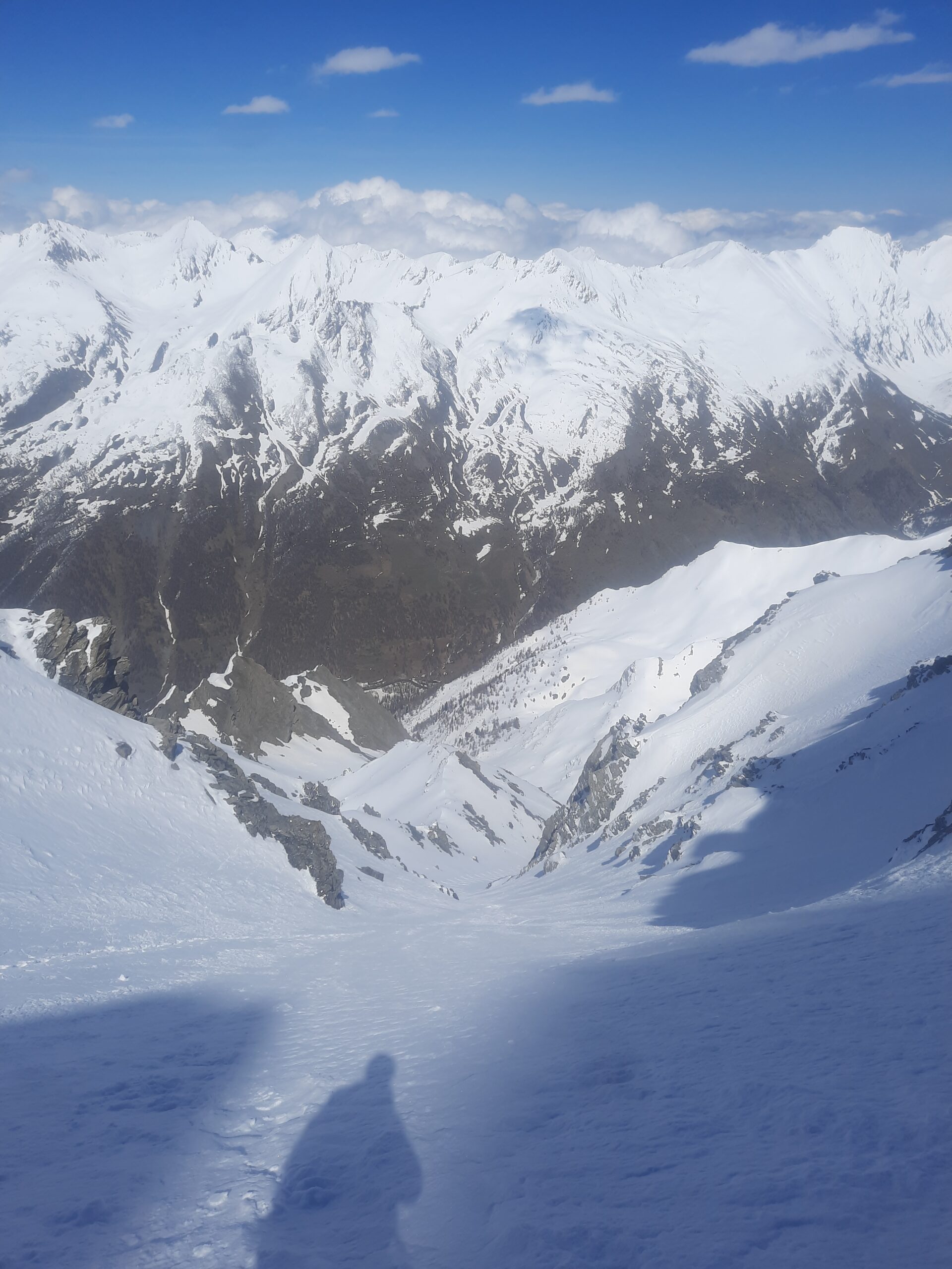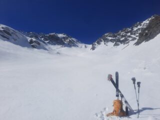 Parte finale del canale piuttosto ripido; l’uscita e’ un po complicata perché c’e’ breve traverso di pochi metri, bello ripido, ma poi, subito dopo delle rocce con passaggio obbligato, piuttosto stretto ed esposto; passato questo si arriva in cresta e di li’ a sinistra, ad una ventina di metri circa, la croce di vetta.