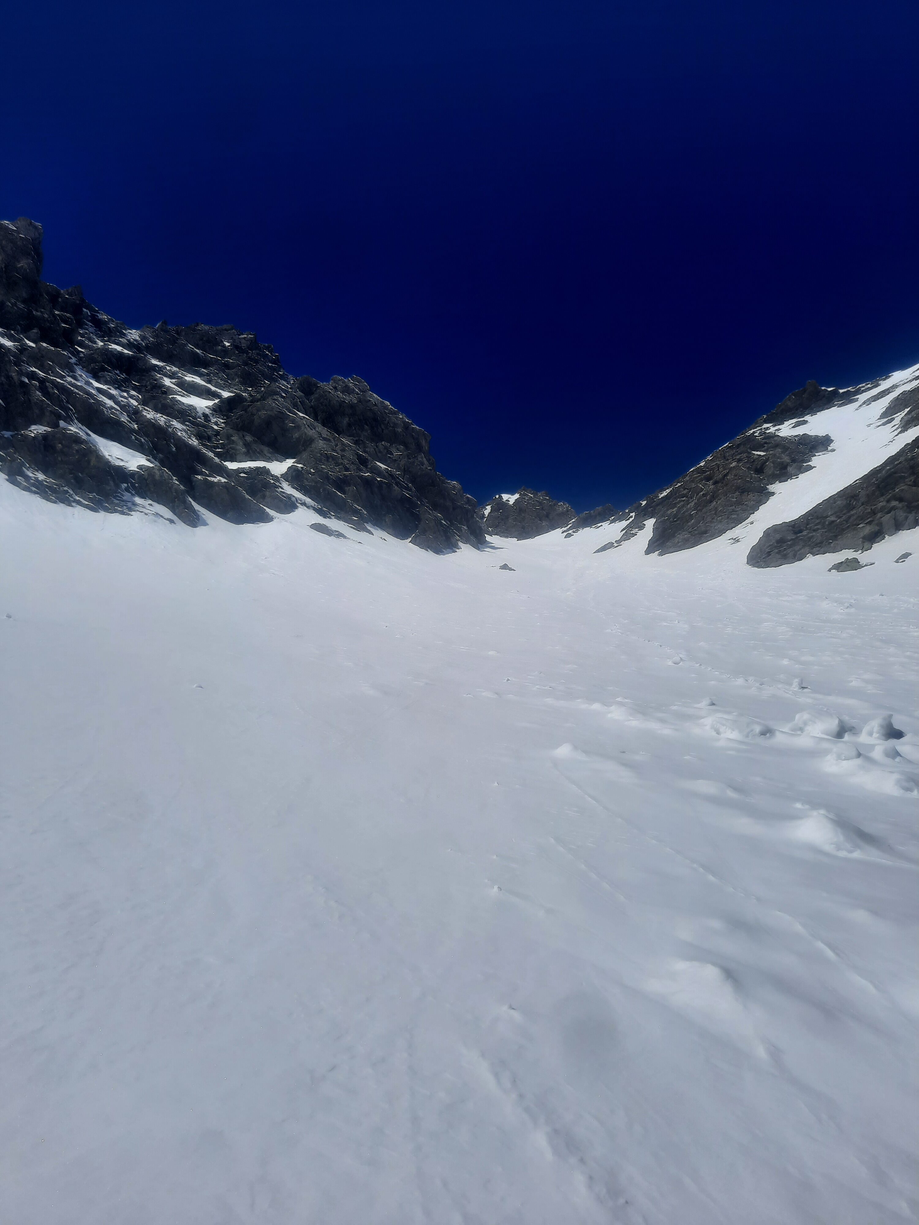 Arrivato alla gorgia c’è un breve tratto scoperto e poi tutto da tracciare; vallone e canale intonsi! Giornata bellissima, niente vento, cielo blu e temperatura freddina ( a ponte Terrible – 3).