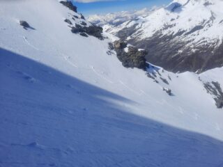 Ho messo gli sci una volta ridisceso il traverso ed il tratto sottostante, troppo ripido per mettere gli sci, poi, subito dopo, è cominciato il divertimento! Neve molto bella, farinosa ventata; ogni tanto si toccava il fondo duro con piccole scariche di neve ma niente di che.
