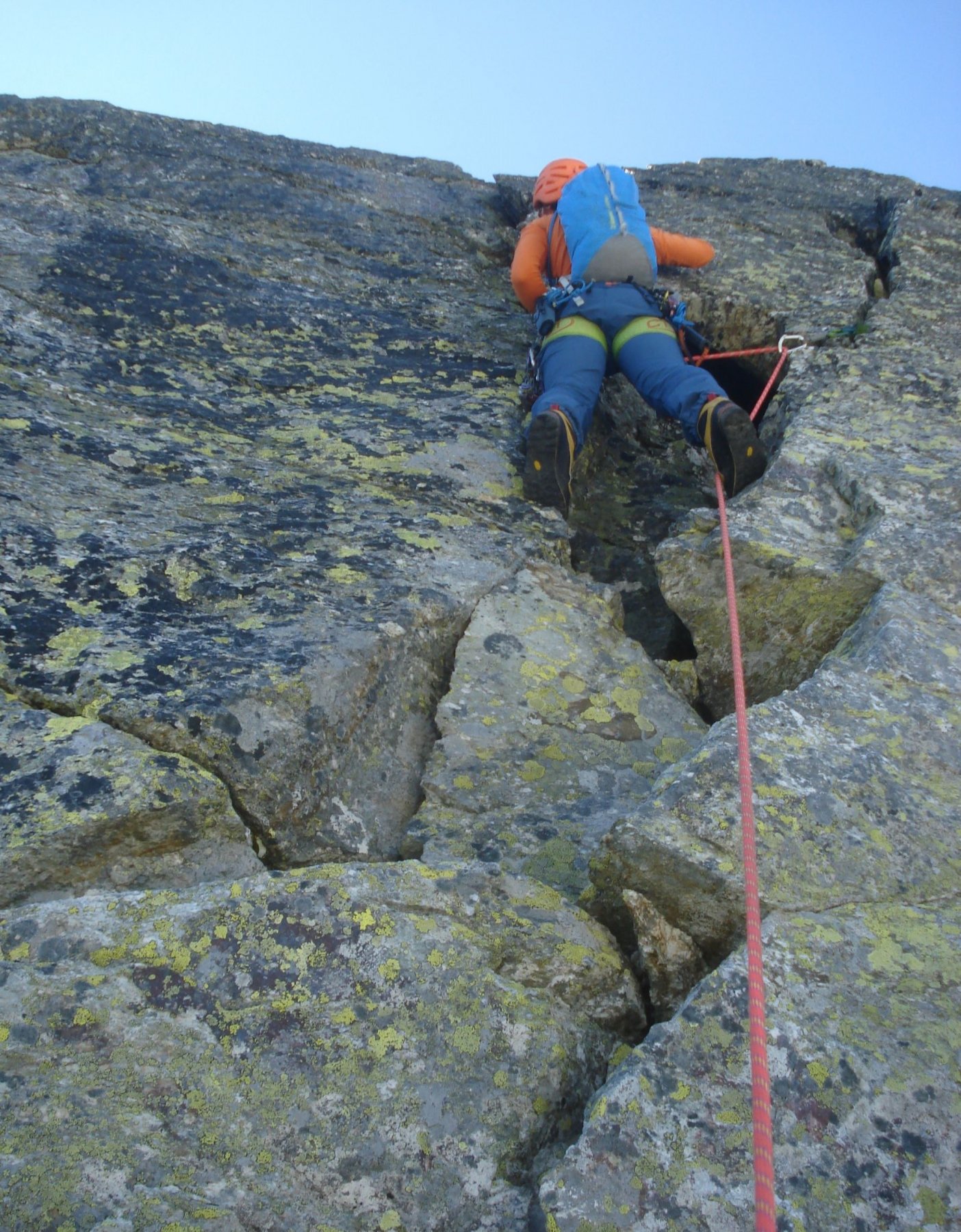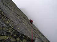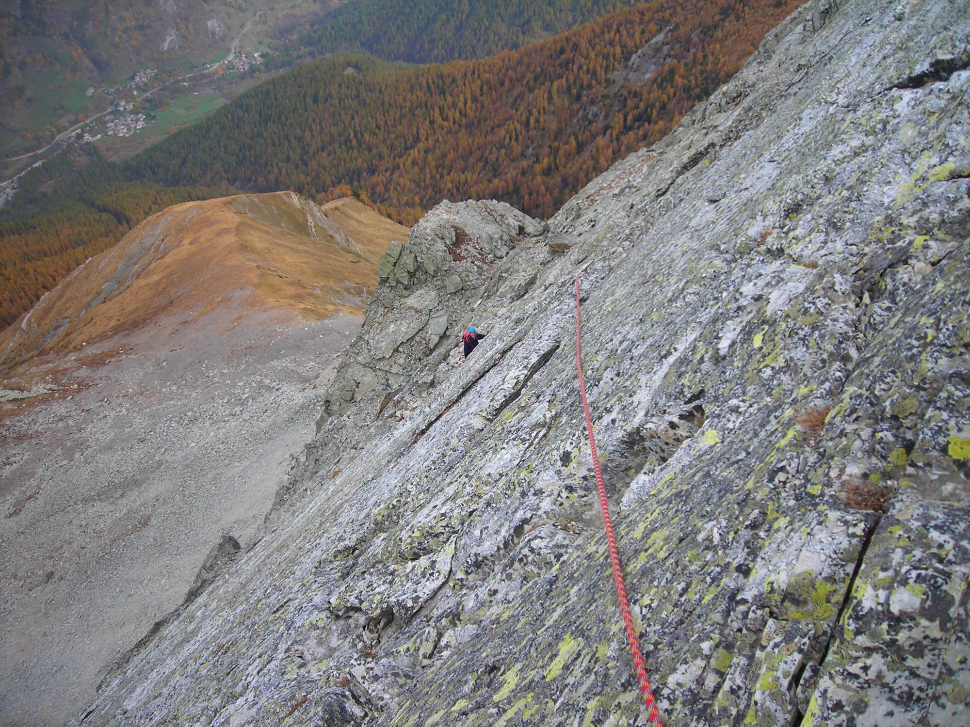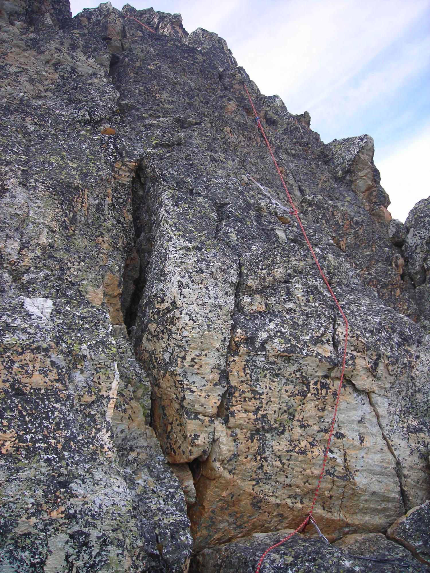L5: scalare la fessura seguendone il ramo sinistro, ben più facile, e ignorare il ramo di destra, dove compaiono un cordino attorno ad una pietra incastrata ma mobile (!) e più su un chiodo, ben più impegnativo; il ramo di sinistra è sprotetto, ma proteggibile a friend; al termine della fessura portarsi su una cengia un più in alto a destra, dove si reperisce la sosta (ch.+fix), 4+, 20 m.