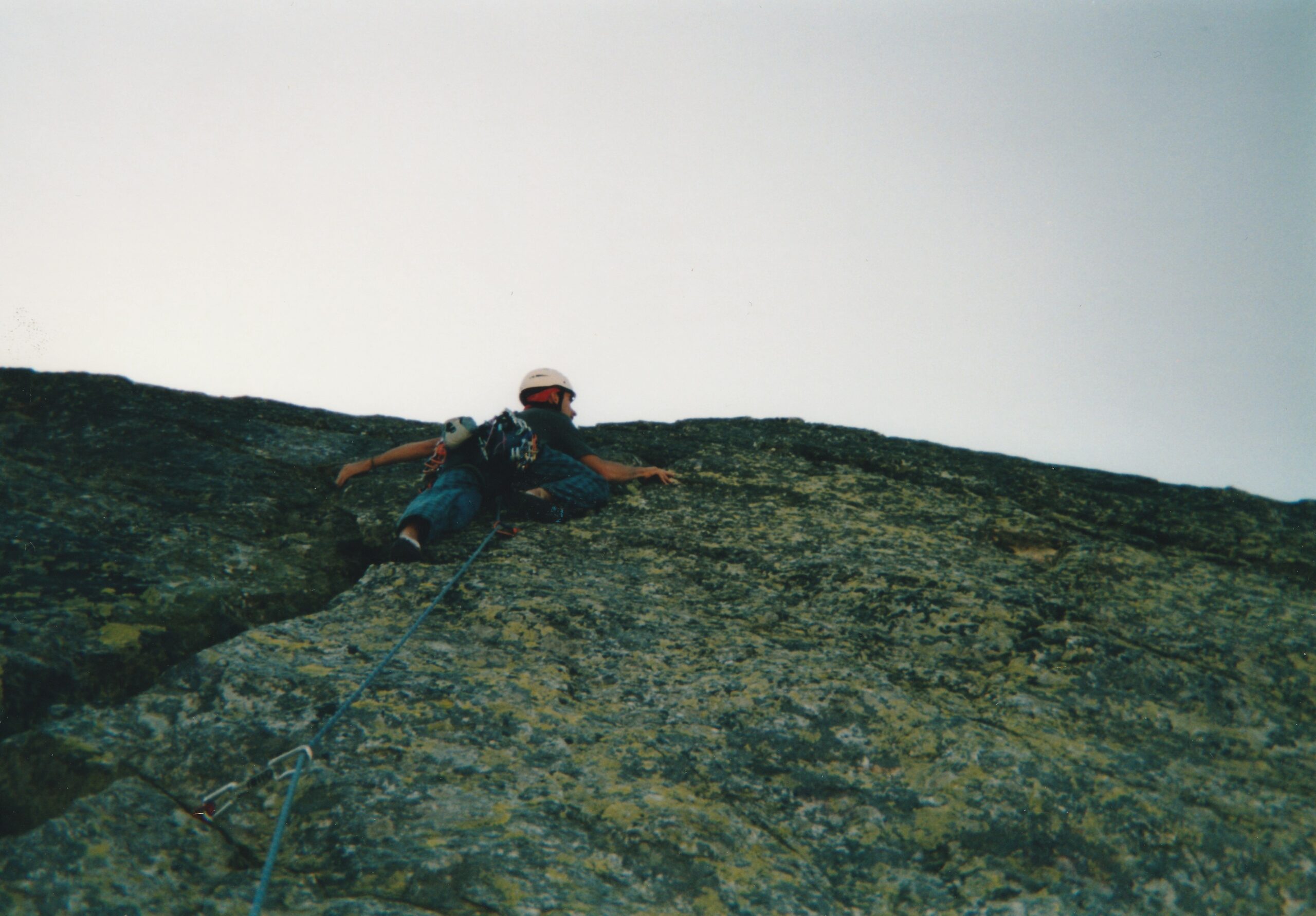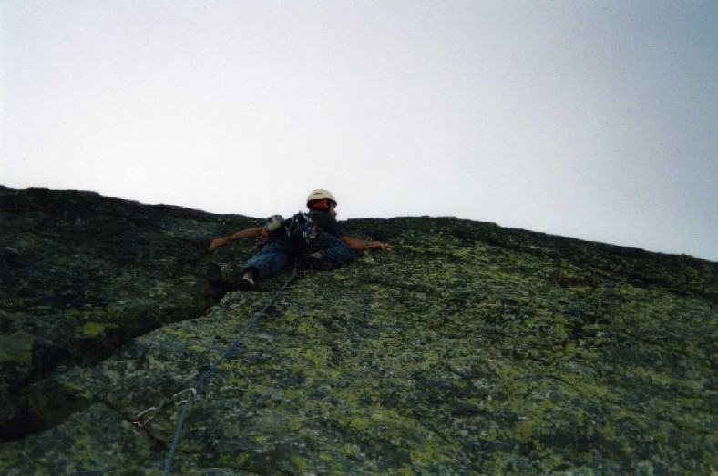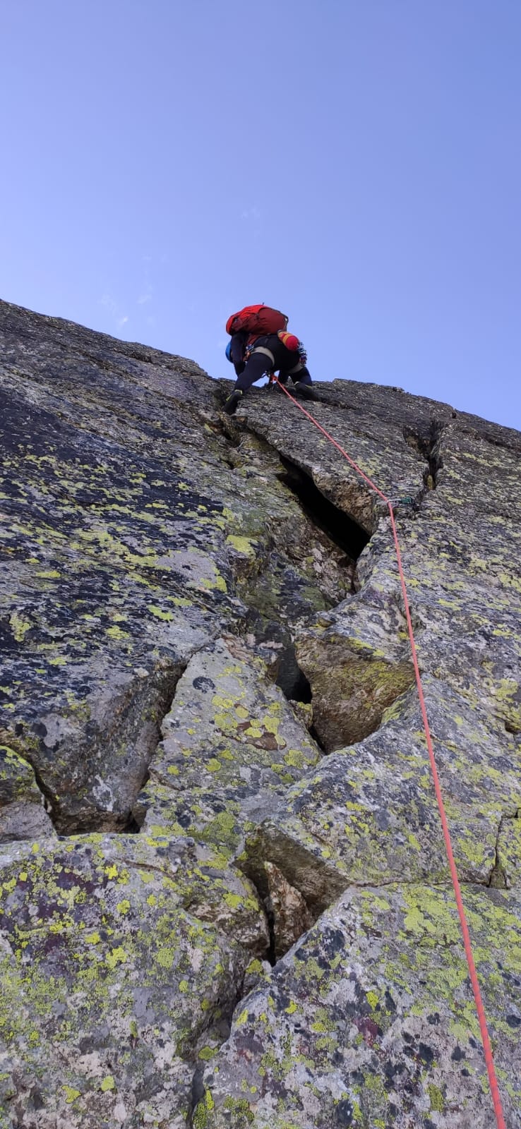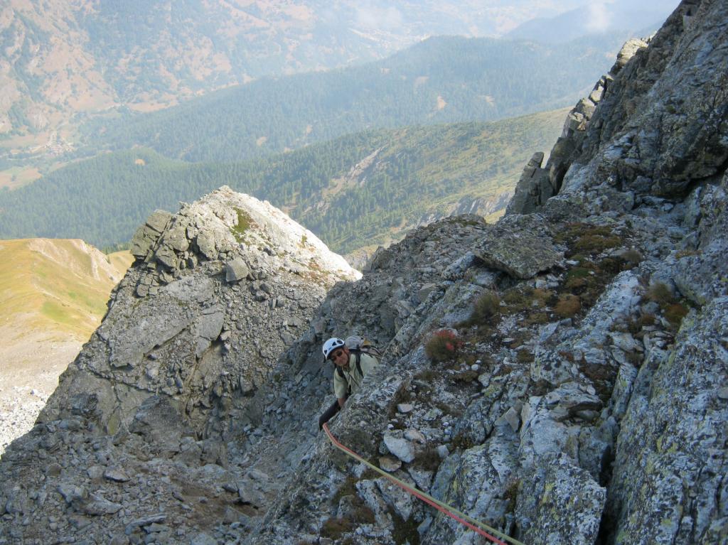 L5: scalare la fessura seguendone il ramo sinistro, ben più facile, e ignorare il ramo di destra, dove compaiono un cordino attorno ad una pietra incastrata ma mobile (!) e più su un chiodo, ben più impegnativo; il ramo di sinistra è sprotetto, ma proteggibile a friend; al termine della fessura portarsi su una cengia un più in alto a destra, dove si reperisce la sosta (ch.+fix), 4+, 20 m.