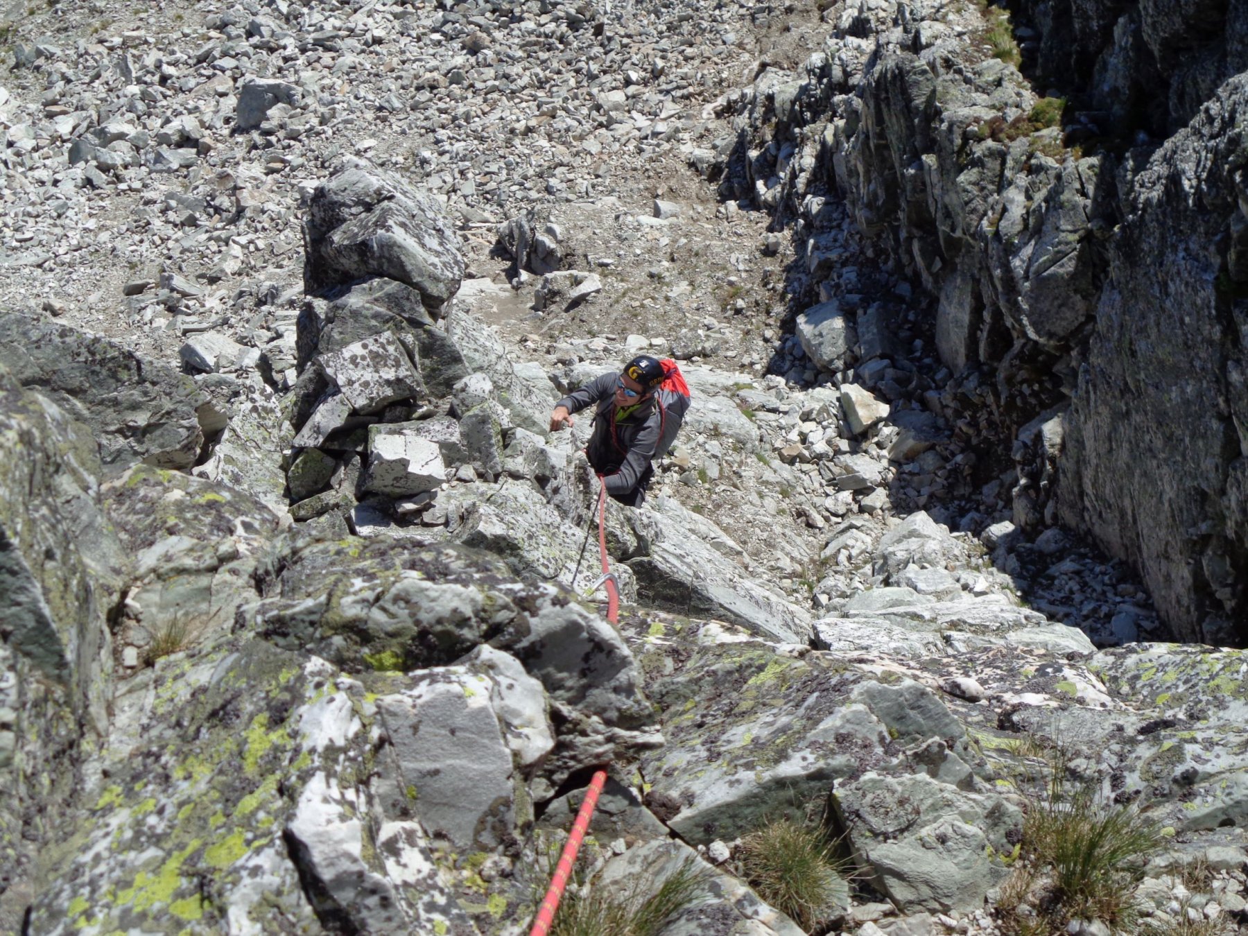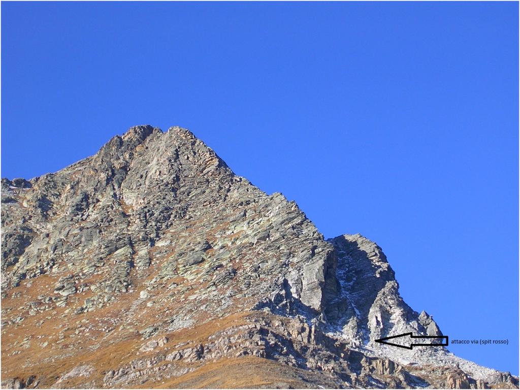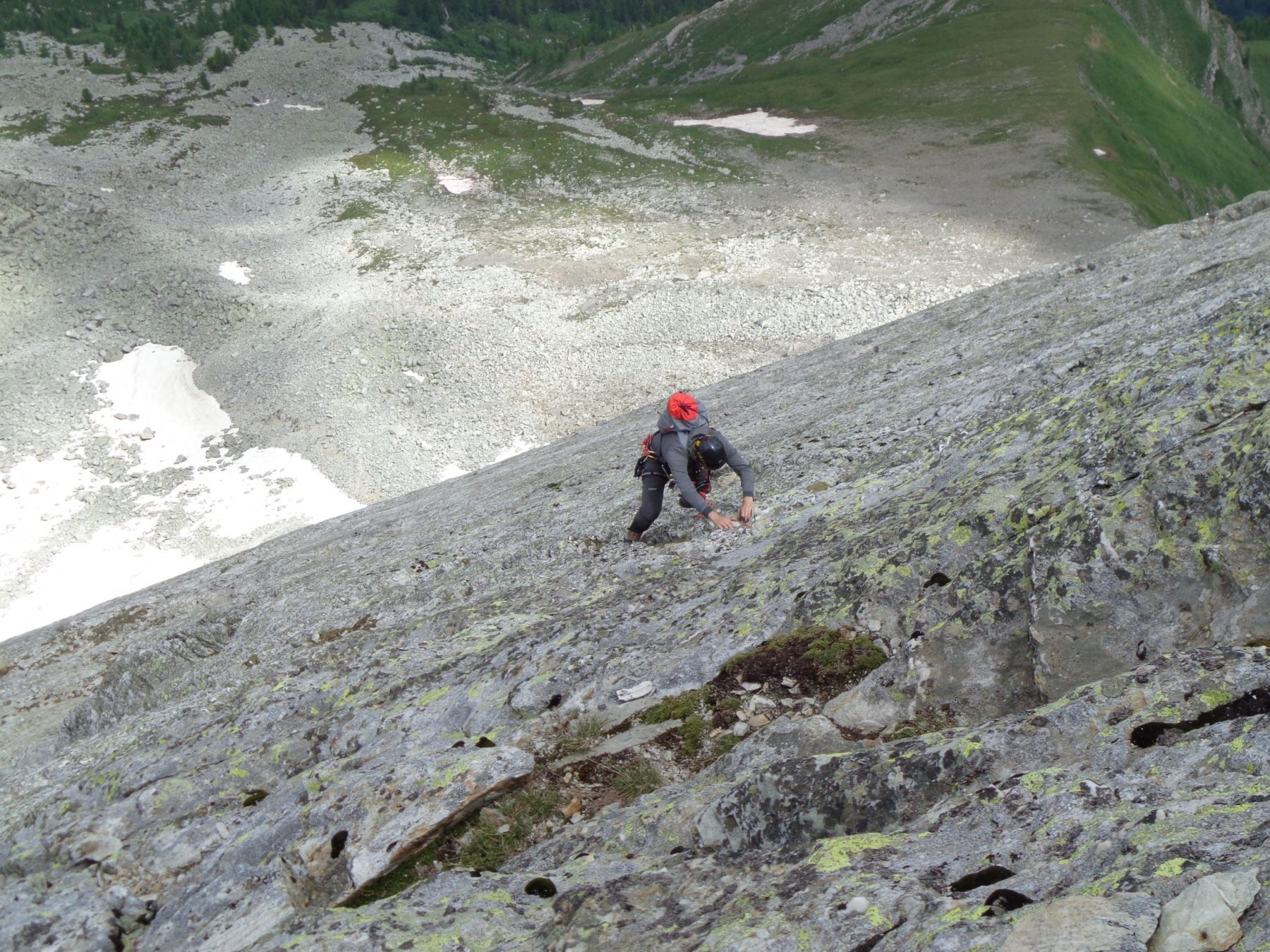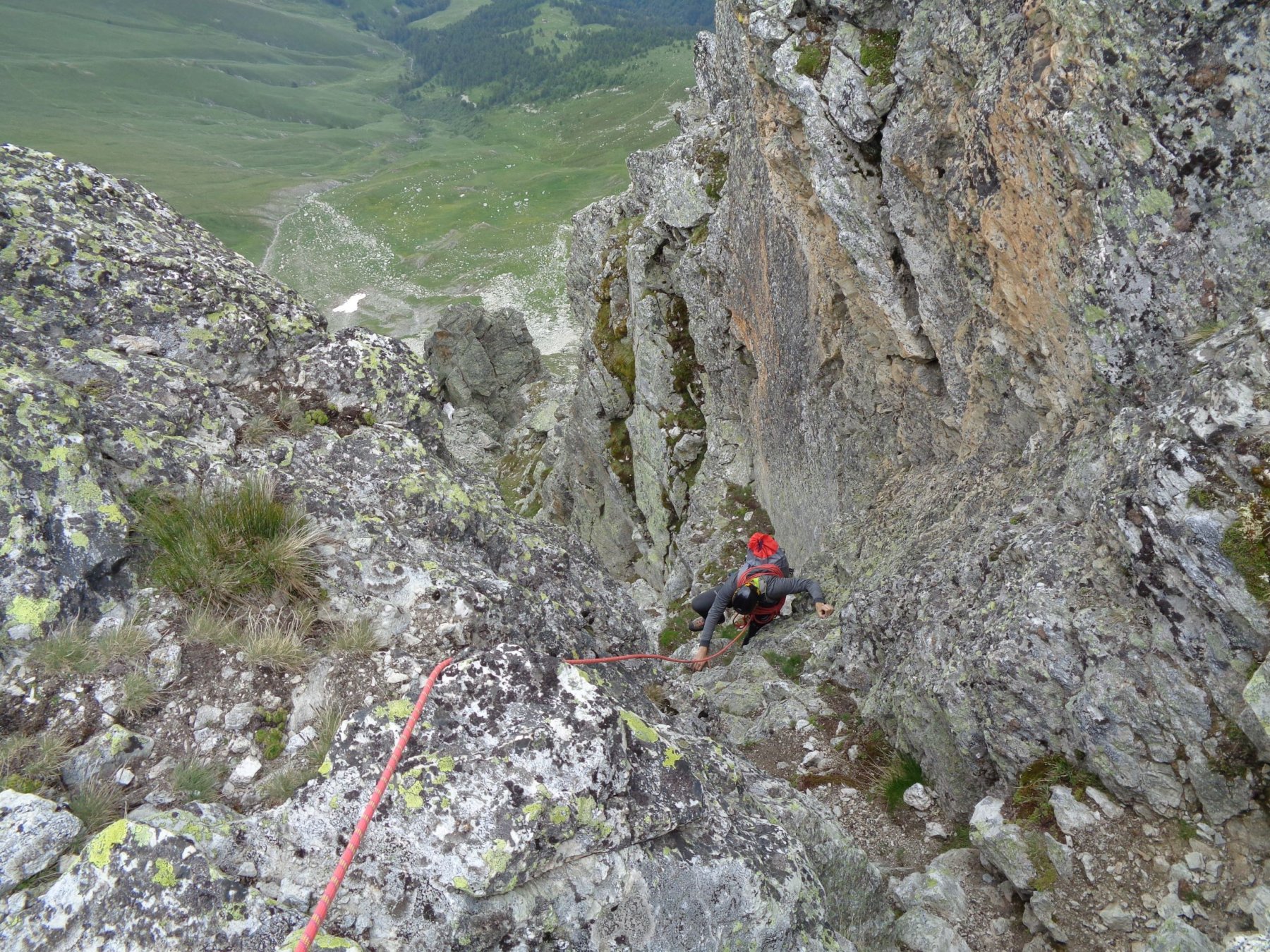 Dalla forcella, traversando a sx per cengia erbosa, entrare in un ripido canale di erba e rocce; risalirlo in conserva e brevi tiri sino ad uscire sull’anticima, 80 m, passi di 2° e 3°+. Da lì a piedi proseguire per cresta con qualche passo di 2° fino a reperire la normale che in 10 min porta in vetta al Pelvo.