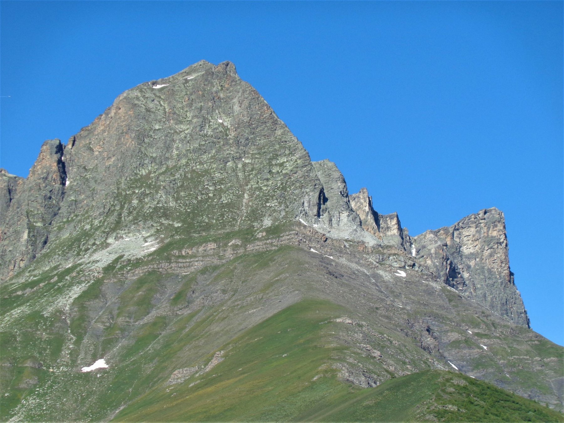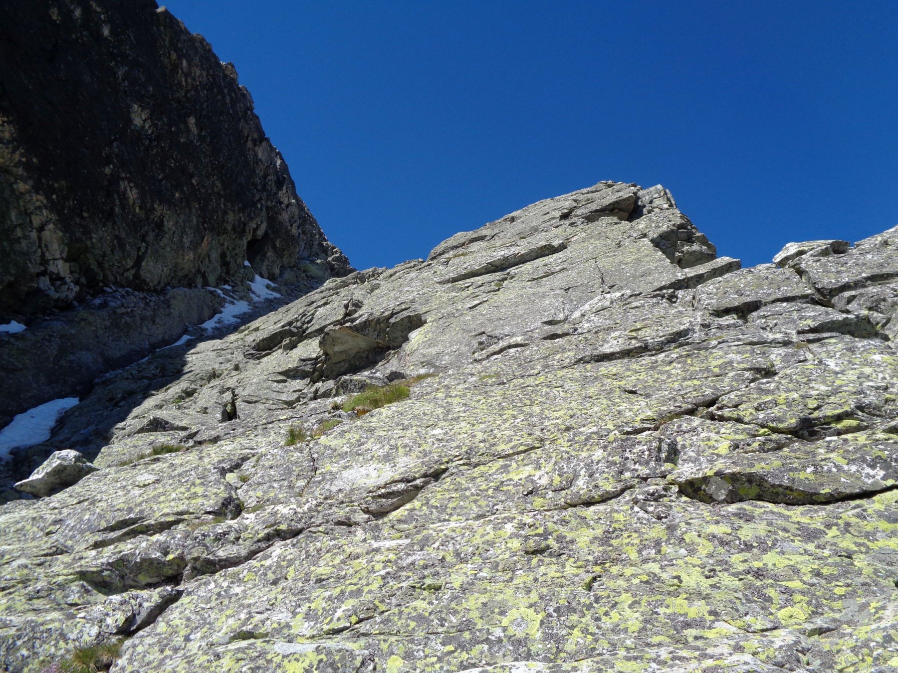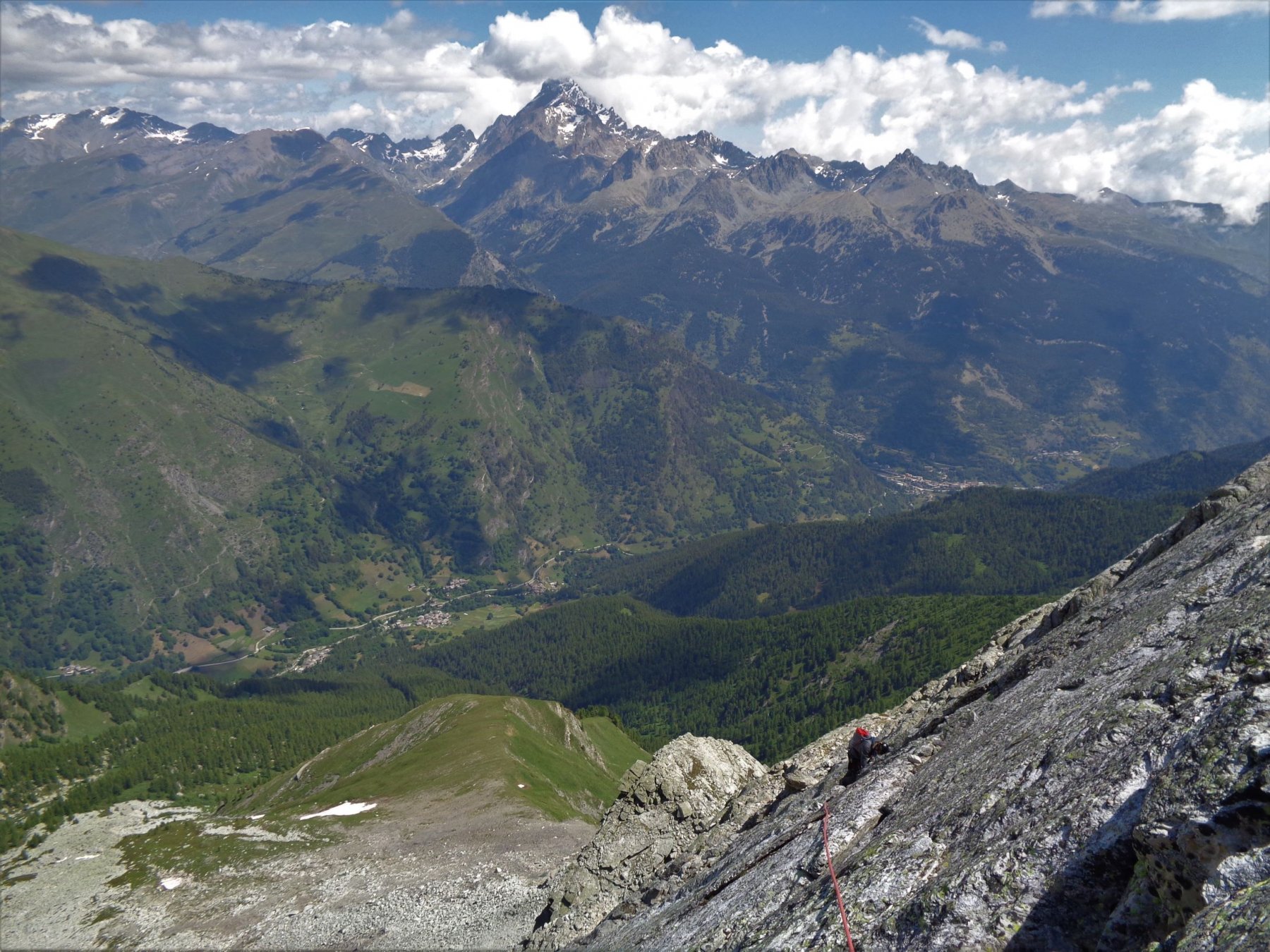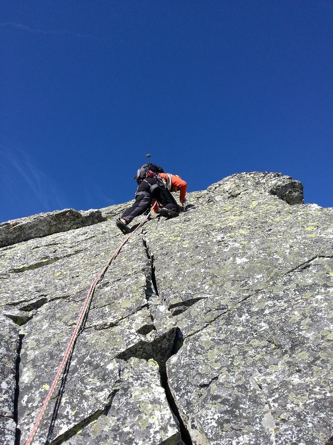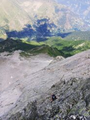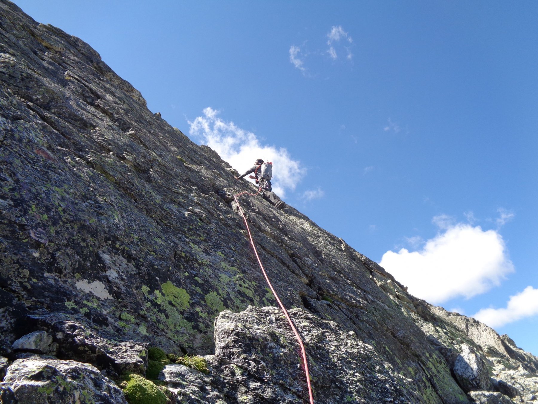 Dalla forcella, traversando a sx per cengia erbosa, entrare in un ripido canale di erba e rocce; risalirlo in conserva e brevi tiri sino ad uscire sull’anticima, 80 m, passi di 2° e 3°+. Da lì a piedi proseguire per cresta con qualche passo di 2° fino a reperire la normale che in 10 min porta in vetta al Pelvo.