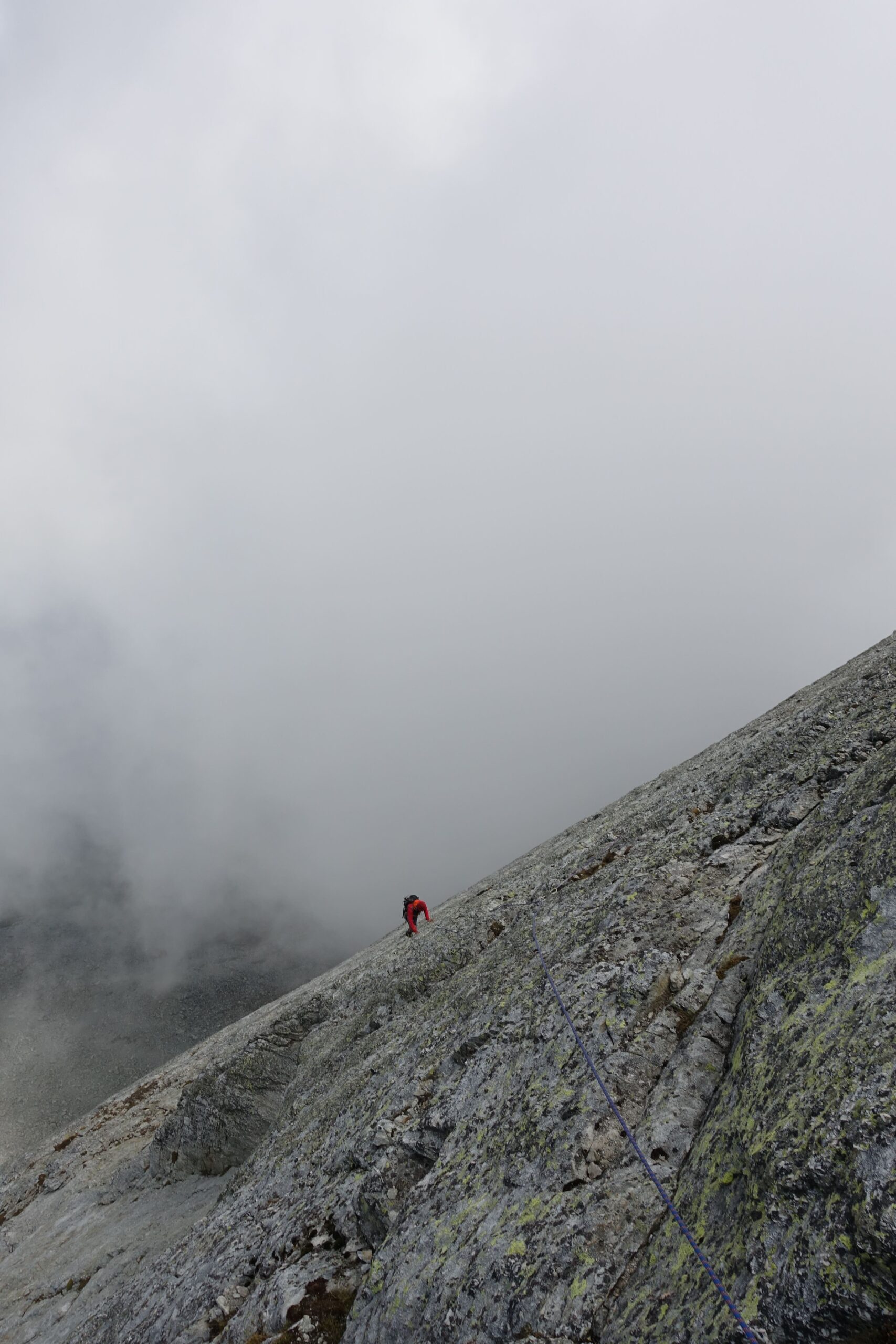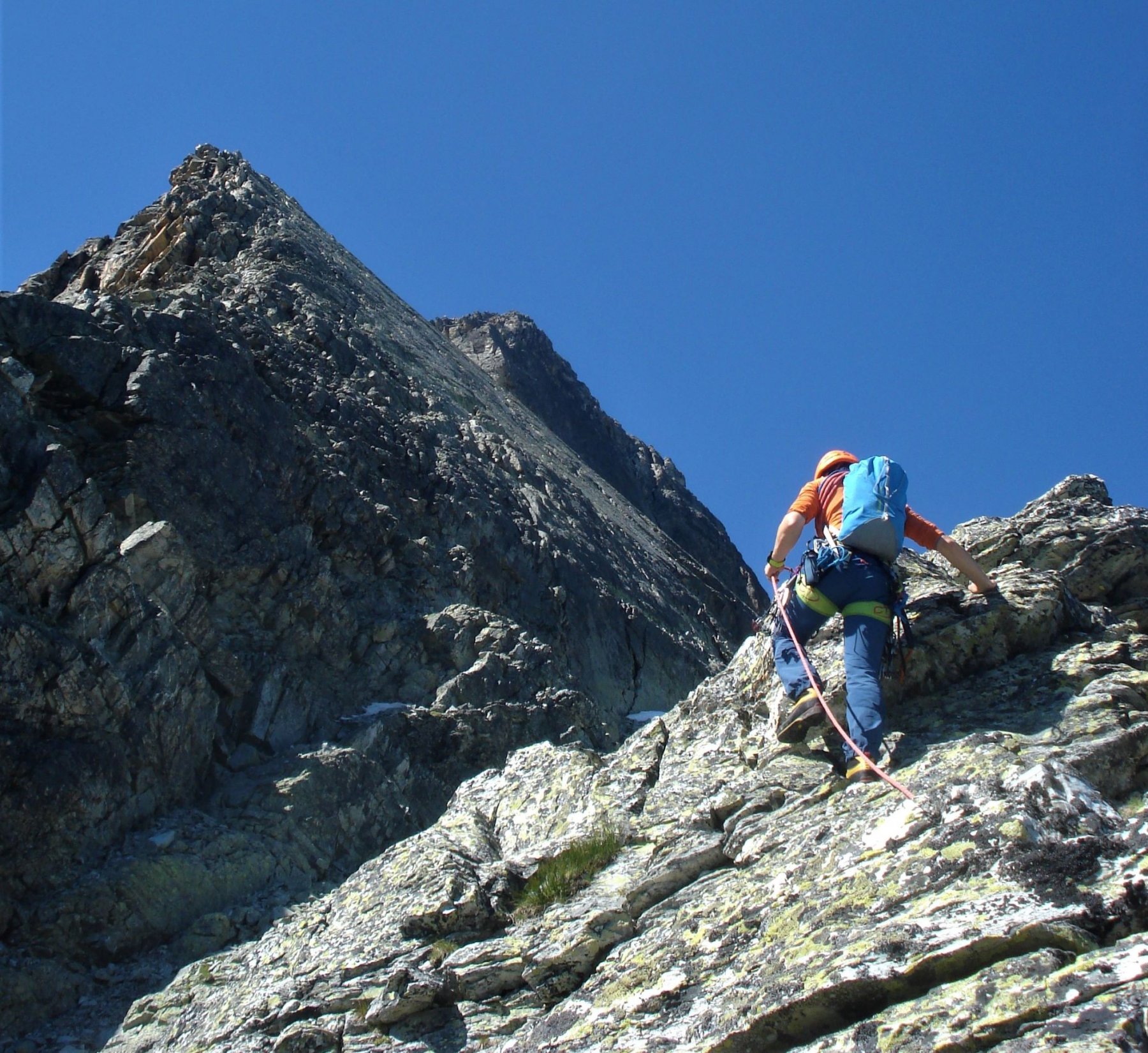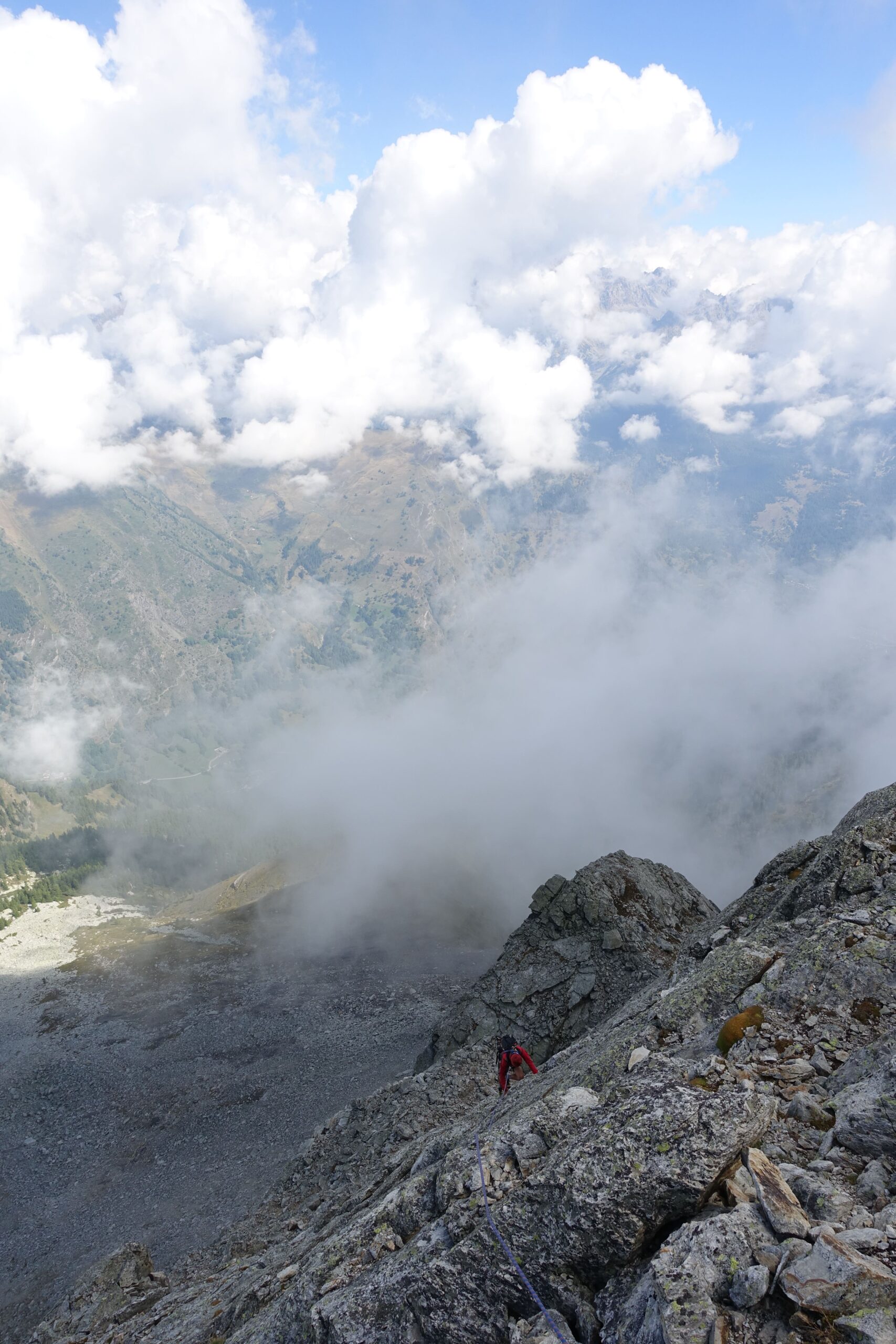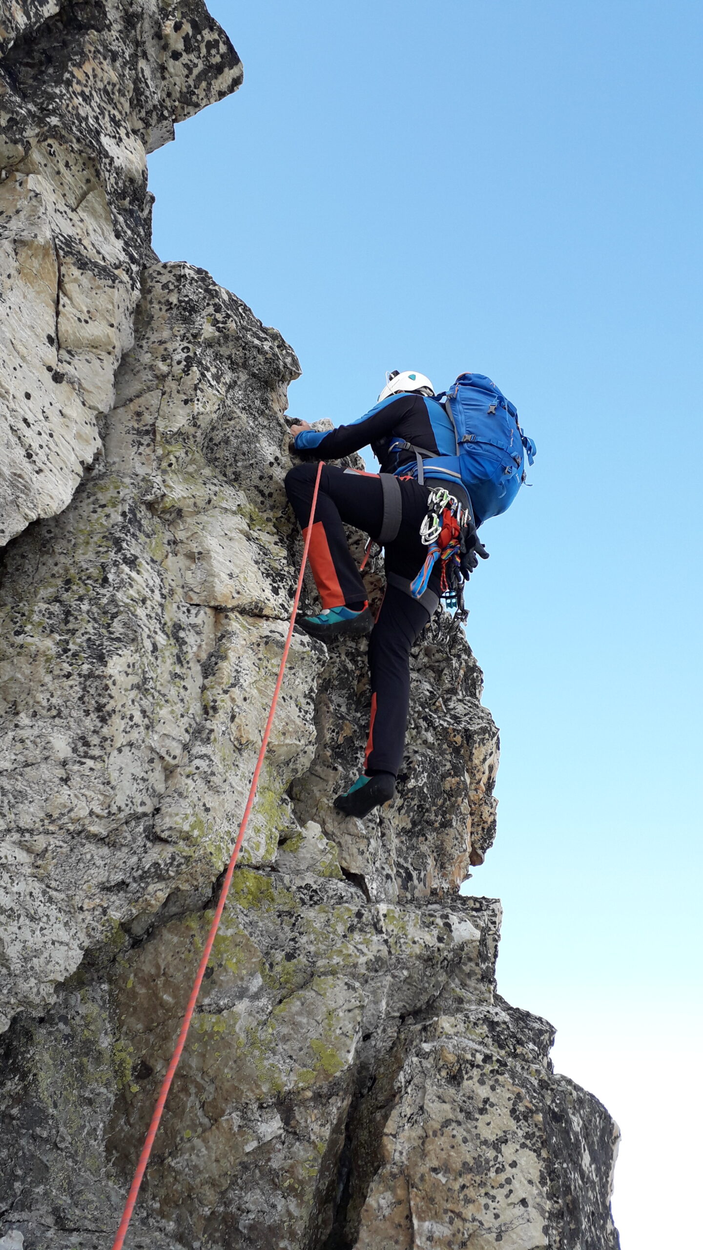 Dalla forcella, traversando a sx per cengia erbosa, entrare in un ripido canale di erba e rocce; risalirlo in conserva e brevi tiri sino ad uscire sull’anticima, 80 m, passi di 2° e 3°+. Da lì a piedi proseguire per cresta con qualche passo di 2° fino a reperire la normale che in 10 min porta in vetta al Pelvo.