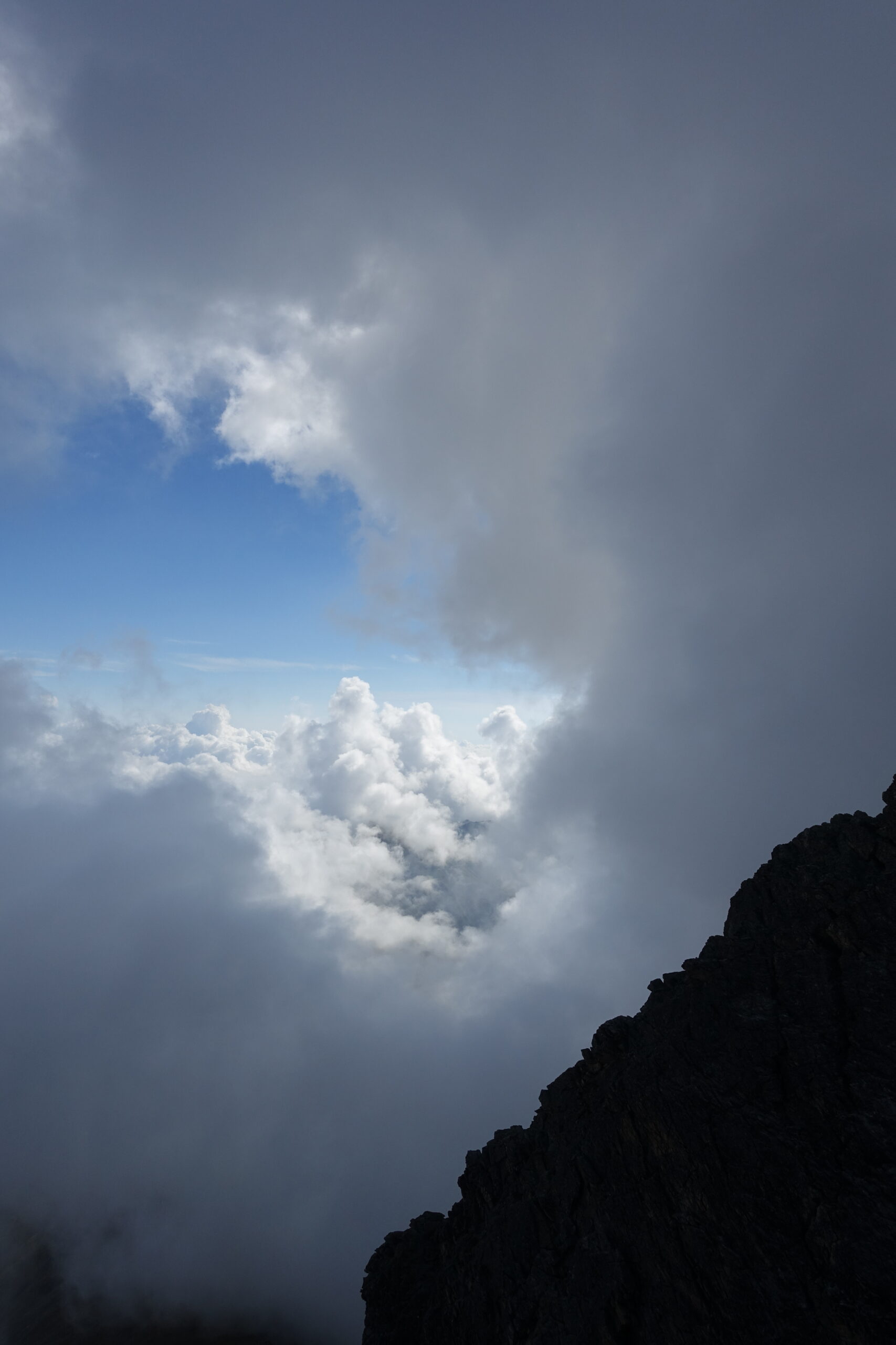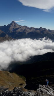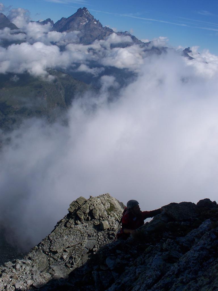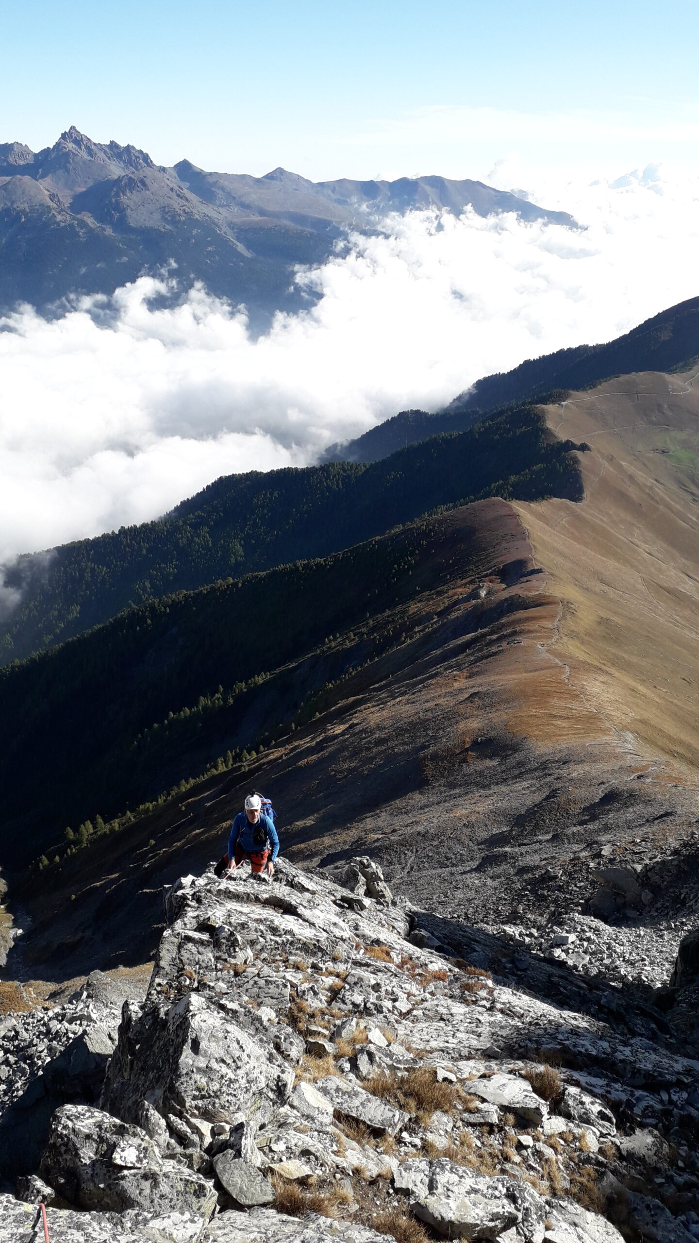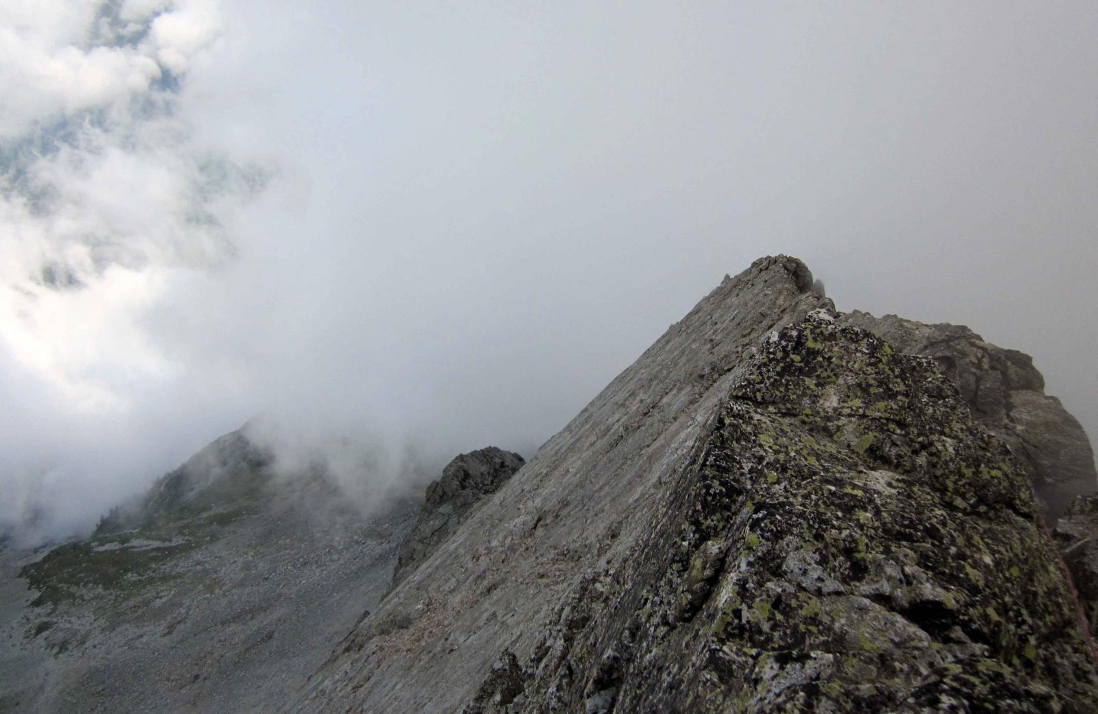 Dalla forcella, traversando a sx per cengia erbosa, entrare in un ripido canale di erba e rocce; risalirlo in conserva e brevi tiri sino ad uscire sull’anticima, 80 m, passi di 2° e 3°+. Da lì a piedi proseguire per cresta con qualche passo di 2° fino a reperire la normale che in 10 min porta in vetta al Pelvo.