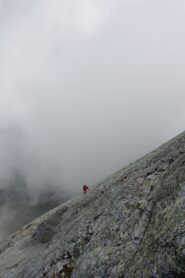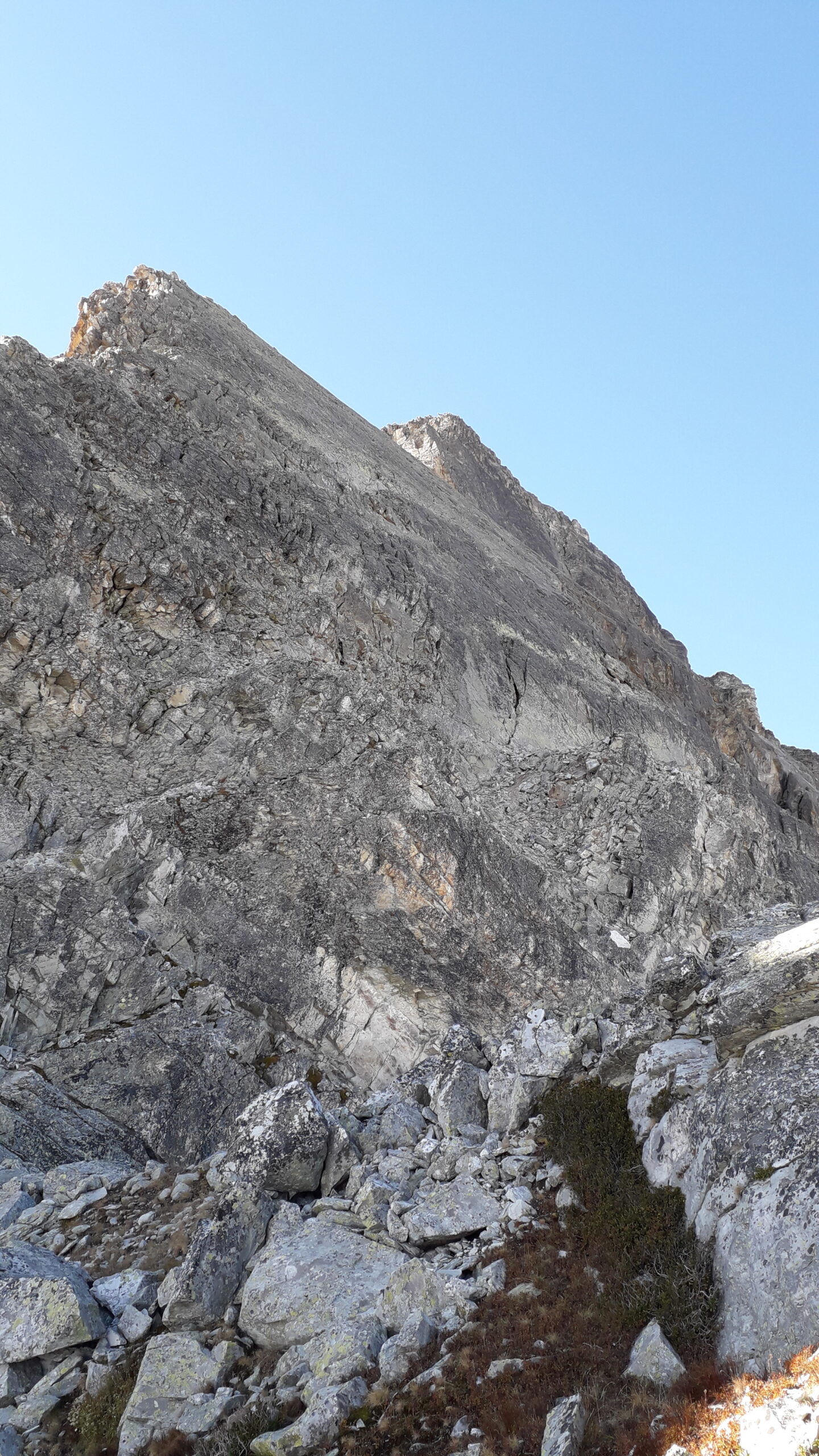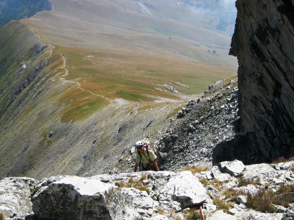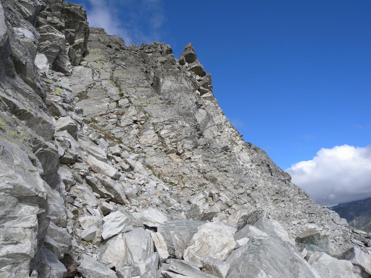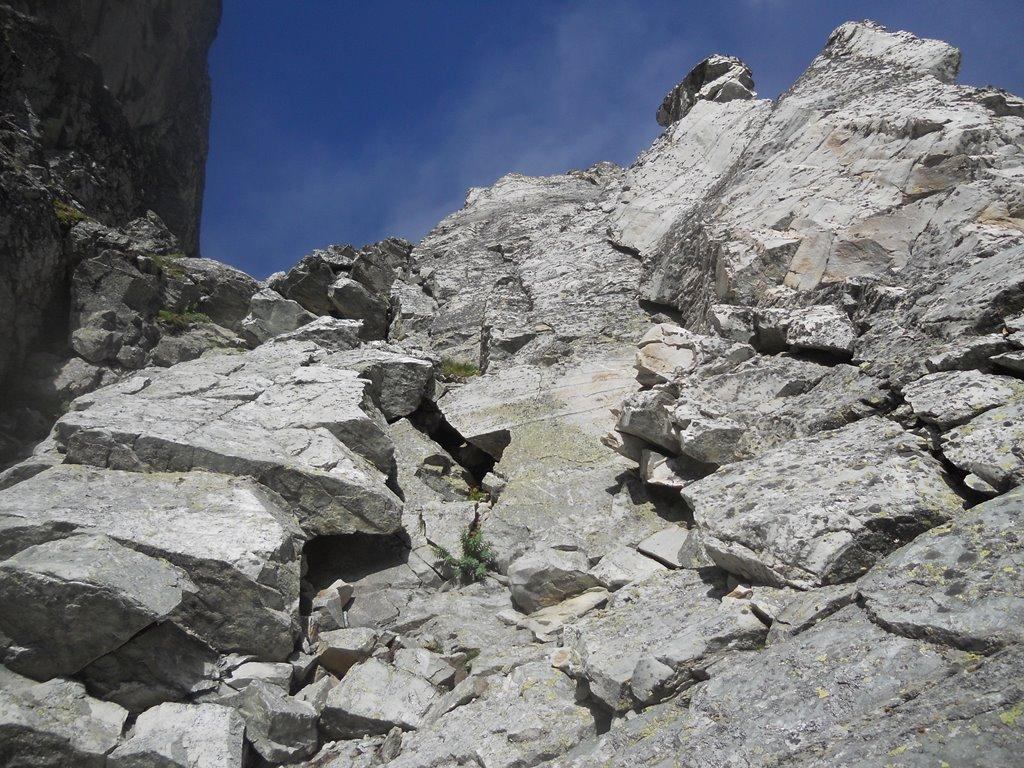 L2/L3: salire il successivo dosso roccioso abbattuto (che è un avancorpo rispetto alla parete nord) fin quasi al suo termine, 40 e 45 m, 3°-, nessun chiodo intermedio