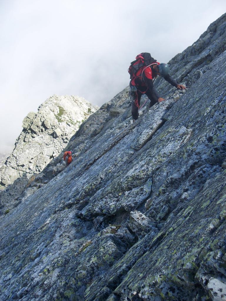 L11: seguire il diedro scalando le facili placche della faccia sinistra, fino ad uscire su una stretta forcella, 30 m, 2°, 3+°