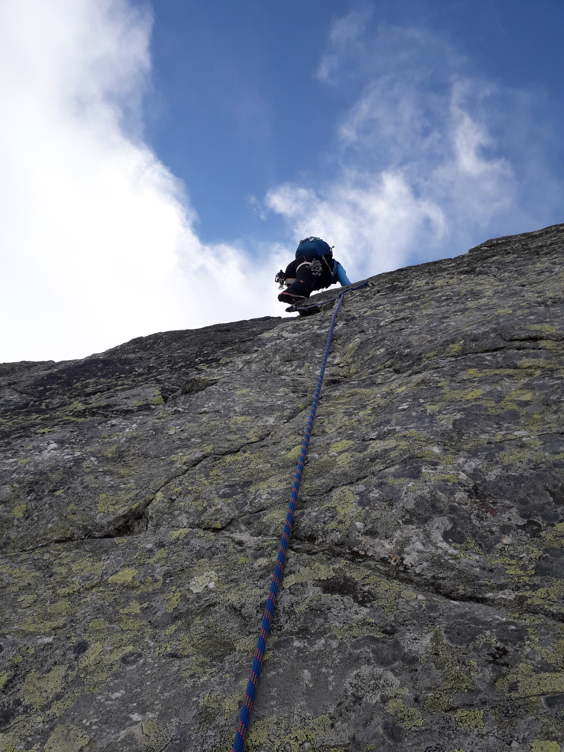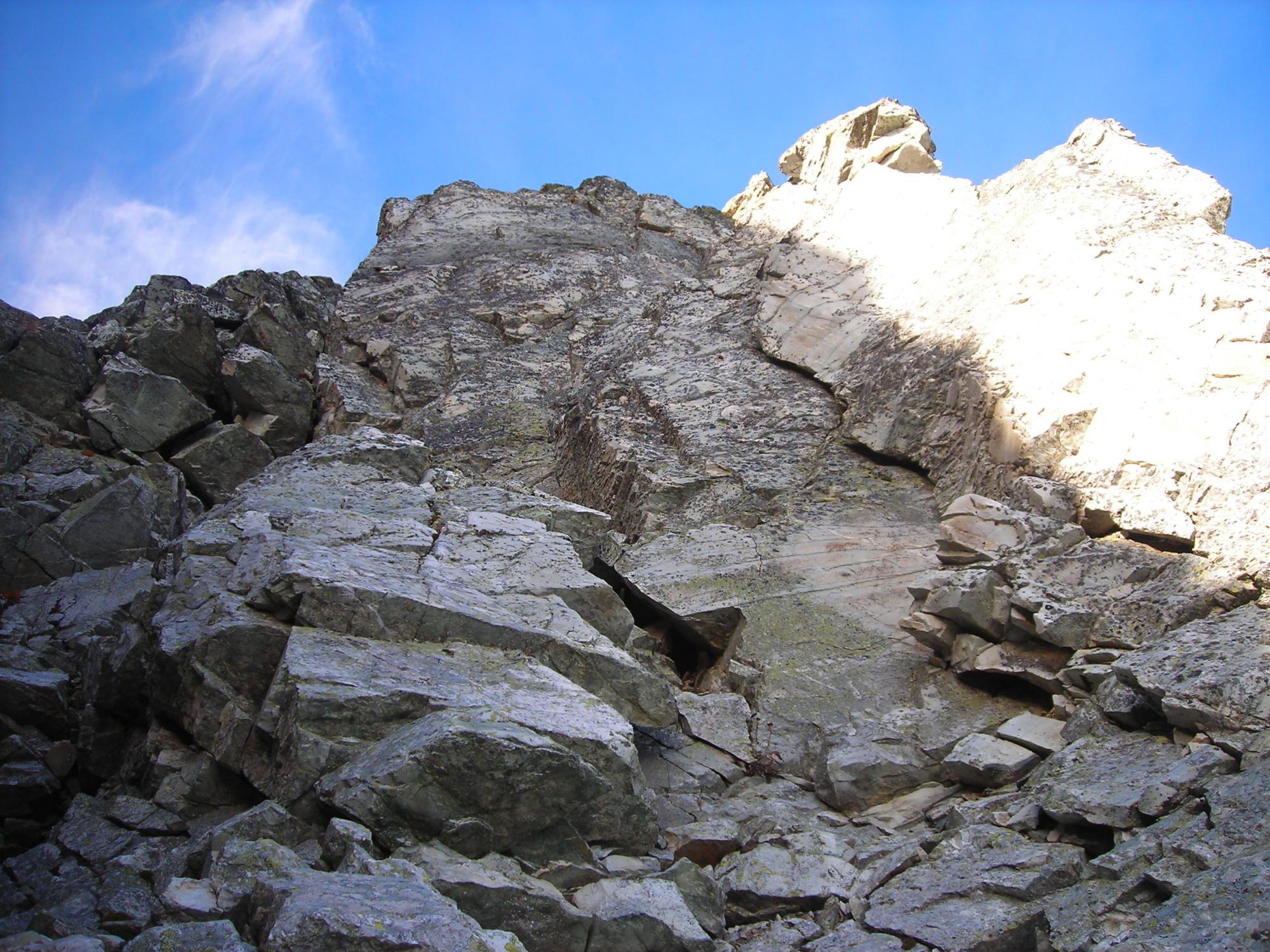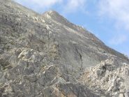 L4: senza percorso obbligato portarsi in conserva sulla sinistra alla base della parete nord, da qui individuare e salire sempre in conserva una evidente e facile cengia ascendente a destra, al termine della quale traversare a dx con breve discesa e risalita su detriti fino alla base della fessura a Y sotto le placche della parete nord, visibile già dall’uscita del dosso roccioso precedente