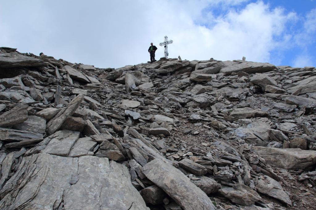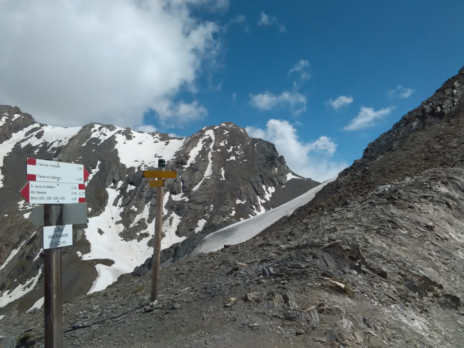 Da S. Anna di Bellino si segue inizialmente la stradina sterrata che in breve conduce alle Grange Cruset 1940 m, poco oltre le grange si incontra il primo bivio, dove si tralascia il sentiero che sale a destra (segnavia U26, con indicazioni per il Bivacco Boerio, Passo Fiutrusa e Passo Mongioia) e si prosegue lungo la stradina di sinistra (cartello indicatore per il Pian Ceiol, Colle di Bellino e Colle Autaret, segnavia U27 e U28). Si risale la ripida stradina sterrata, che conduce al grande pianoro erboso, noto come Pian Ceiol 2074 m. Tralasciando un sentiero che a destra porta nel Vallone Varaita di Rui, si segue il sentiero che con un semicerchio nel pianoro erboso volge a sinistra, verso l’inizio di una strettoia rocciosa, dove ha inizio il Vallone Autaret. Il sentiero, dopo aver attraversato il Rio Autaret su un ponticello in legno, inizia a salire lungo la strettoia rocciosa e si inoltra quindi nella Gola delle Barricate, che viene superata con una serie di svolte, raggiungendo uno spallone erboso a quota 2300 m. Si trascura un sentiero che a sinistra porta al Colletto Balma e si prosegue lungo il vallone principale su terreno erboso dove il sentiero sale con moderata salita, per poi raggiungere un altro ampio pianoro erboso dove si trovano le Grange dell’Autaret 2540 m. Nei pressi delle grange si trova un bivio, qui va tralasciato il sentiero con segnavia U28 e GTA che volge a sinistra (conduce al Colle di Bellino) e si prosegue volgendo decisamente a destra (cartello indicatore per il Colle Autaret, segnavia U27). Il sentiero risale tutto il vallone con una serie di serpentine fino a raggiungere un ampio dosso erboso, e da qui con evidente percorso si raggiunge il ben visibile Colle Autaret 2875 m (palina segnaletica). Dal colle si vede molto bene sia il Pelvo di Ciabrera che la restante parte del nostro itinerario di salita. Dal Colle, trascurata a destra la traccia che risale la cresta SO della Tete de l’Autaret, si deve seguire la traccia di sentiero che scende sul versante francese (Vallon de Chabrière) per un centinaio di metri di dislivello. Appena arrivati sotto uno speroncino roccioso, si tralascia la traccia di sentiero che scende verso Maljasset e si inizia a traversare a destra su pendii di pietrame non particolarmente faticoso, occorre però scegliere il giusto compromesso tra il mantenersi in quota e i passaggi meno pietrosi) puntando alla base del ripido versante SO del Pelvo di Ciabrera. Raggiunto il valloncello che culmina con il Passo di Ciabrera (che non si deve raggiungere), a circa 70 m di dislivello da questo, si punta verso sinistra al primo saltino roccioso, che si aggira a destra, iniziando la salita in una zona erbosa già ben visibile da lontano. Si risale la zona erbosa fino al termine, camminando tutto sommato comodamente, finchè questa lascia spazio a diverse tracce di sentiero di terriccio e ghiaia. Conviene mantenersi tendenzialmente a sinistra, per evitare la zona dei lastroni che si notano a destra, in questo modo si cammina sempre senza dover mai usare le mani (sentierino ripido ma niente di problematico). I numerosi ometti presenti facilitano la scelta del percorso migliore. Si passa al di sotto di uno sperone roccioso (unico punto quasi obbligato in cui passare), superato il quale appare a breve distanza la croce di vetta, visibile solo all’ultimo. Con terreno ora più comodo, si giunge alla croce senza più difficoltà. La vera cima è posta pochi metri più ad ovest, e si raggiunge con estrema facilità.