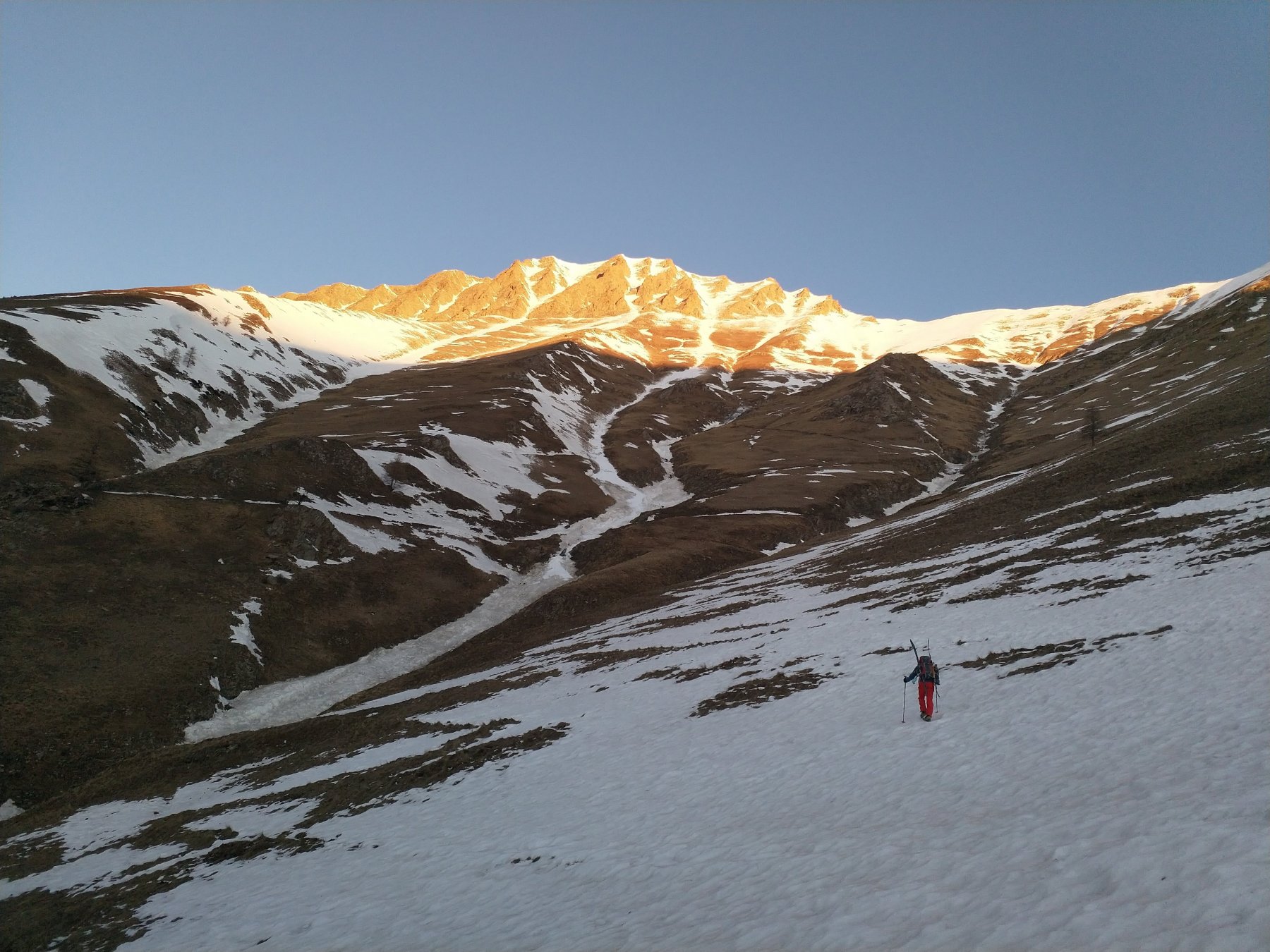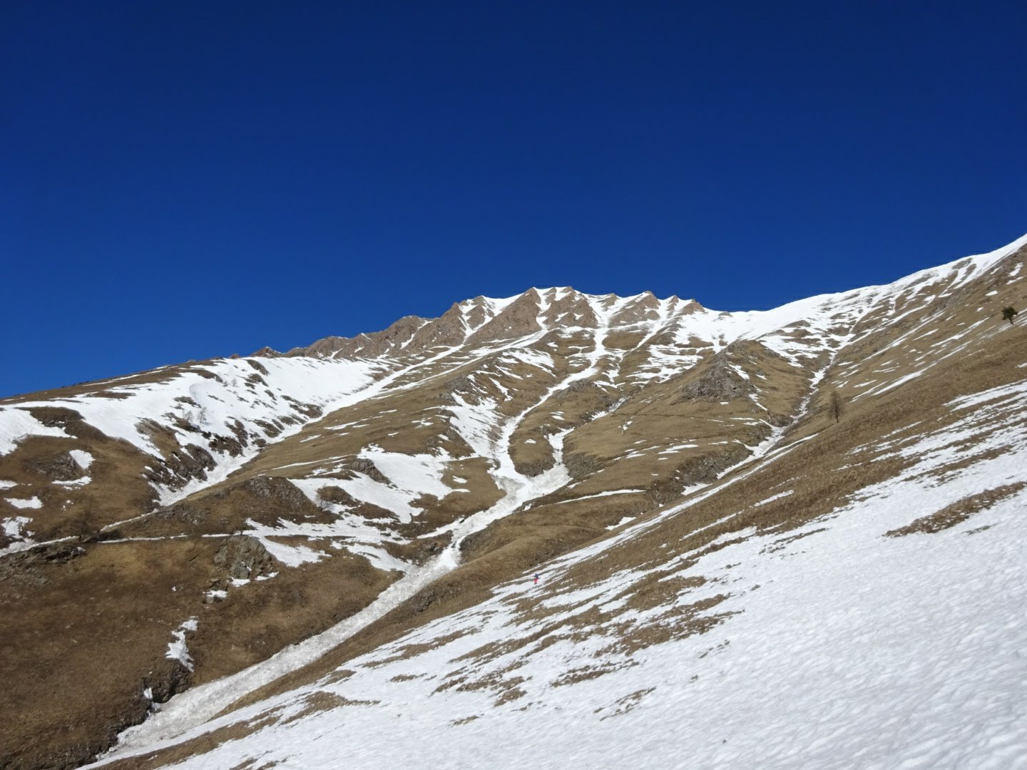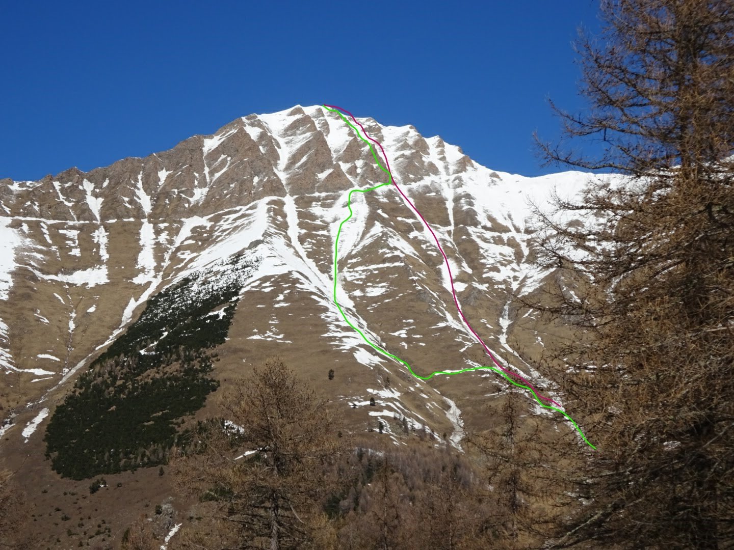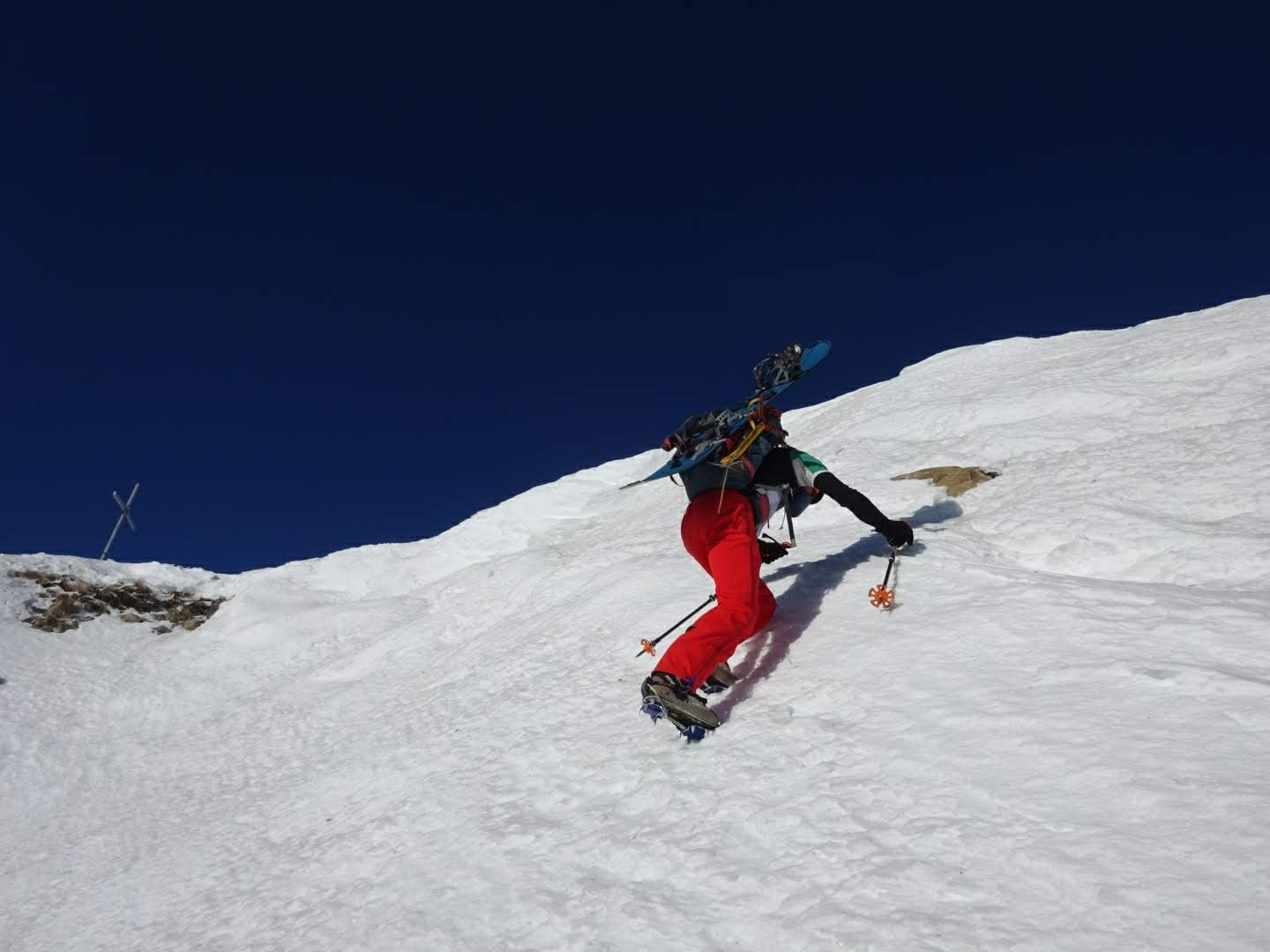 Giunti intorno ai 2400 metri di quota la pendenza aumenta e si deve puntare verso il secondo canale da destra della parete (gli altri canali sono molto più ripidi e interrotti da salti rocciosi). Entrati nel canale la pendenza aumenta ancora fino all’uscita proprio di fianco alla croce di vetta (50° gli ultimi 30 metri).