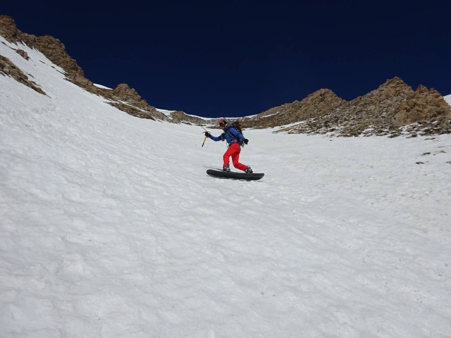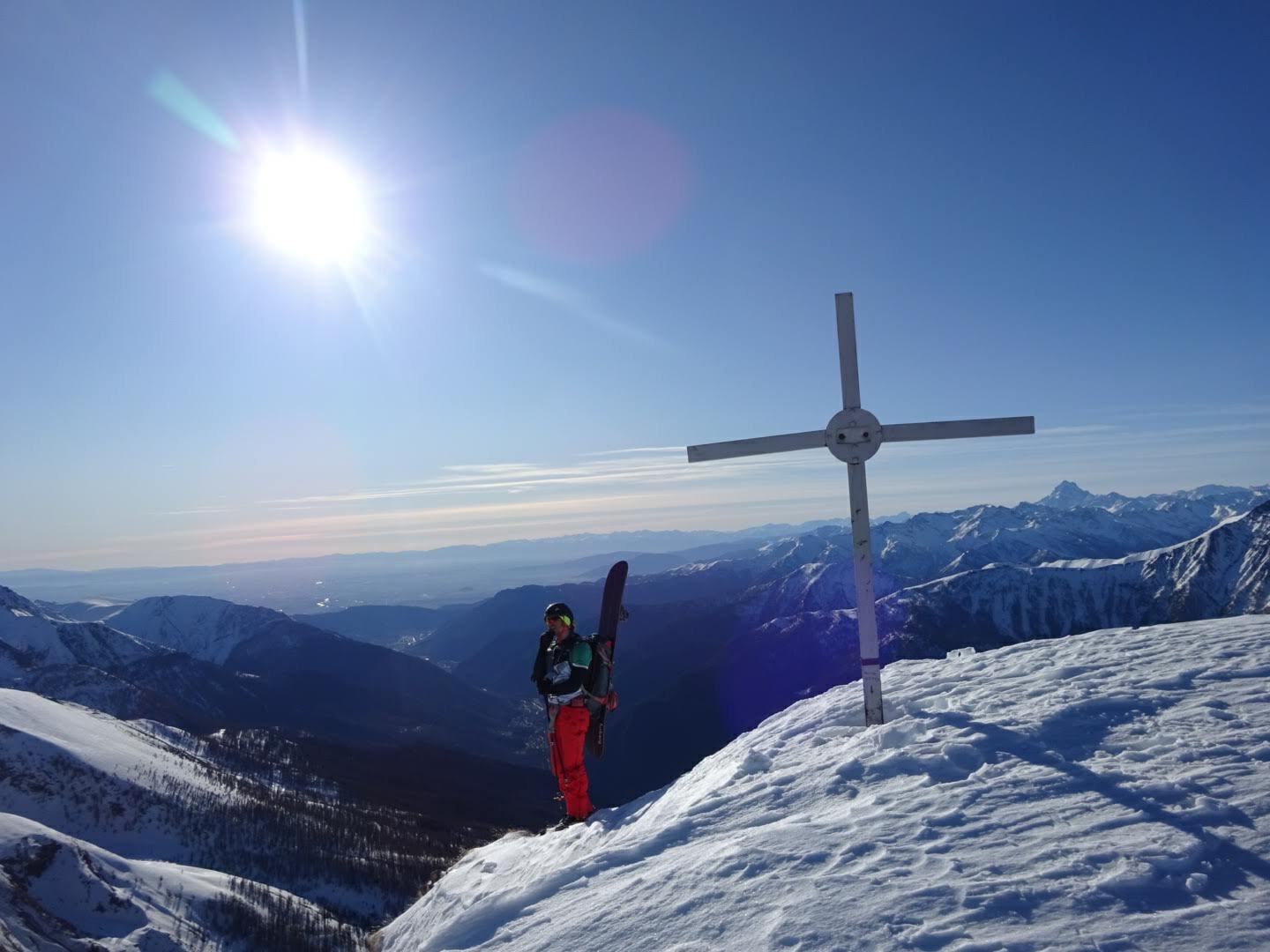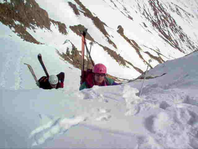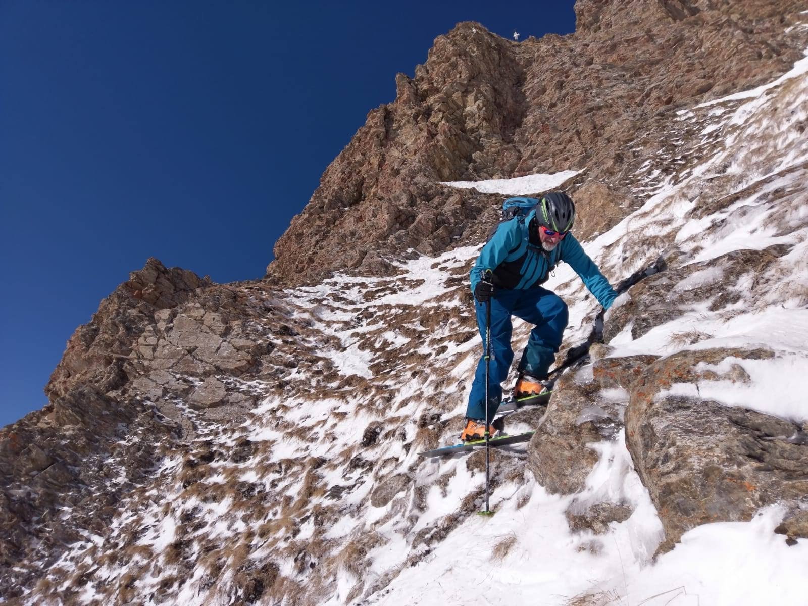 Giunti intorno ai 2400 metri di quota la pendenza aumenta e si deve puntare verso il secondo canale da destra della parete (gli altri canali sono molto più ripidi e interrotti da salti rocciosi). Entrati nel canale la pendenza aumenta ancora fino all’uscita proprio di fianco alla croce di vetta (50° gli ultimi 30 metri).